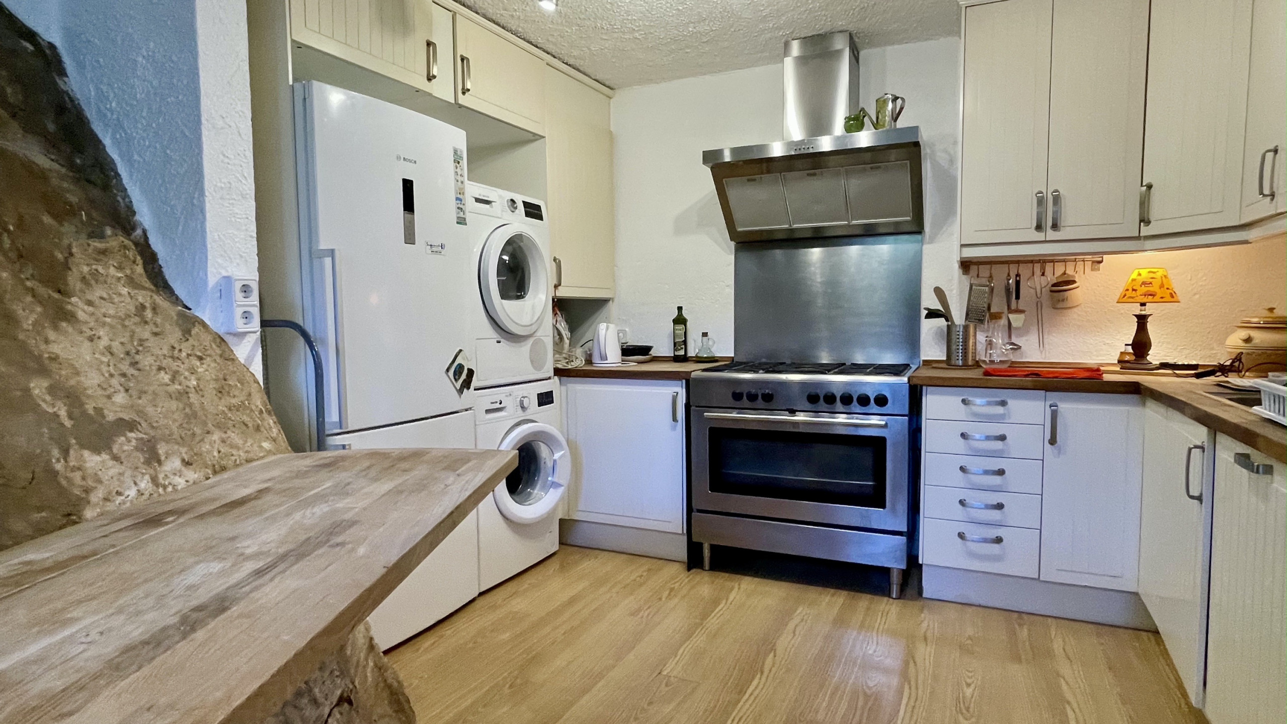 Geniet van het grote terras, ideaal om te ontspannen in de schemering of om buiten te eten met de barbecue. Binnen nodigt een gezellige woonkamer met open haard u uit om even tot rust te komen, terwijl u in de volledig uitgeruste keuken heerlijke recepten kunt bereiden met lokale producten.