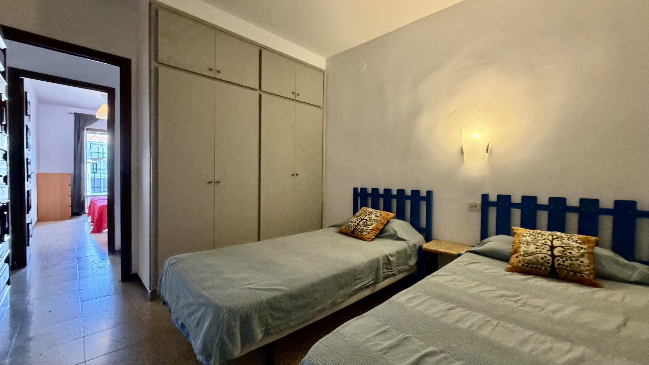 El apartamento cuenta con 3 dormitorios equipados con 5 camas: 1 cama doble y 4 camas individuales, ideal para grupos que buscan flexibilidad en el descanso. Dispone de un completo baño con bañera, perfecto para relajarse después de un día de playa.