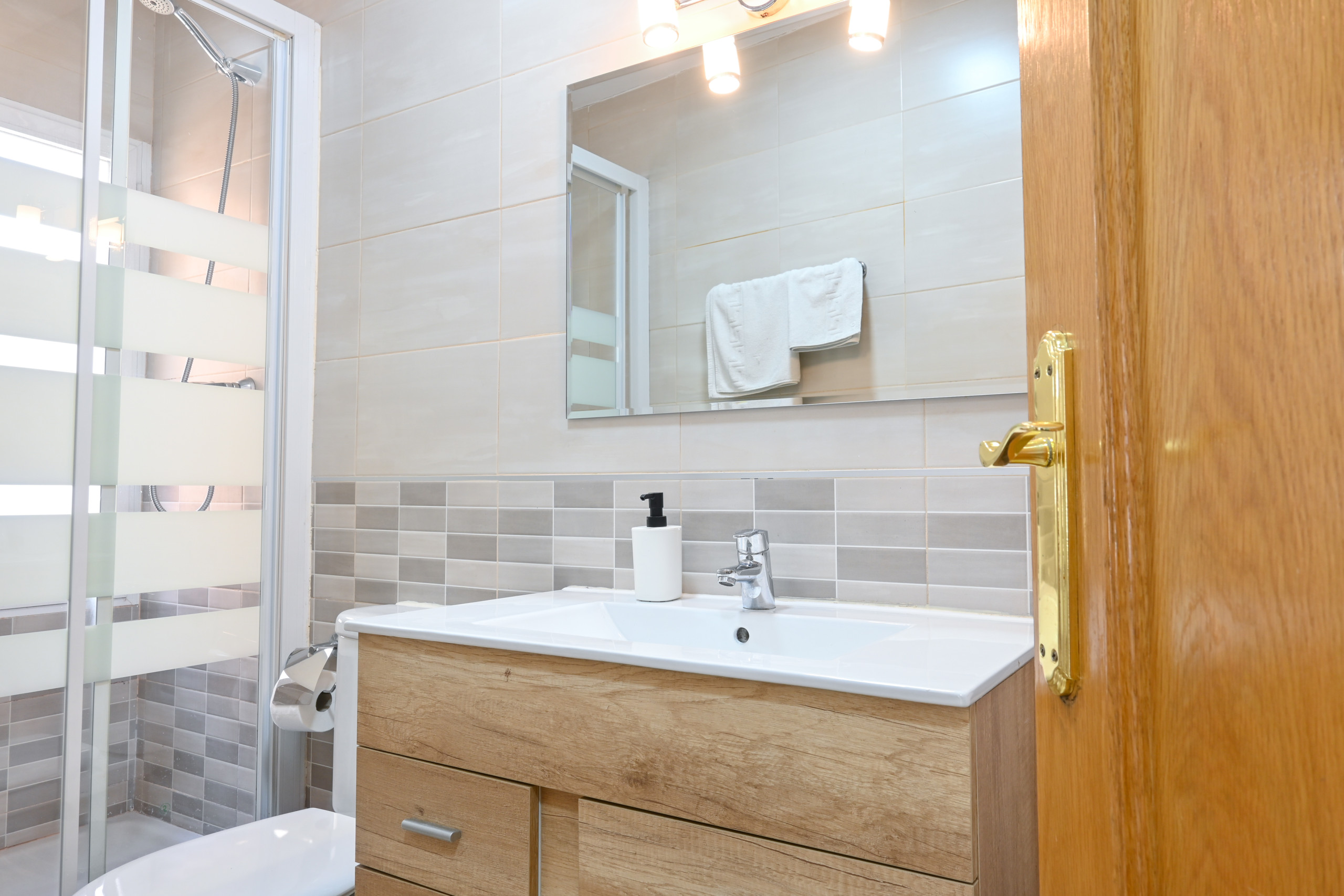 El baño cuenta con un plato de ducha amplio y todas las comodidades necesarias para tu higiene diaria.