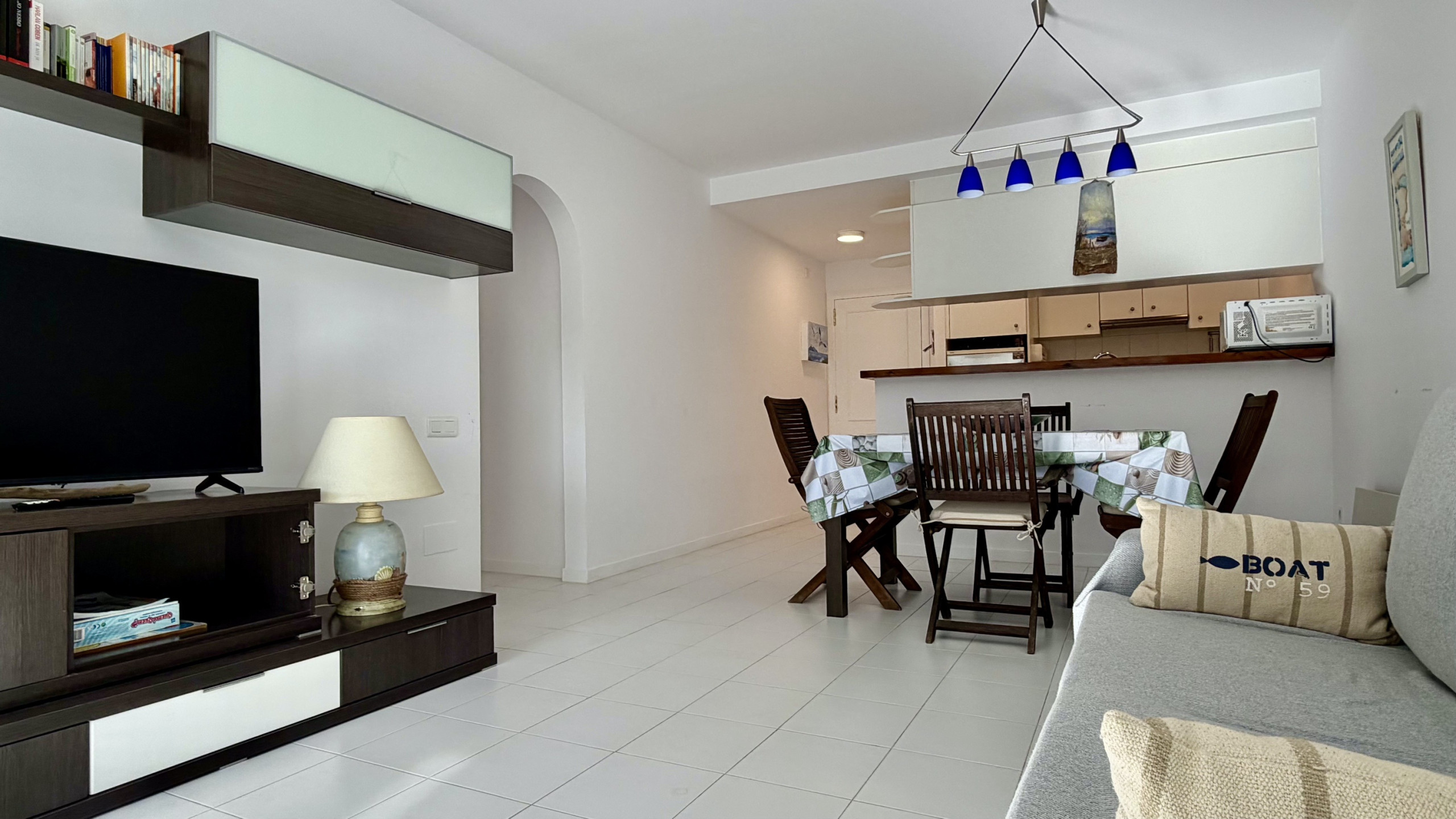 La cocina americana, con vitrocerámica, está equipada con nevera, microondas, horno, congelador, lavadora, lavavajillas, vajilla, cubiertos, utensilios de cocina y cafetera.