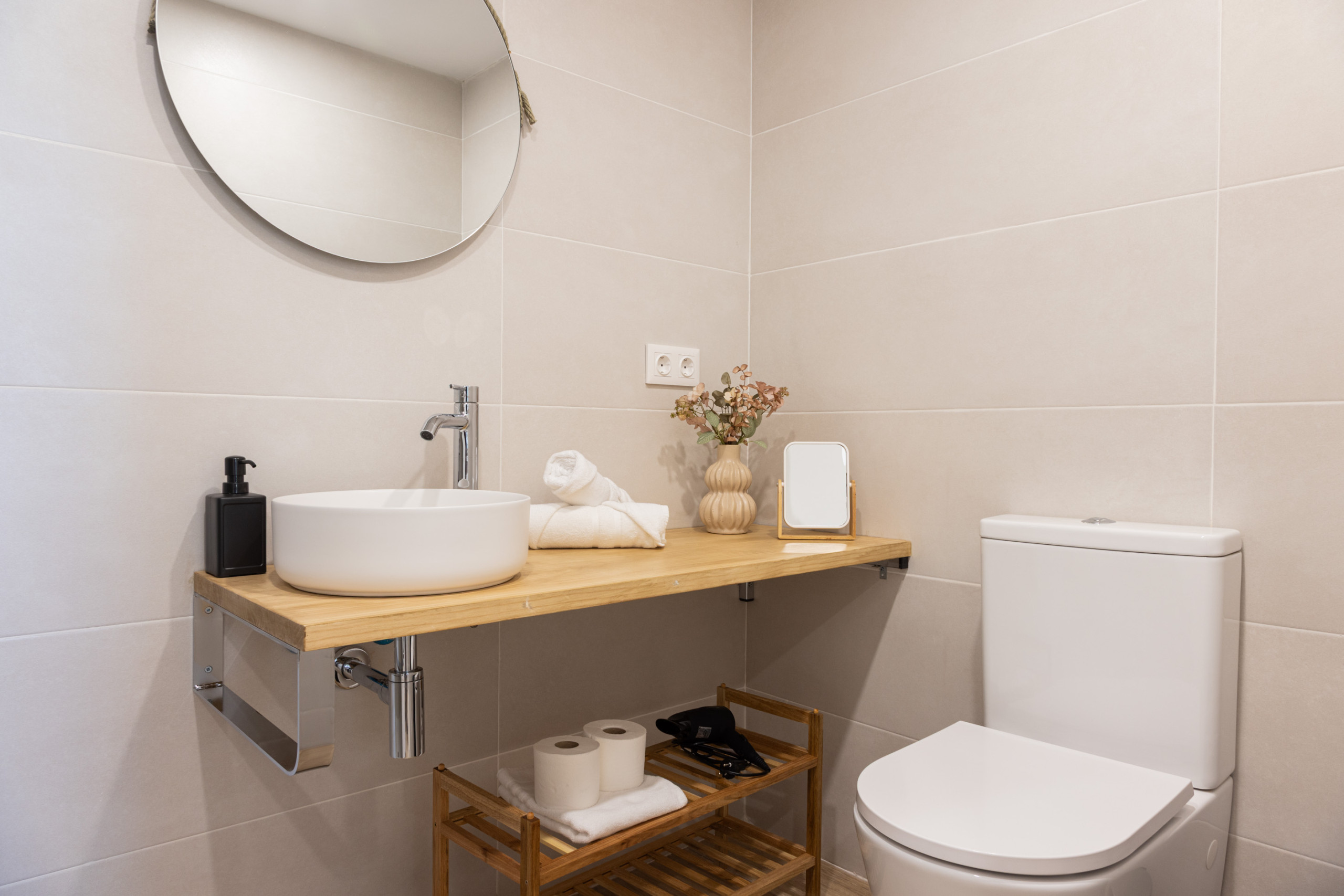 El baño moderno, con su amplia ducha de estilo lluvia, está equipado con jabón y champú de alta calidad, aportando un toque de lujo y bienestar que harán de tu rutina un momento de relajación.