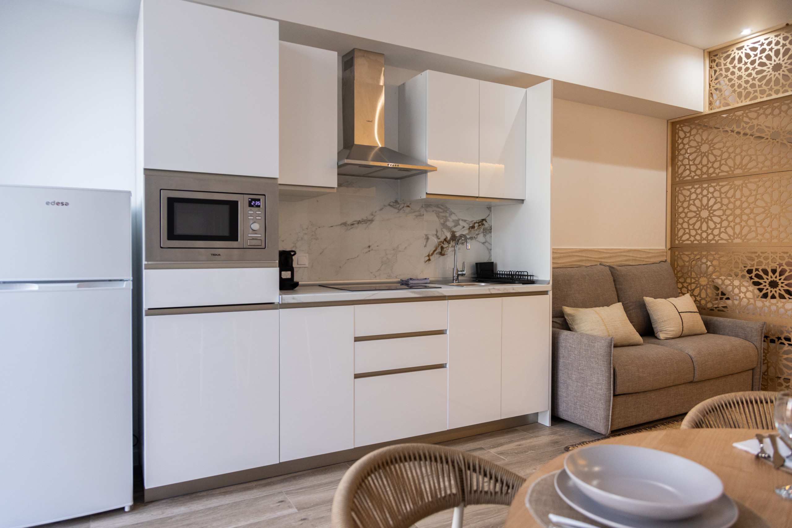 Todos los apartamentos han sido diseñados para ofrecer funcionalidad y confort. Disponen de una cómoda cama doble y un sofá cama con capacidad para dos personas, lo que los convierte en una opción perfecta tanto para parejas como para familias o pequeños grupos. Cada alojamiento cuenta con cocina totalmente equipada, ideal para preparar desayunos tranquilos o comidas caseras durante la estancia, y un baño completo con ducha, moderno y práctico.
