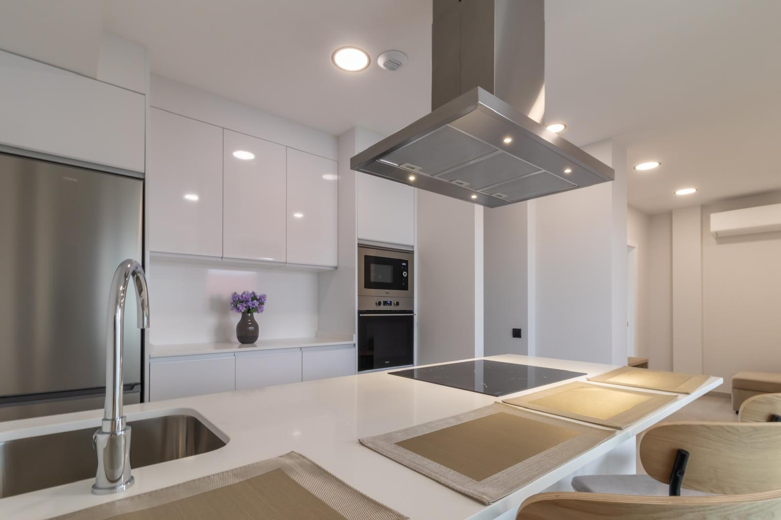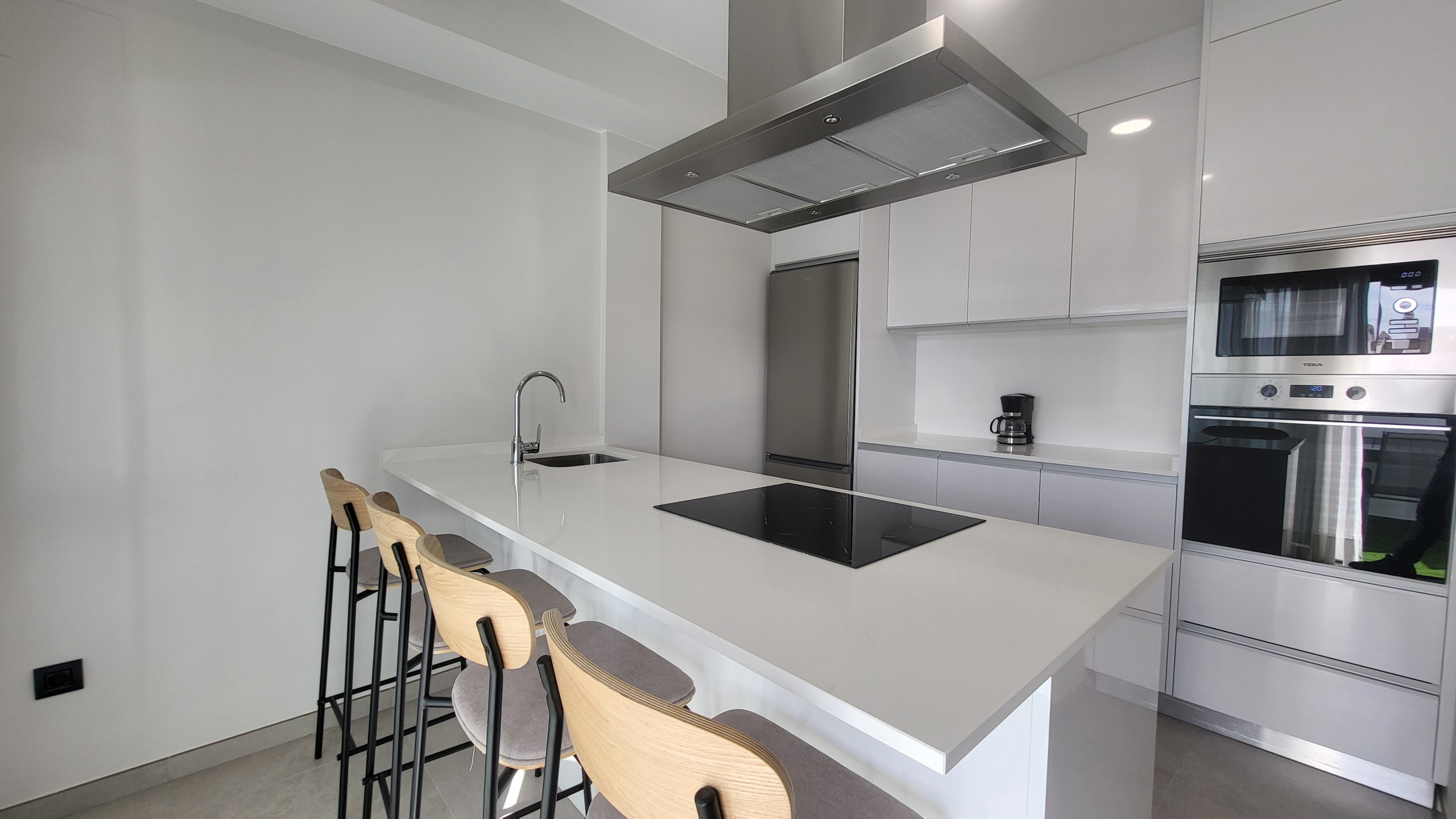 El salón es acogedor y cuenta con una zona de comedor, televisión inteligente con canales por satélite y sofá para relajarte. El aire acondicionado y la bomba de calor garantizan una temperatura perfecta durante todo el año. Además, el apartamento ofrece WiFi de alta velocidad y está diseñado para ser amigable con dispositivos electrónicos.