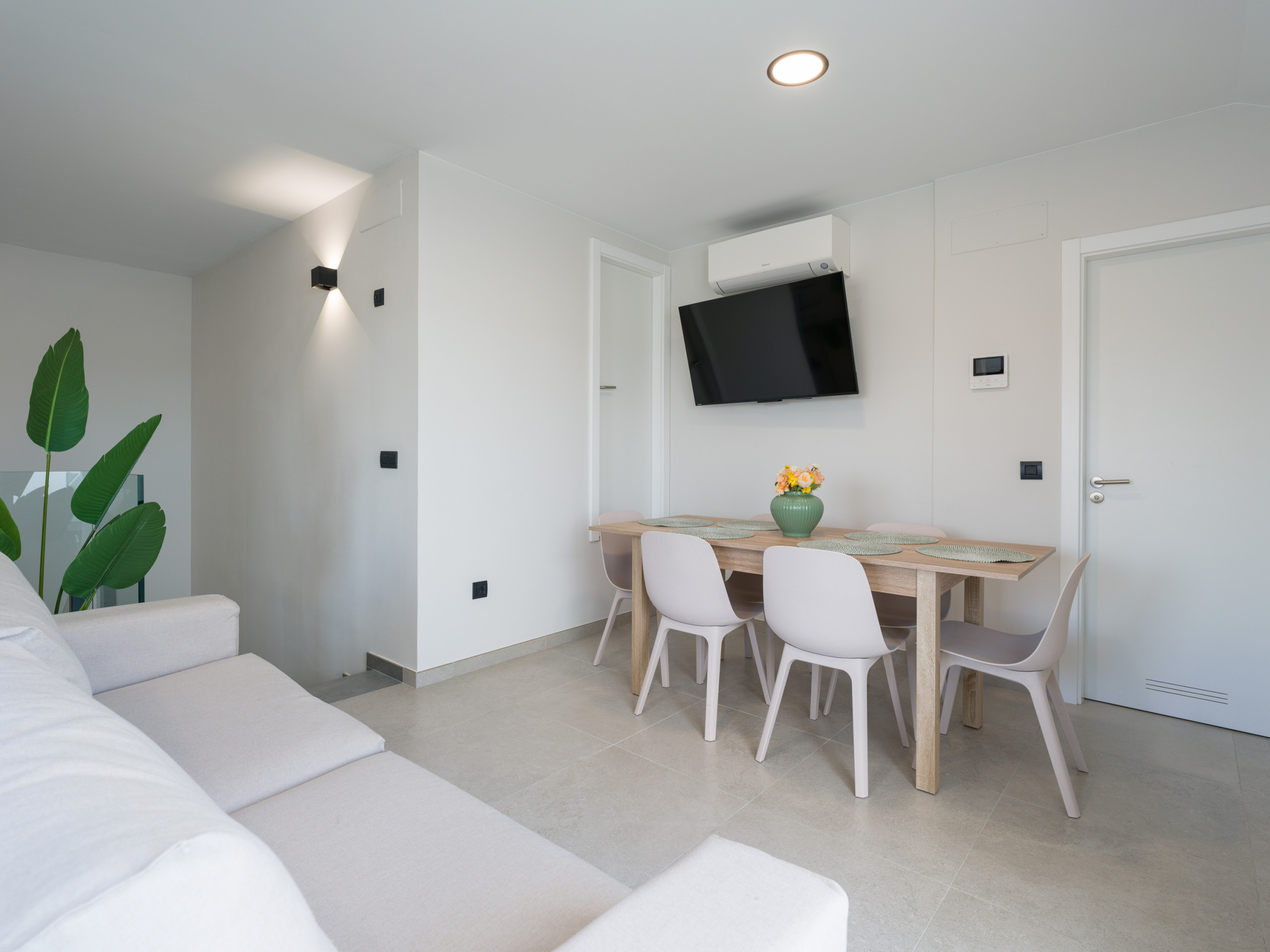La cocina americana, moderna y totalmente equipada, incluye lavadora, secadora, lavavajillas, horno, microondas y cafetera, además de todos los utensilios necesarios para preparar comidas en familia. El salón es acogedor y cuenta con aire acondicionado, además de calefacción por bomba de calor, garantizando una temperatura agradable durante todo el año. El alojamiento dispone también de conexión WiFi de alta velocidad.