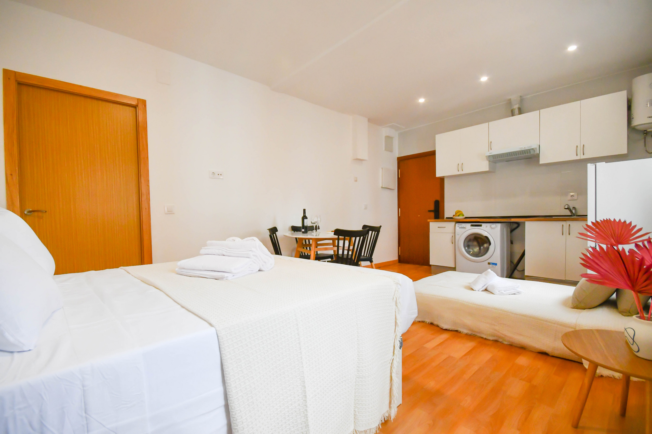 Este apartamento tipo estudio está recién reformado ha sido decorado con estilo y elegancia. Dispone de una cama de matrimonio y un sofá cama individual, así como una cocina con todo el equipamiento necesario para que tu estancia sea cómoda. Cuenta además con un baño con plato de ducha