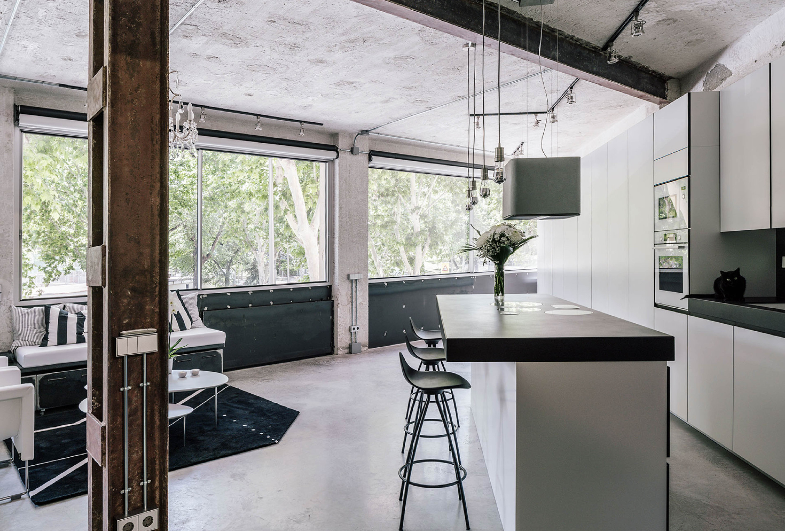 La cocina está integrada al salón, siguiendo el concepto de espacio abierto. Una isla central sirve tanto como área de trabajo en la cocina como barra para comer, con muebles de diseño minimalista que combinan estructuras de hierro negro y superficies de madera, creando una continuidad visual con el salón.