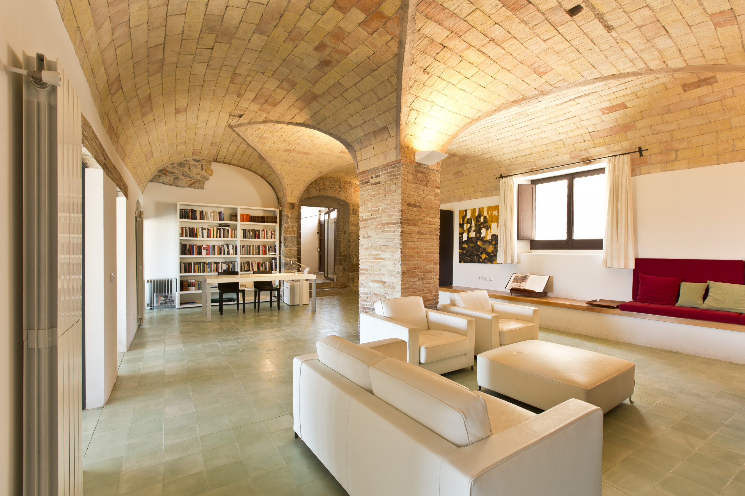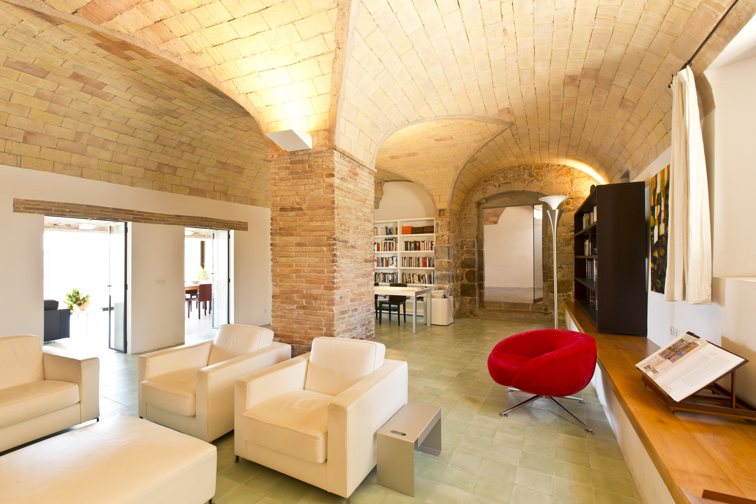 En la planta baja de acceso, se encuentra un gran recibidor con el techo de vuelta catalana y suelos de piedra natural, que da acceso a una sala de televisión y estudio-biblioteca con una doble vuelta catalana de cañón con un pilar central de ladrillo macizo y suelos cerámicos. Desde éste salón se accede a una sala de juegos con una mesa de billar y vuelta catalana y suelos de piedra y a otro salón de estar con una gran mesa extensible para 8-12 personas. En este salón también se encuentran 2 butacas y una chaise-longe de Le Corbusier para hacer la siesta o leer un buen libro. Éste salón comunica con el jardín mediante un gran ventanal acristalado con 2 grandes correderas de acero cortén que transforman ésta sala en semi-exterior y con una relación directa con la terraza y el jardín. Ésta sala dispone de cortinas automáticas y aire acondicionado y un toldo exterior. Al salir al exterior nos encontramos con una amplia terraza que comunica con el jardín situado a un nivel inferior al que se accede mediante una gran escalinta de ladrillo. Desde la terraza y el jardín se disfruta de las vistas paronámicas del macizo del Montgrí a la derecha y el pueblo pescador de L’Escala a la izquierda. En esta planta hay una zona de servicio con un baño completo, 2 duchas y zona de lavadero.