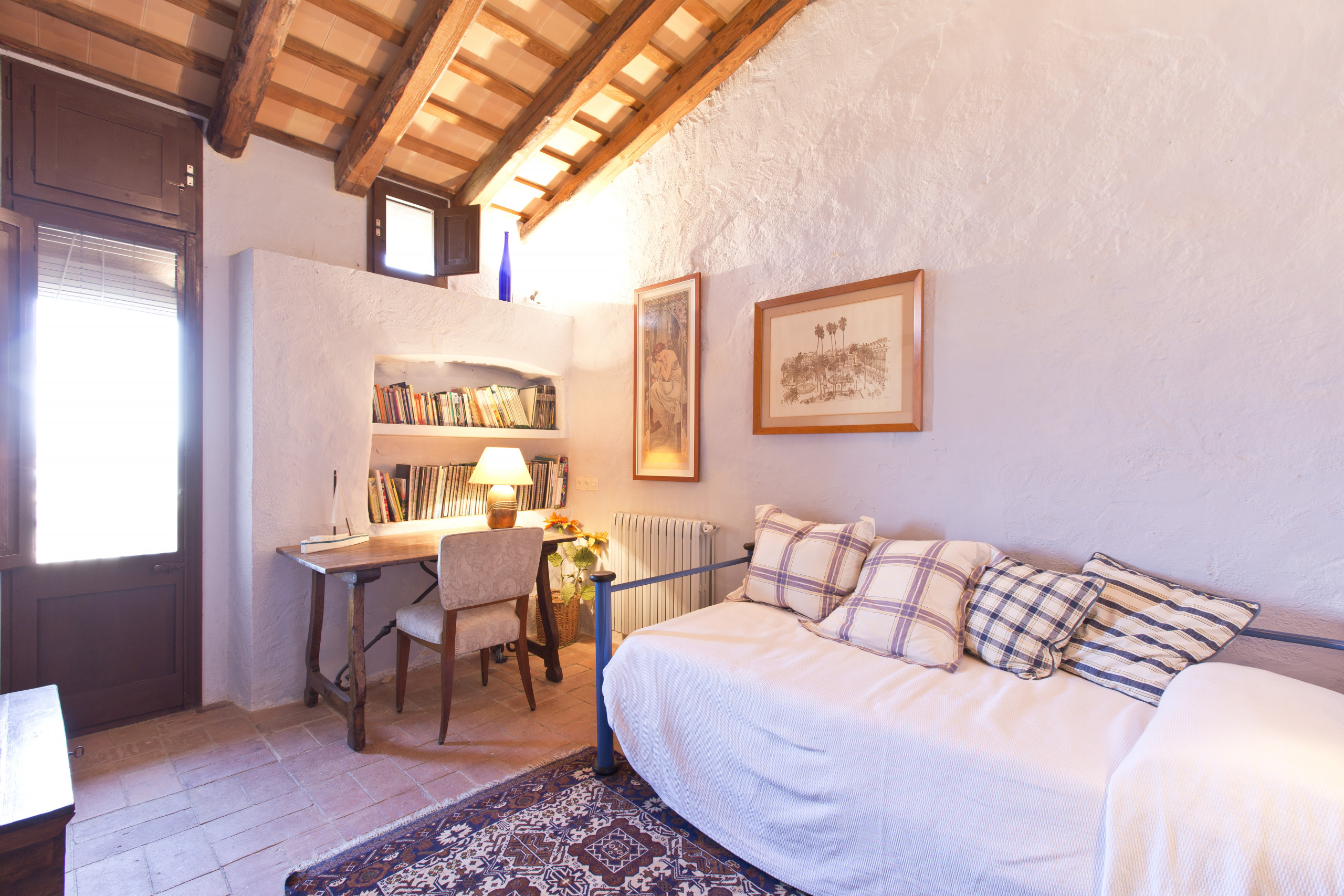 Desde el recibidor de acceso, se sube mediante una escalera de piedra a la planta primera donde se encuentran 4 habitaciones dobles con aire acondicionado, 1 dormitorio infantil con 2 camas individuales y un altillo y que dispone de un ventilador, 2 baños completos con bañera, la cocina con una mesa rústica de madera, una despensa y un gran salón comedor. En esta planta se mantienen en algunas zonas el pavimento de baldosa cerámica original y el techo de madera de bigas de madera y cubierta inclinada. Desde todas las estancias de la casa se disfrutan de vistas hacia el jardín mediante balconeras o al castillo medieval. La sala de estar y comedor tiene una gran chimenea abierta con sofás y TV. También encontramos una larga mesa de madera para 12 personas, una alacena con una mesa redonda con 2 sillas de juego y aire acondicionado. Desde este salón se accede a una terraza de madera ideal para el desayuno o cenar y comer con vistas al jardín y a las torres del castillo.