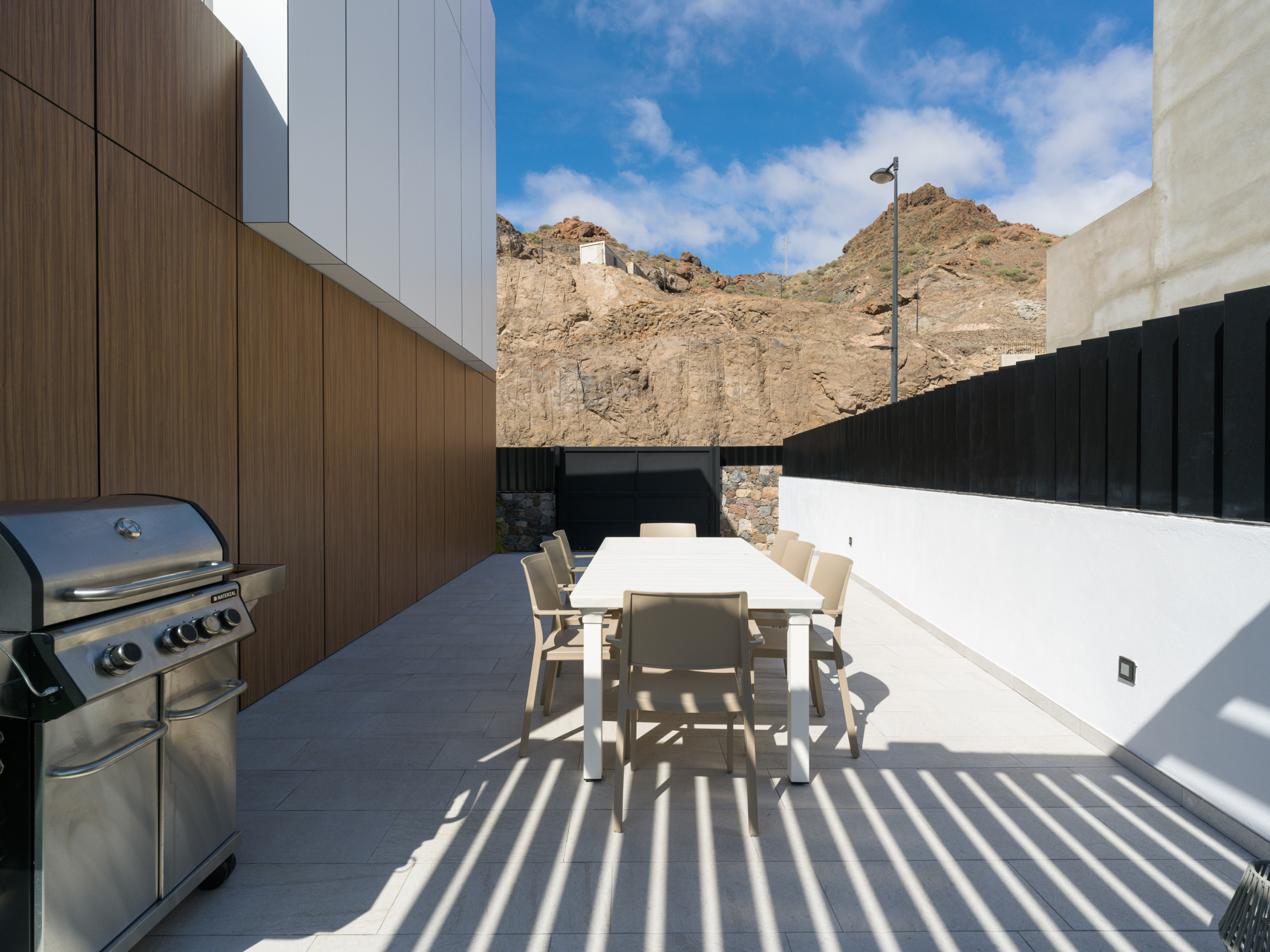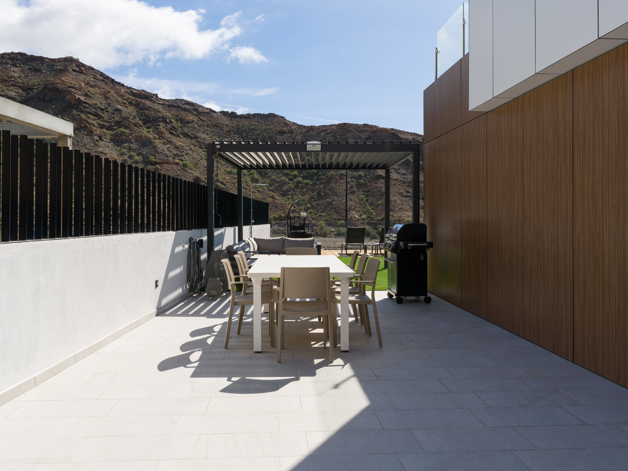 El exterior es uno de los grandes atractivos de la villa. El perímetro completamente vallado aporta privacidad y tranquilidad, mientras que la zona exterior invita a disfrutar del aire libre con una piscina privada climatizada, tumbonas, ducha exterior, barbacoa de gas, zona de sofá a la sombra y comedor exterior, ideales para relajarse y aprovechar el clima soleado durante todo el día.
