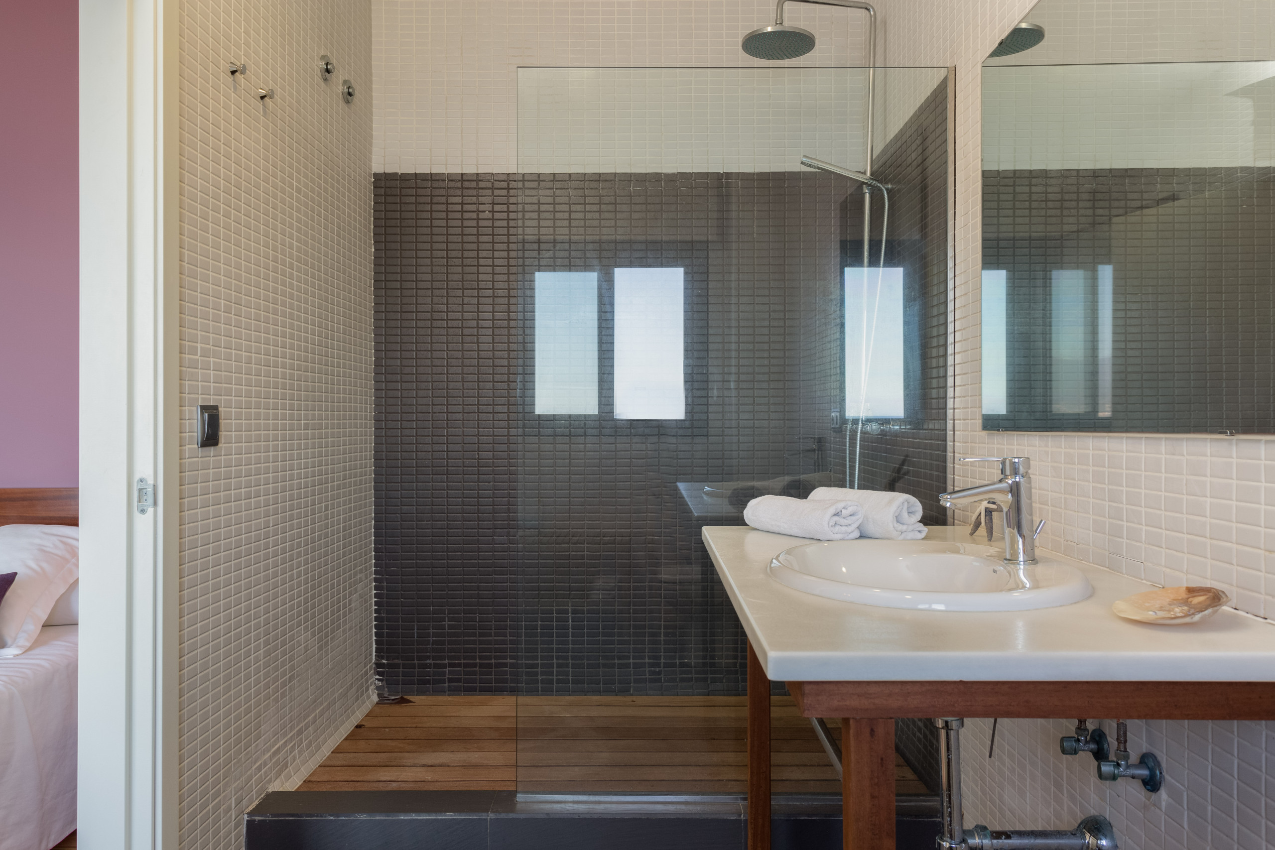 En la planta superior encontramos las 4 habitaciones dobles, 3 de ellas prácticamente "colgadas sobre el mar". Los 4 dormitorios cuentan con baño completo propio en suite, 3 de ellos con cama de matrimonio y uno con dos camas. Todos ellos tienen acceso directo a la terraza de la planta superior que también comunica con la terraza inferior donde se encuentra la piscina.