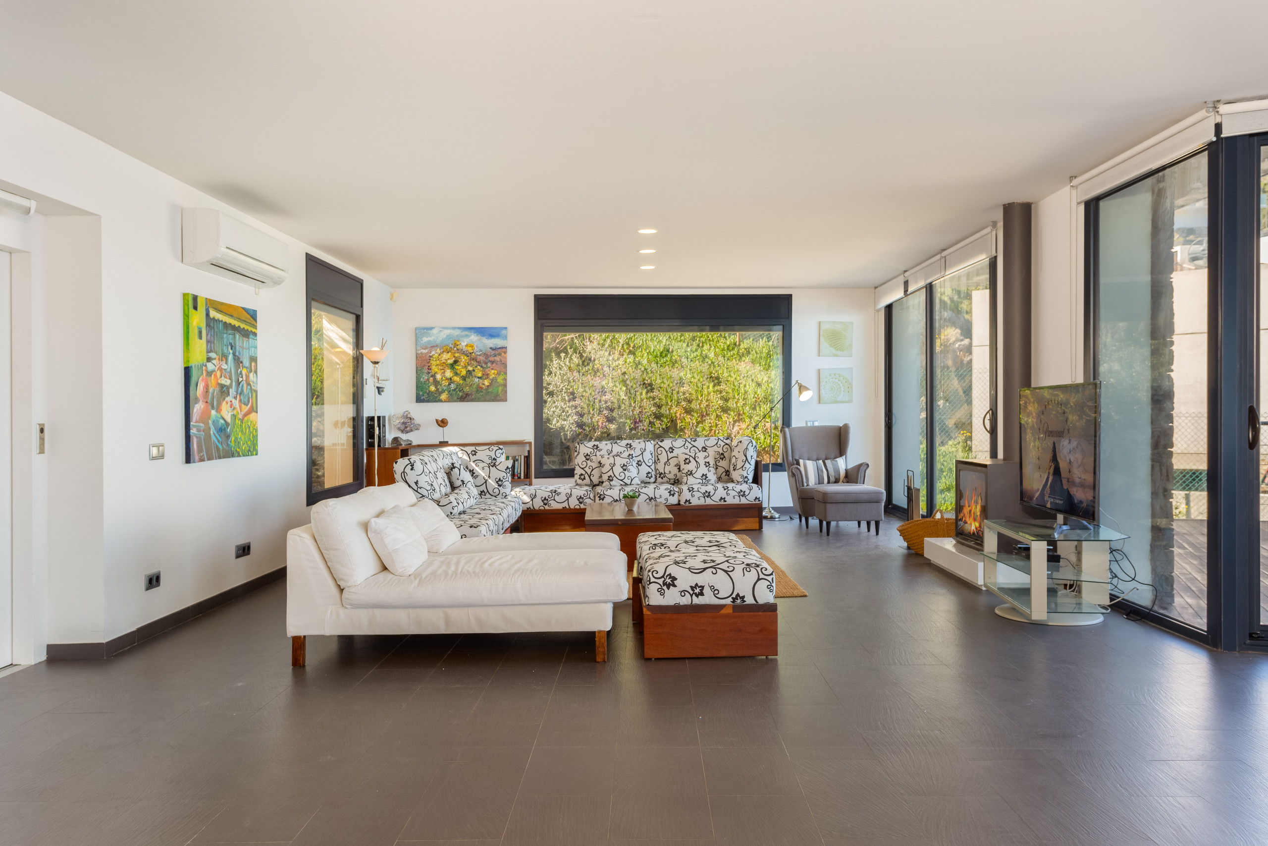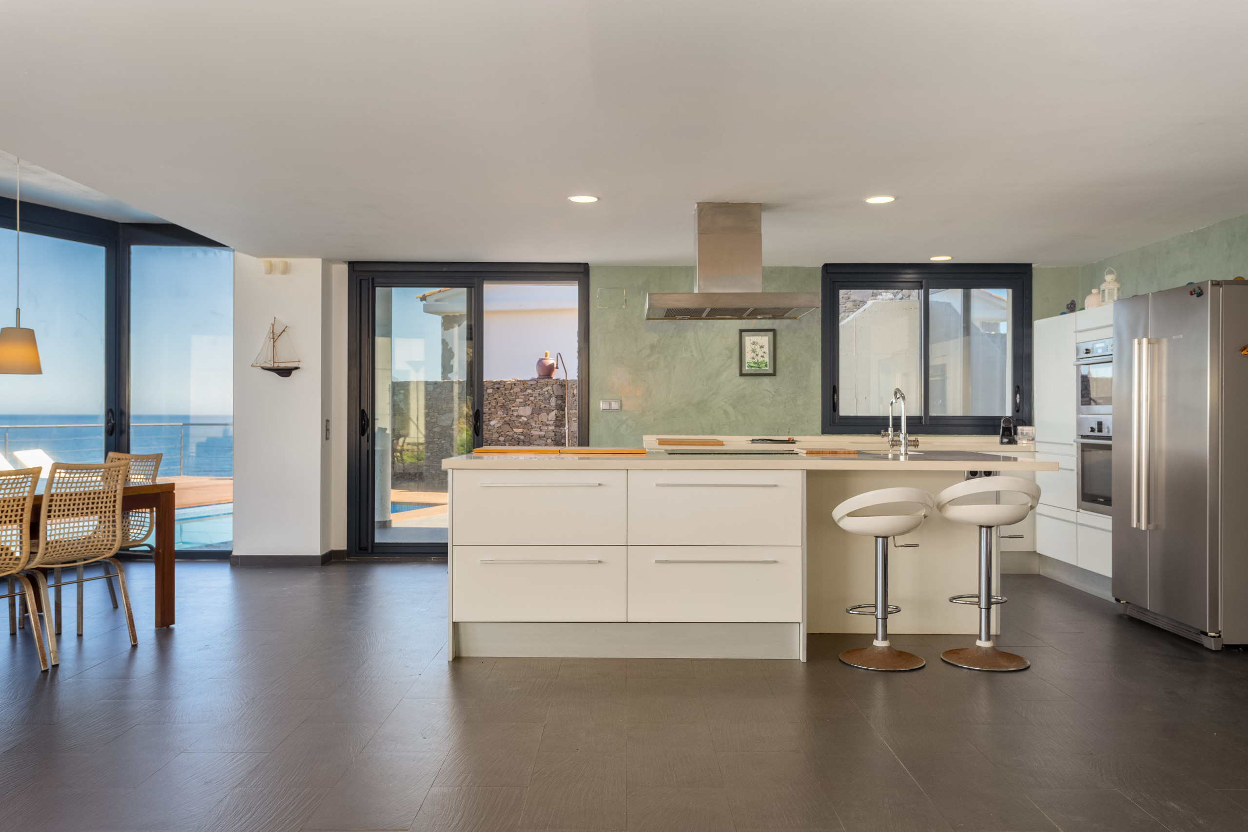 Preciosa vivienda distribuida en dos plantas conectadas por ascensor desde el garaje. En la planta principal nos recibe un impresionante salón comedor, con una completa cocina abierta y paredes de cristal con solamente el mar como maravillosa vista. Amplio sofá, hoguera, mesa para todos los comensales y todo lo necesario para disfrutar cómodamente de la estancia. Los ventanales dan acceso directa a la zona exterior, una acogedora terraza con vistas, provista de dos espacios para comer, uno más recogido, ideal para el desayuno y otro con una amplia mesa para varios comensales que nos llama a compartir agradables cenas con magníficas puestas de sol. Una espectacular piscina con tumbonas y una zona de sofás.