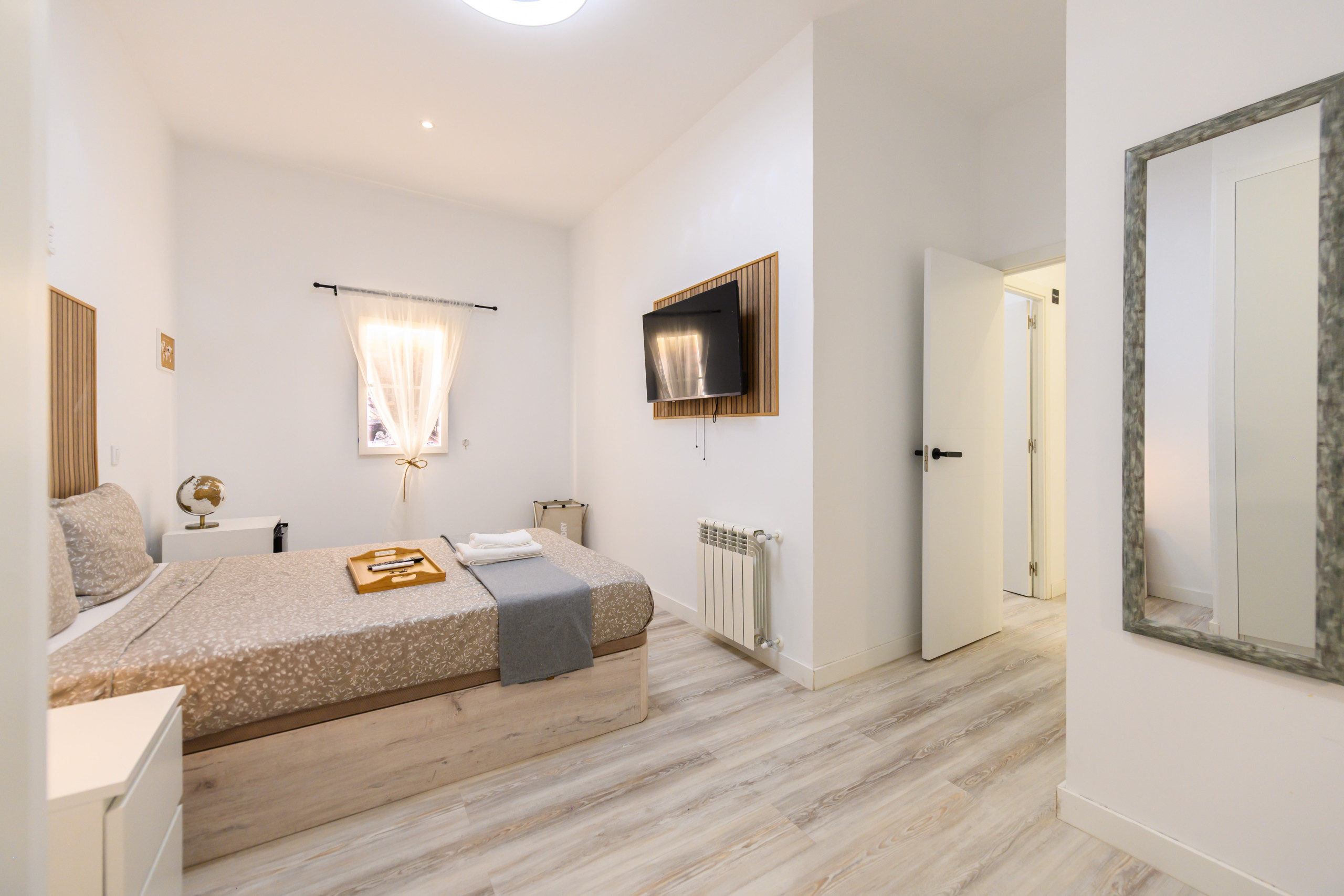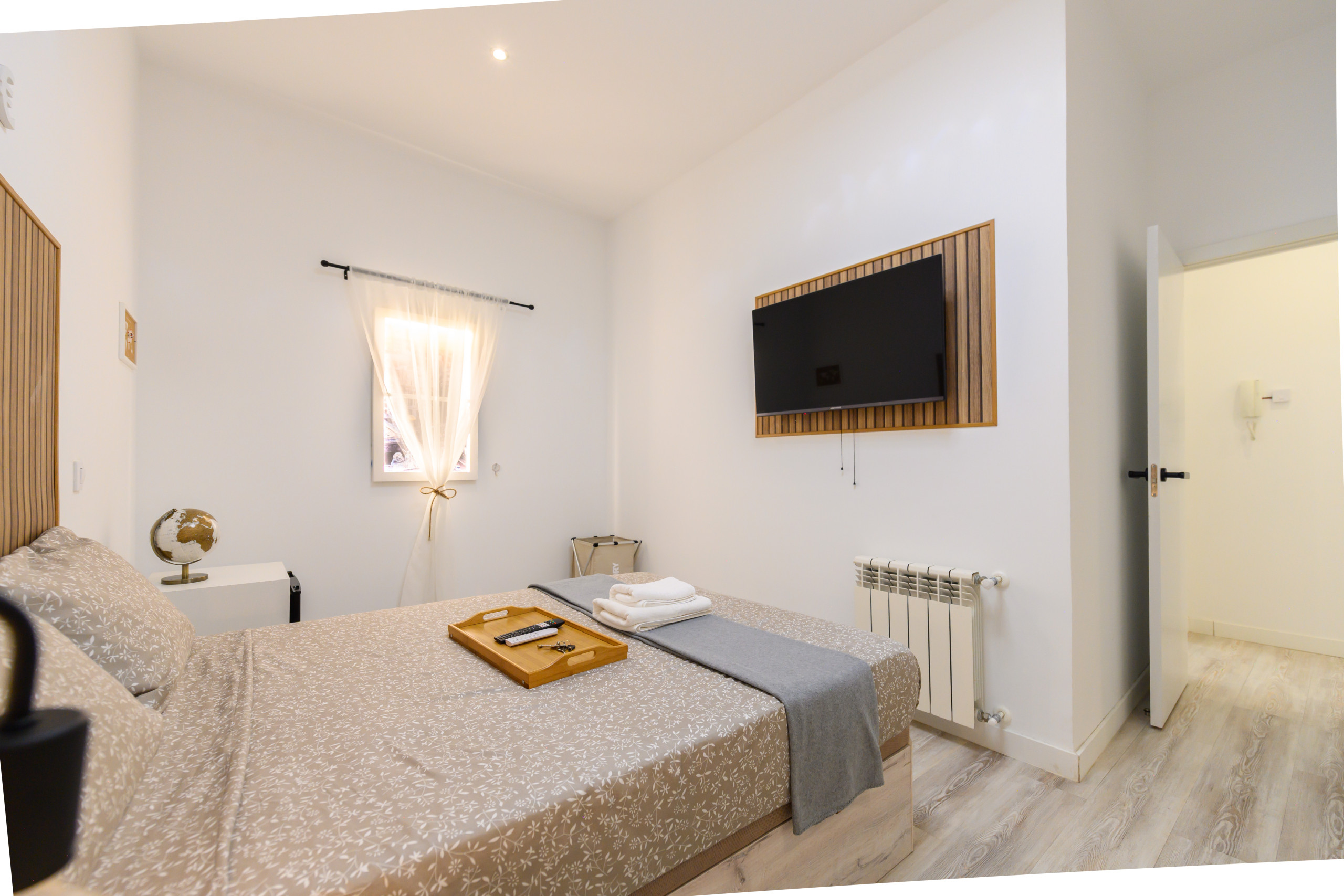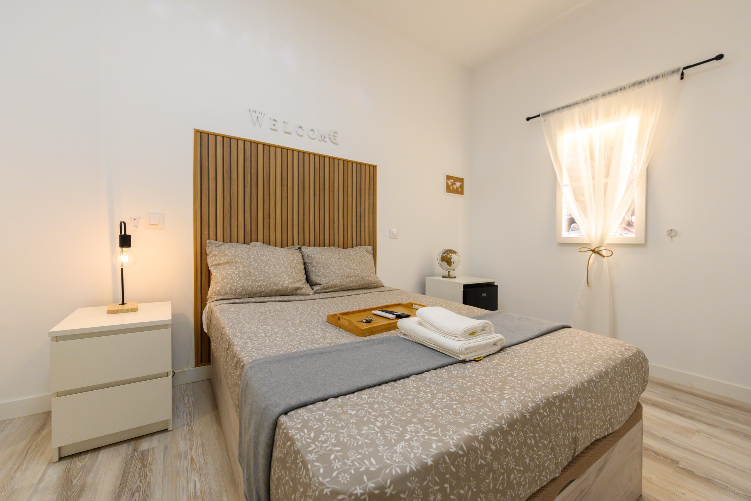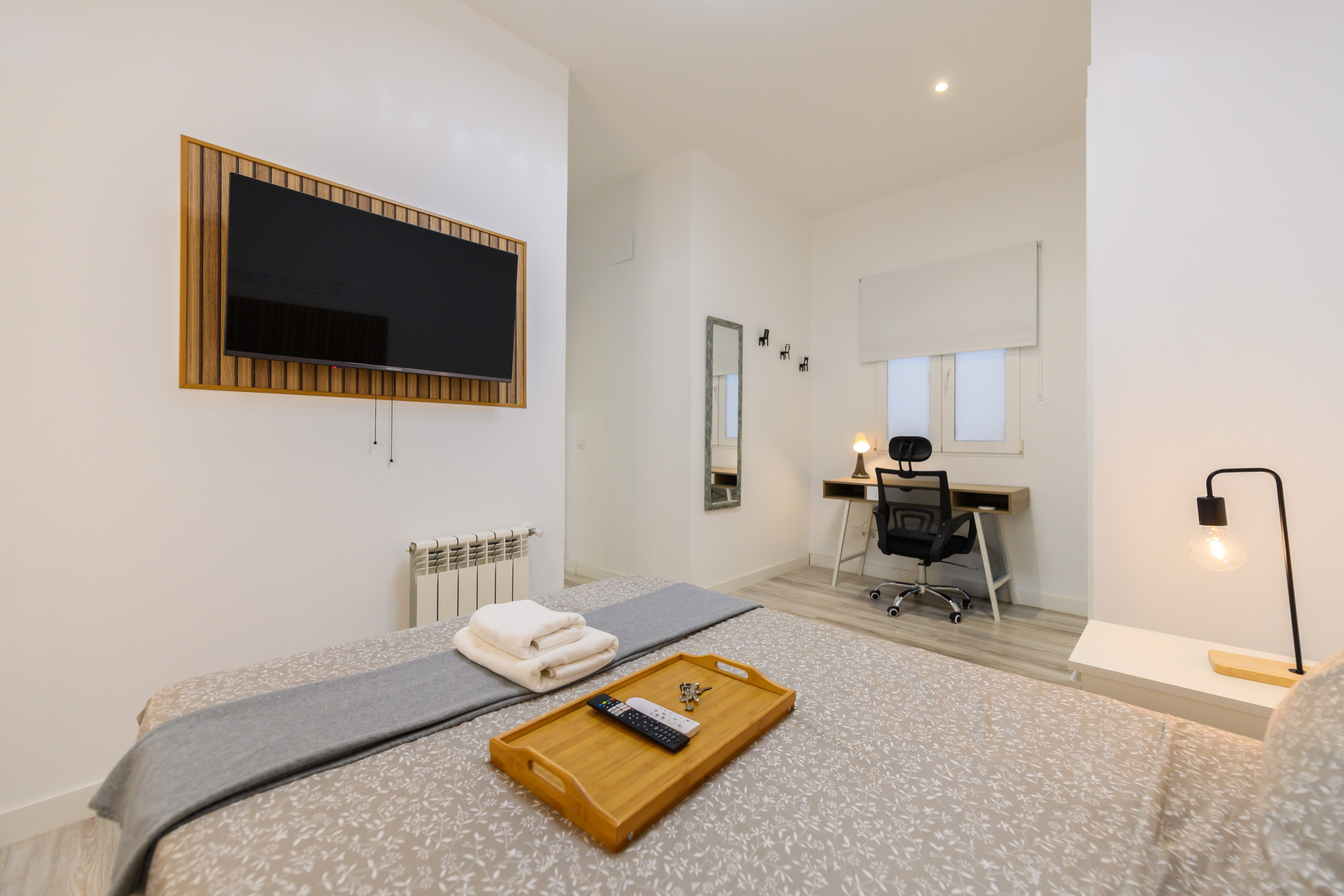 Chambre 8 – Rome : Chambre de charme. Elle dispose de tous les conforts, de son lit avec un matelas premium, coffre de rangement, bureau + chaise, jusqu'à la smart TV, la climatisation, le coffre-fort, fer à repasser + planche, chargeur sans fil, serrure intelligente, 2 jeux de serviettes et draps.