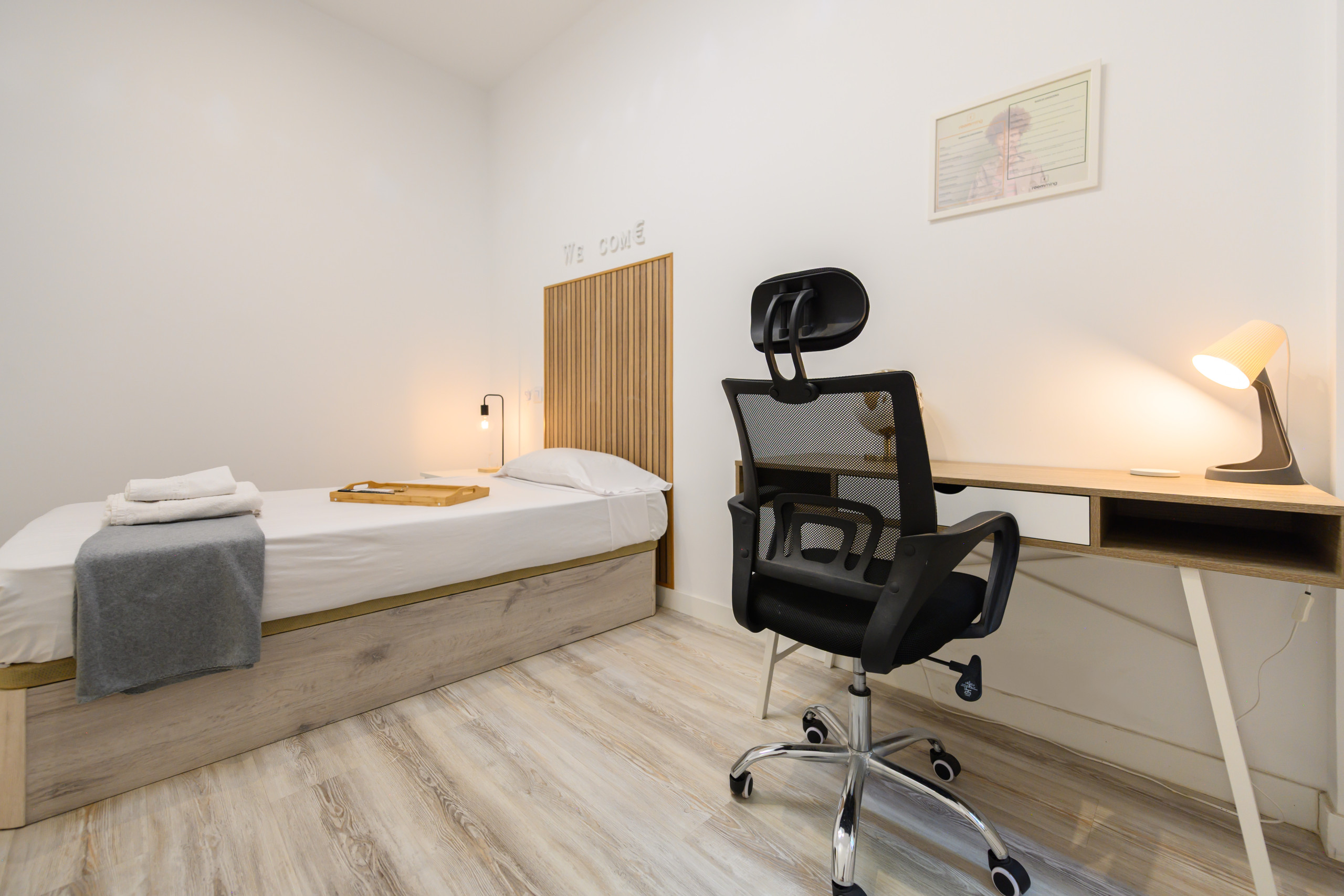 Chambre 7 – Shanghai : Chambre calme. Située stratégiquement avec vue sur des espaces communs réputés. Dispose de tous les conforts, depuis le lit avec un matelas premium, canapé avec grand rangement, bureau + chaise, jusqu'à la smart TV, la climatisation, le coffre-fort, fer à repasser + planche, chargeur sans fil, serrure intelligente, 2 jeux de serviettes et draps.