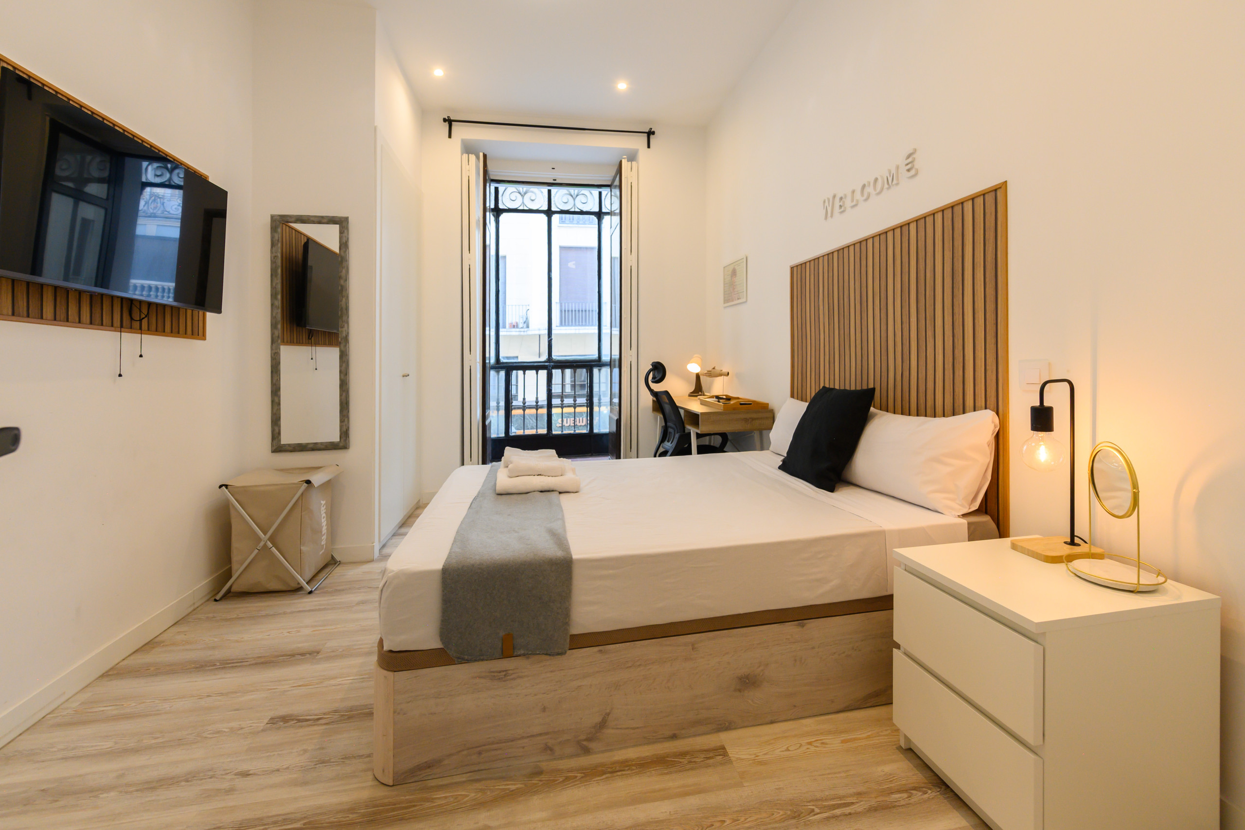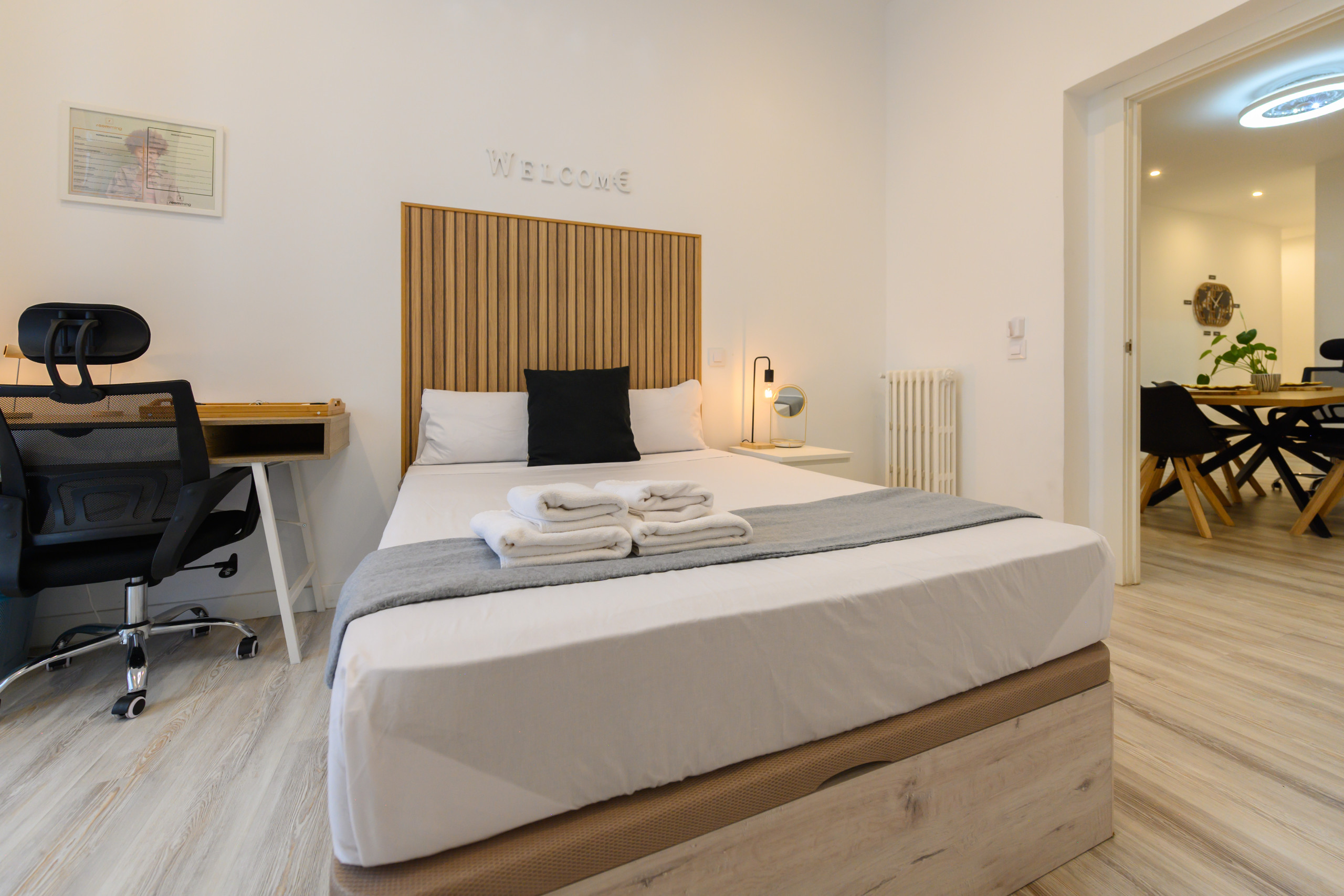 Nos services comprennent : zone de coworking, cuisine complète avec four, micro-ondes, plaque vitrocéramique, grands réfrigérateurs, hotte aspirante, couverts, vaisselle, climatisation de dernière génération, lave-linge/sèche-linge – zone de buanderie, nettoyage hebdomadaire des zones communes, fournitures de base, Wifi–LAN dans toute la maison-chambres et serrures intelligentes.