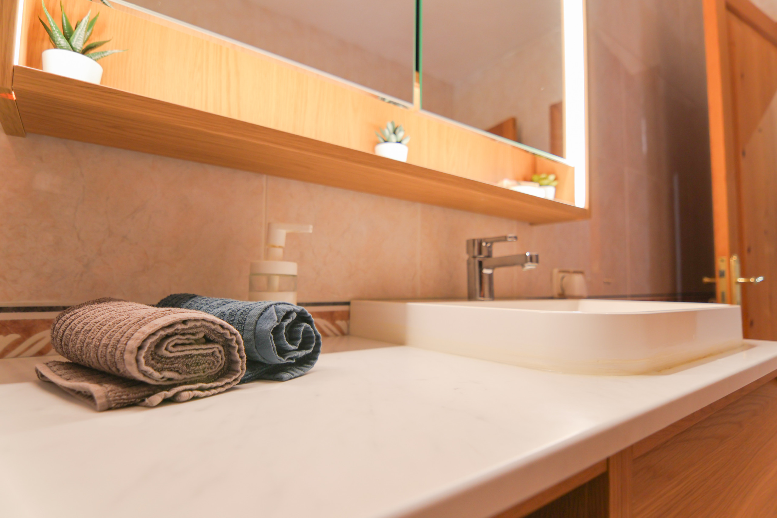 La cuisine, de style semi-ouvert avec un bar américain, est bien équipée. Il y a trois chambres (1 avec un lit double, 2 avec deux lits individuels) et deux salles de bains avec baignoire.