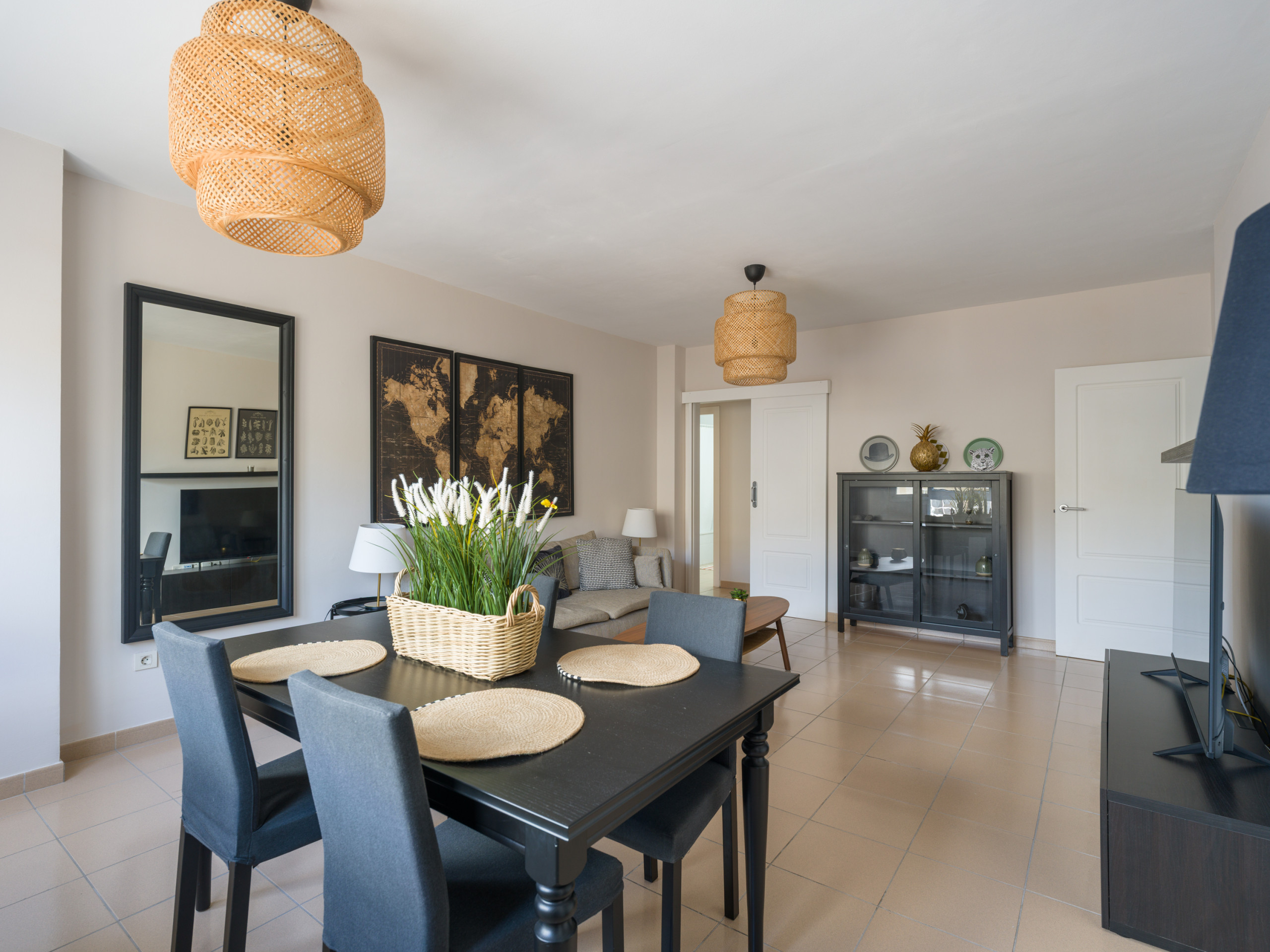 Le salon est conçu pour le confort, avec un espace de vie avec canapé, téléviseur intelligent HD et zone de divertissement. Les rideaux occultants garantissent une intimité et un repos optimal. Le logement de vacances comprend également un fer à repasser et une radio pour plus de commodité.