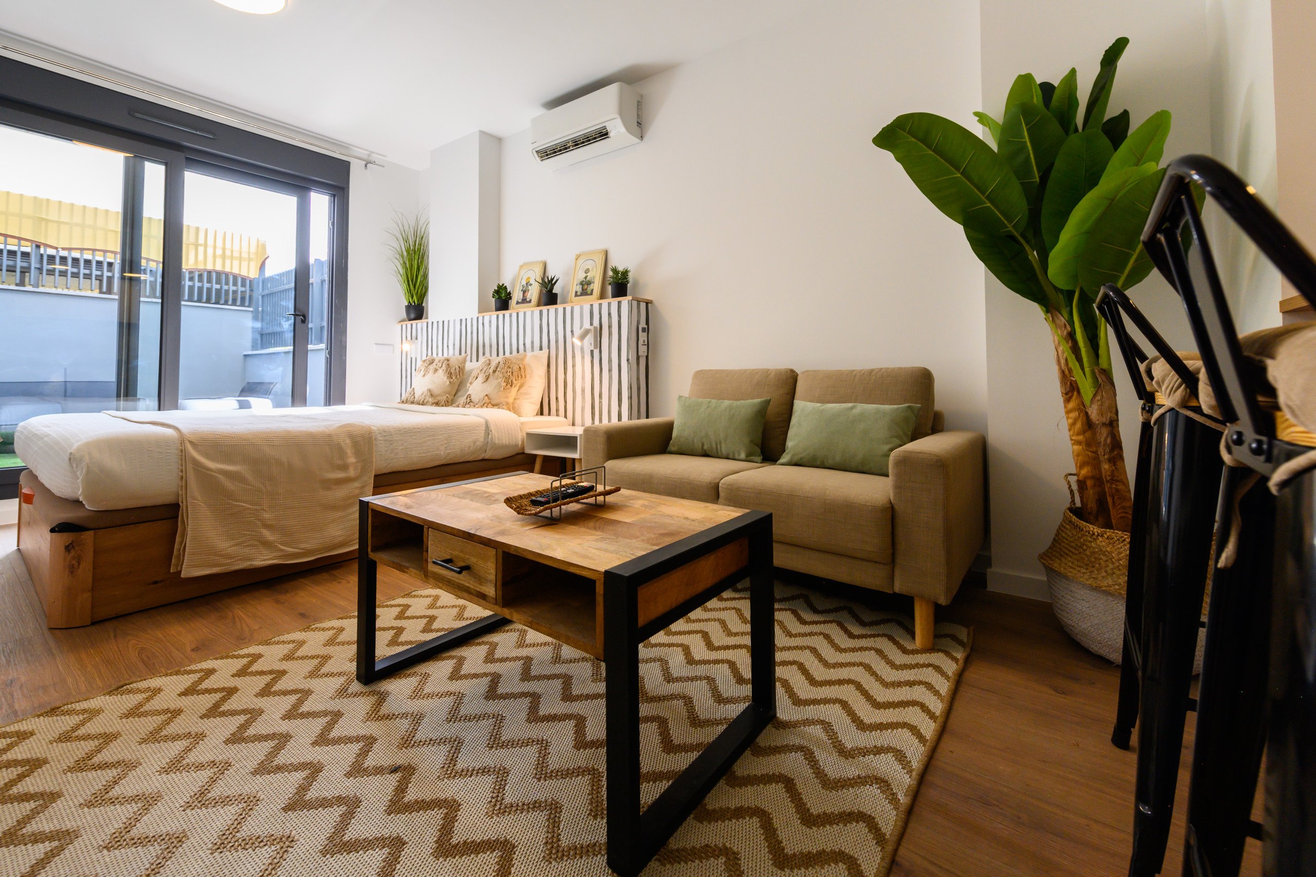 • Espace salon avec canapé, TV et climatisation pour maintenir une température agréable toute l'année.