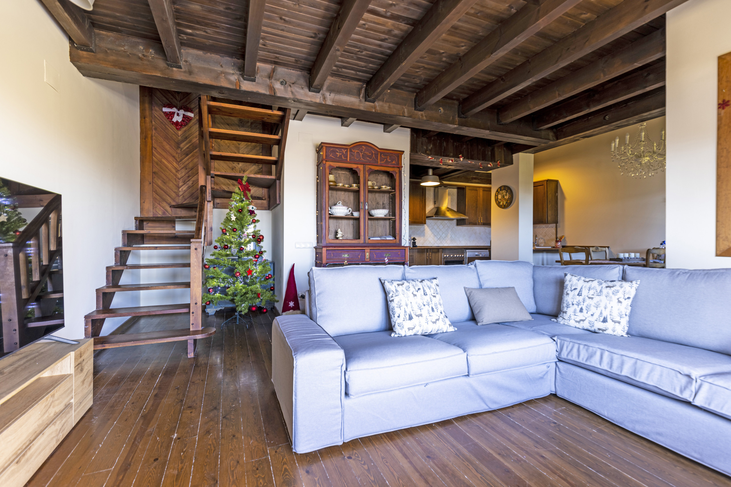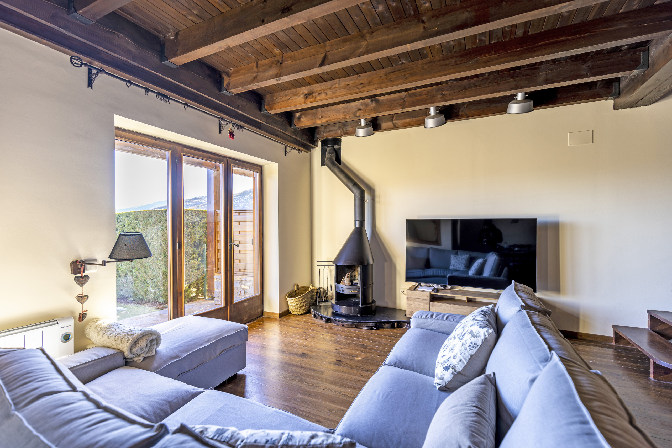Au rez-de-chaussée se trouve le salon-salle à manger avec une cuisine ouverte. Un grand canapé avec une vue magnifique et panoramique pour profiter du feu de cheminée. La cuisine est entièrement équipée et, étant une cuisine ouverte, elle est très agréable pour cuisiner et profiter en groupe ou en famille.
