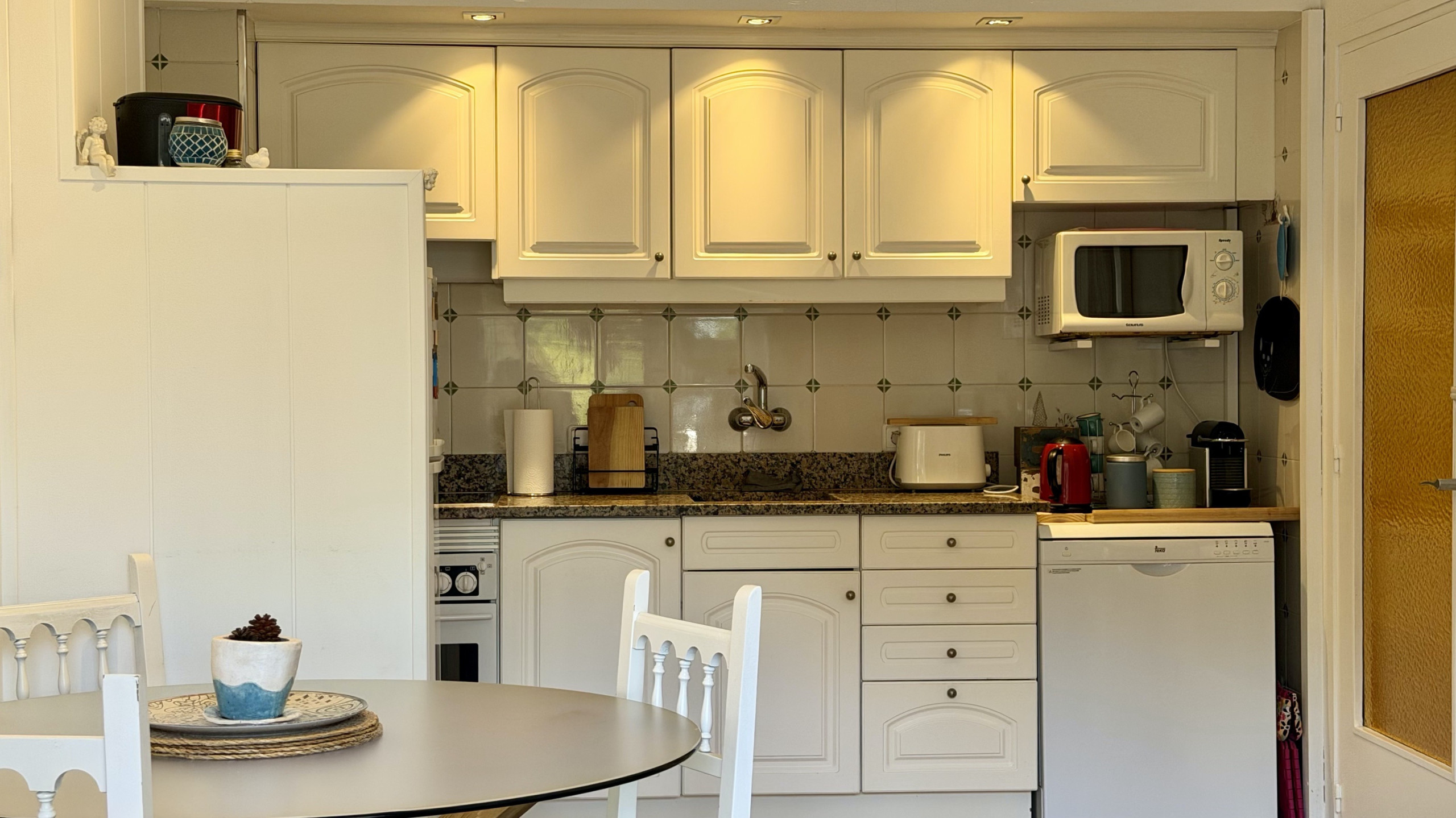 La cucina americana, a vetroceramica, è attrezzata con frigorifero, microonde, forno, congelatore, lavastoviglie, stoviglie/posate, utensili da cucina, caffettiera e tostapane.