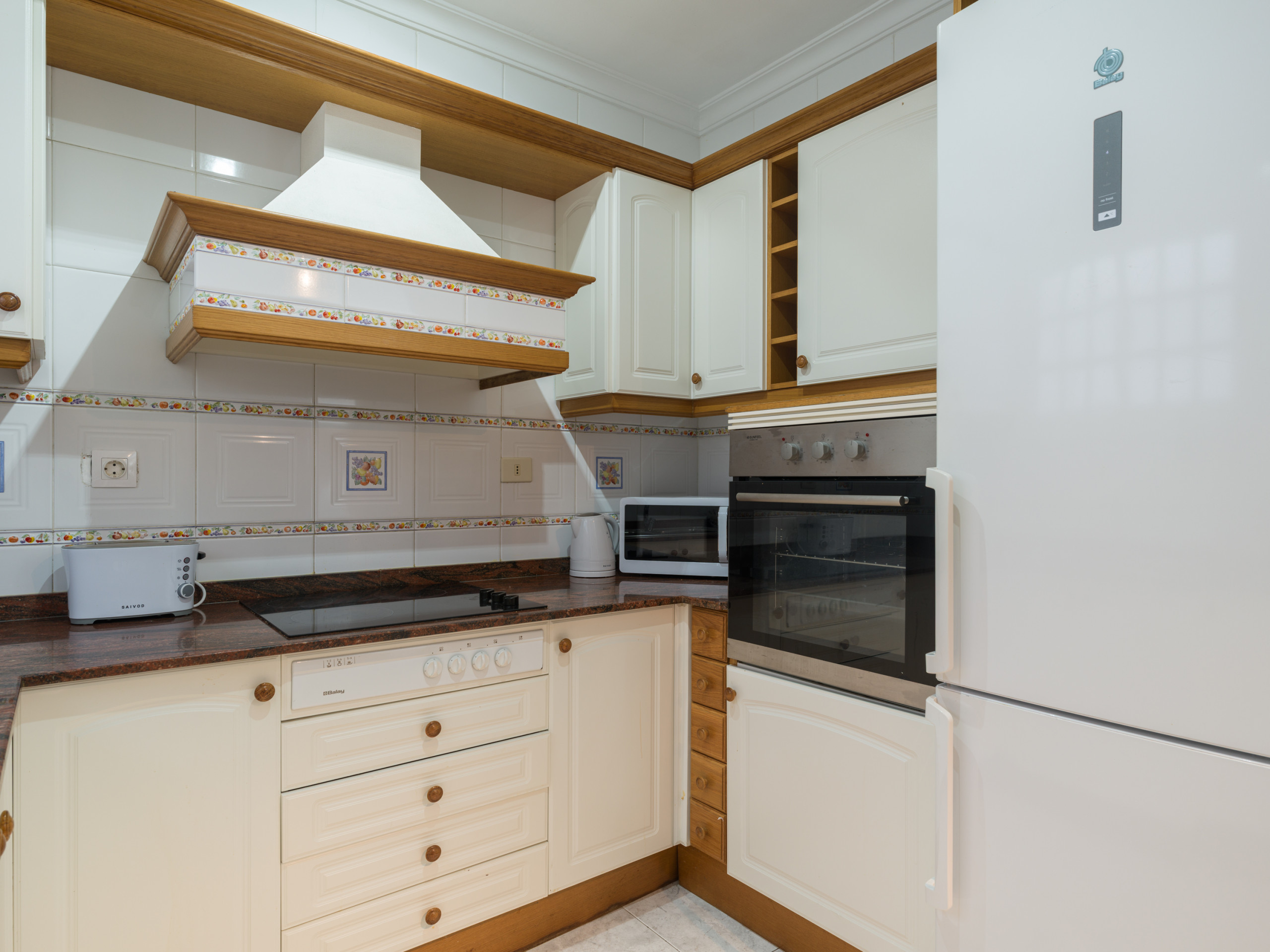 La cucina è completamente attrezzata con elettrodomestici essenziali come frigorifero, congelatore, lavatrice, forno, microonde, tostapane, macchina da caffè, bollitore elettrico e stoviglie complete. Ideale per preparare pasti e godersi momenti gastronomici durante il viaggio.