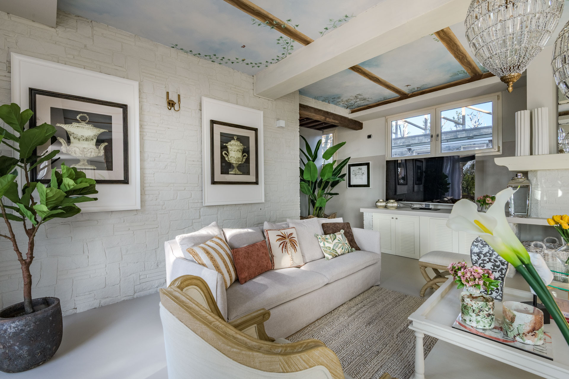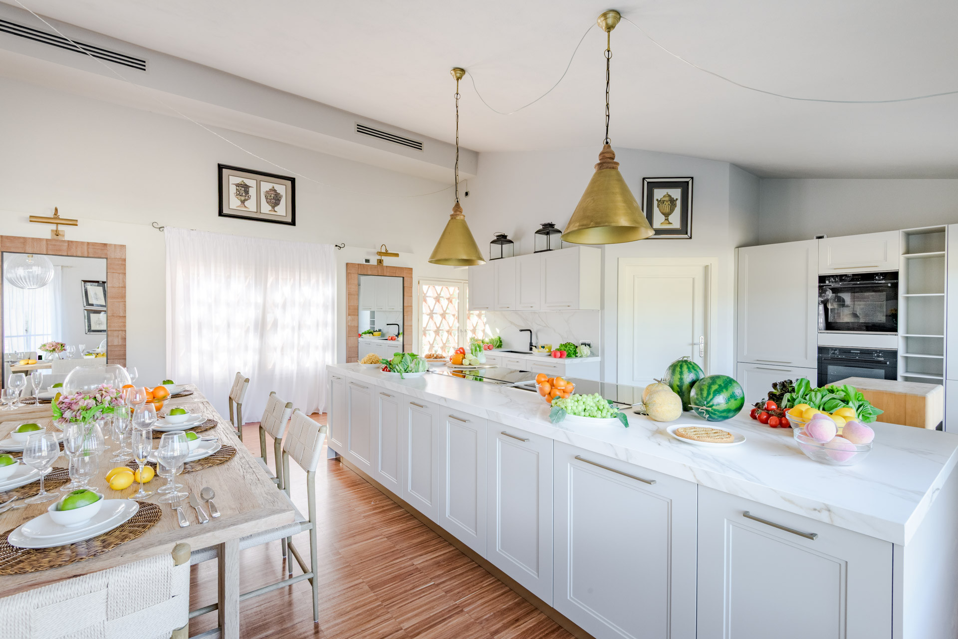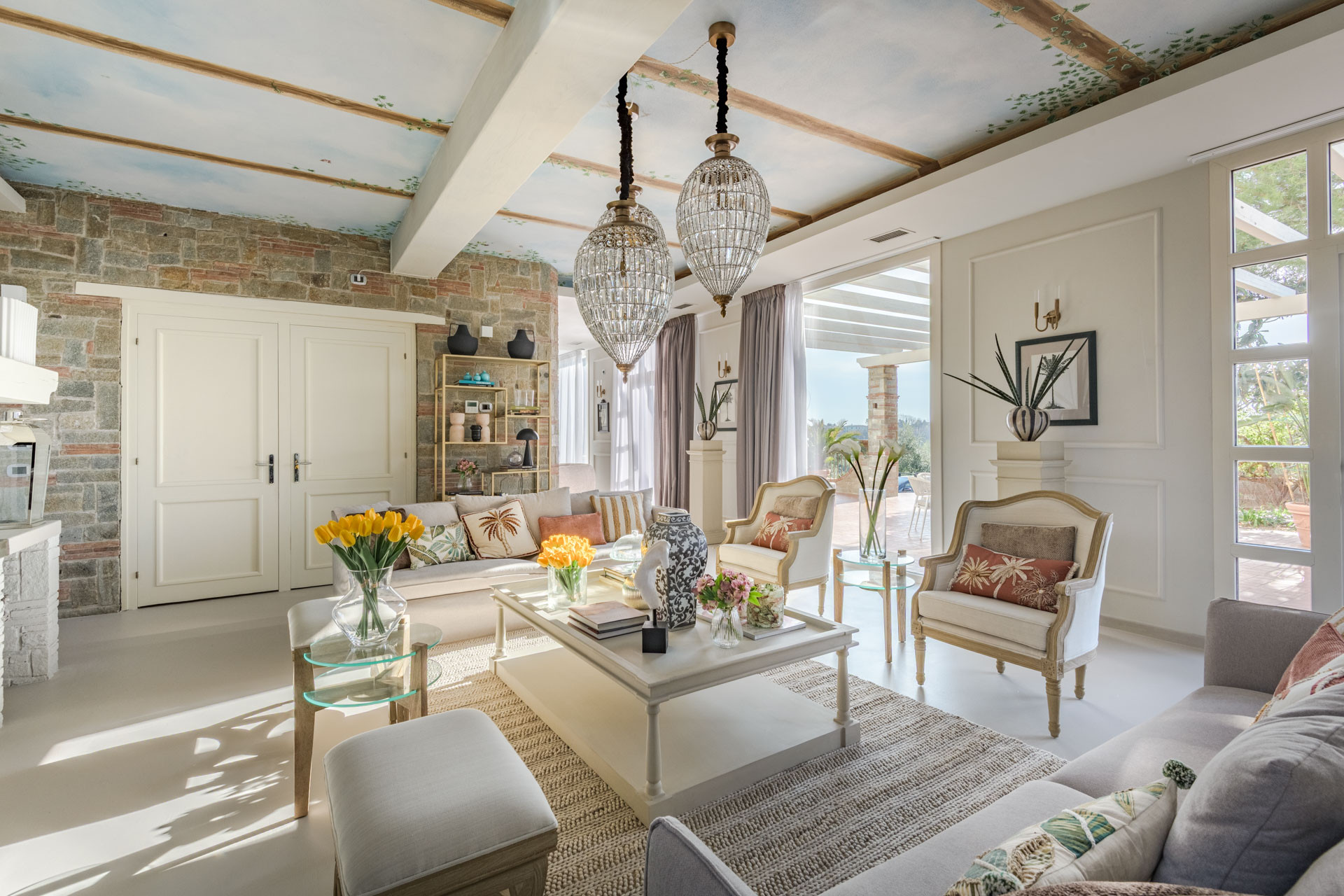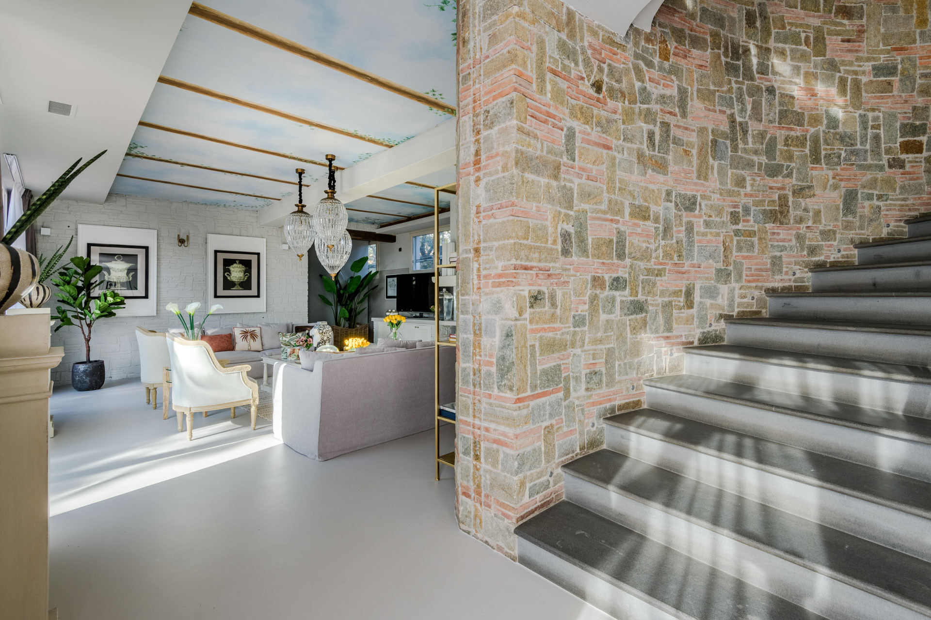 Primo Piano: Salendo la maestosa scalinata, si apre una zona giorno scenografica. Un secondo salotto introduce alla grande zona pranzo, caratterizzata da un tavolo a "C" per 26 persone e una cucina openspace con isola centrale, ideale per appassionate cooking class di gruppo.