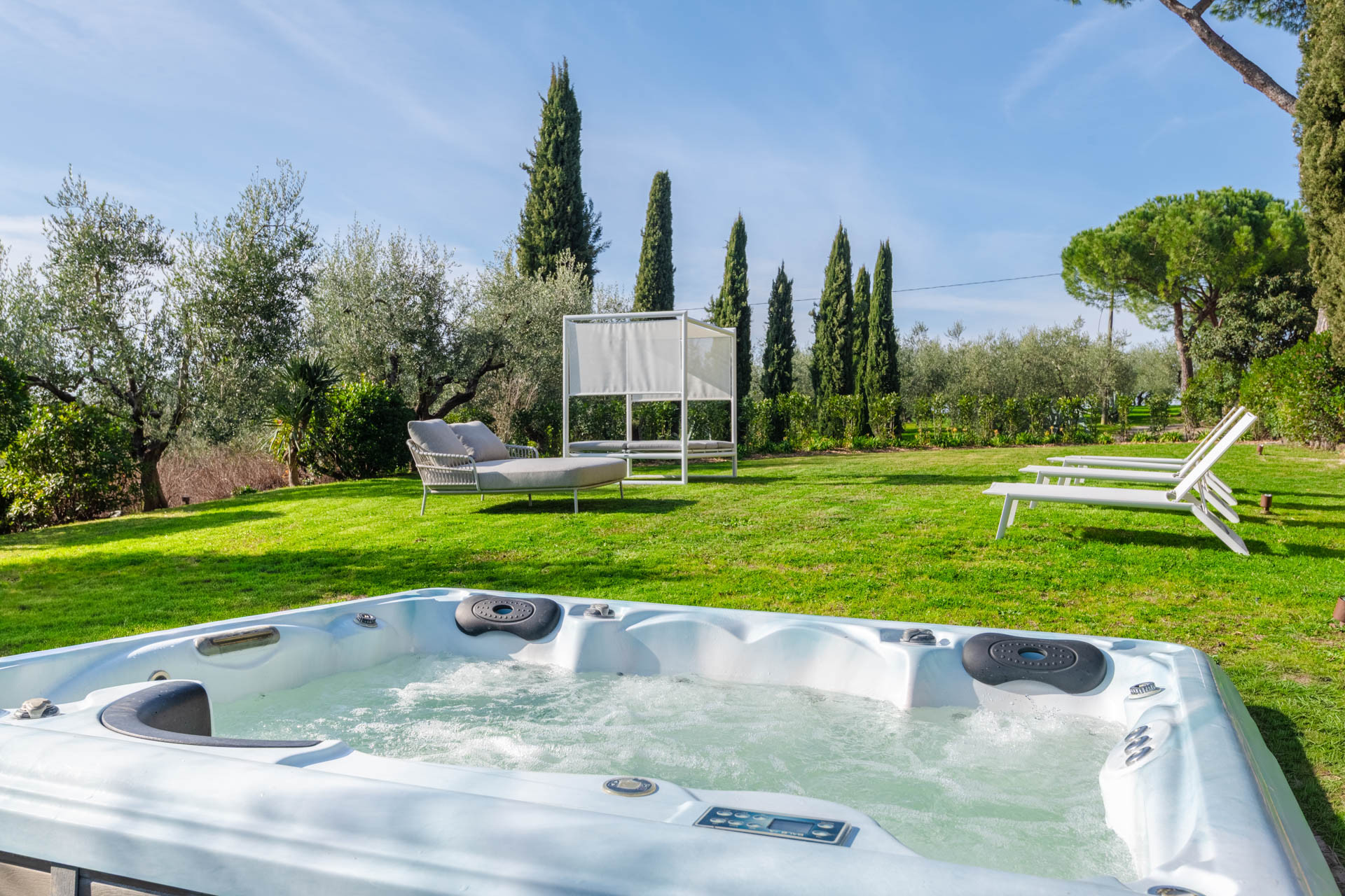 Relax Totale: All'ingresso, un'area arredata con divani e letti prendisole invita al riposo, mentre nel giardino spicca una Jacuzzi riscaldata con vista mozzafiato sulle vigne.