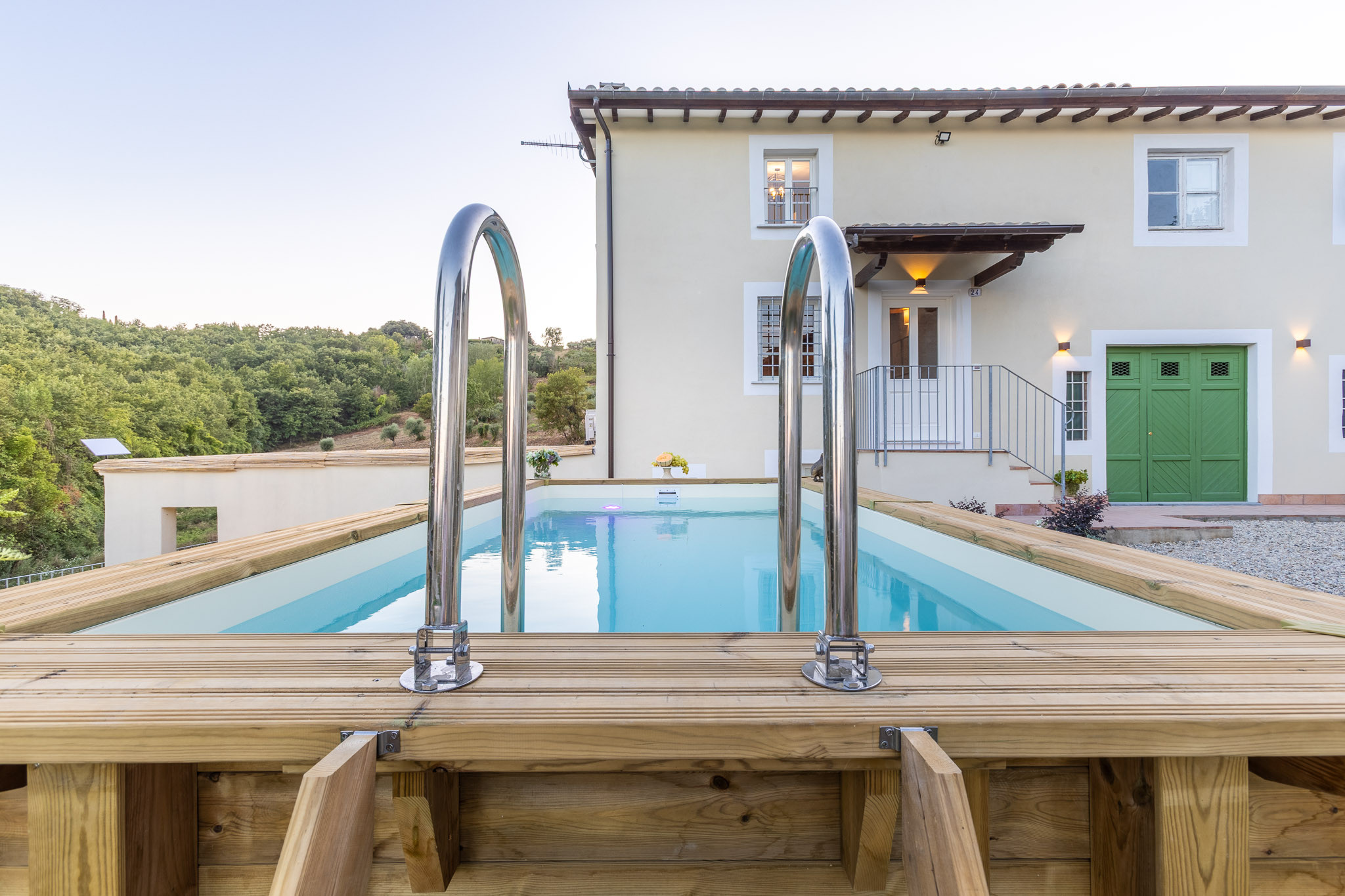 All'esterno, un giardino privato recintato offre uno spazio ideale per momenti di relax. Gli ospiti possono godersi l'area all'aperto con arredi da giardino, immersi in un contesto naturale circondato da boschi. Un'altra chicca è la piscina privata di 4,68 x 2,09 metri, perfetta per rinfrescarsi durante le calde giornate estive.