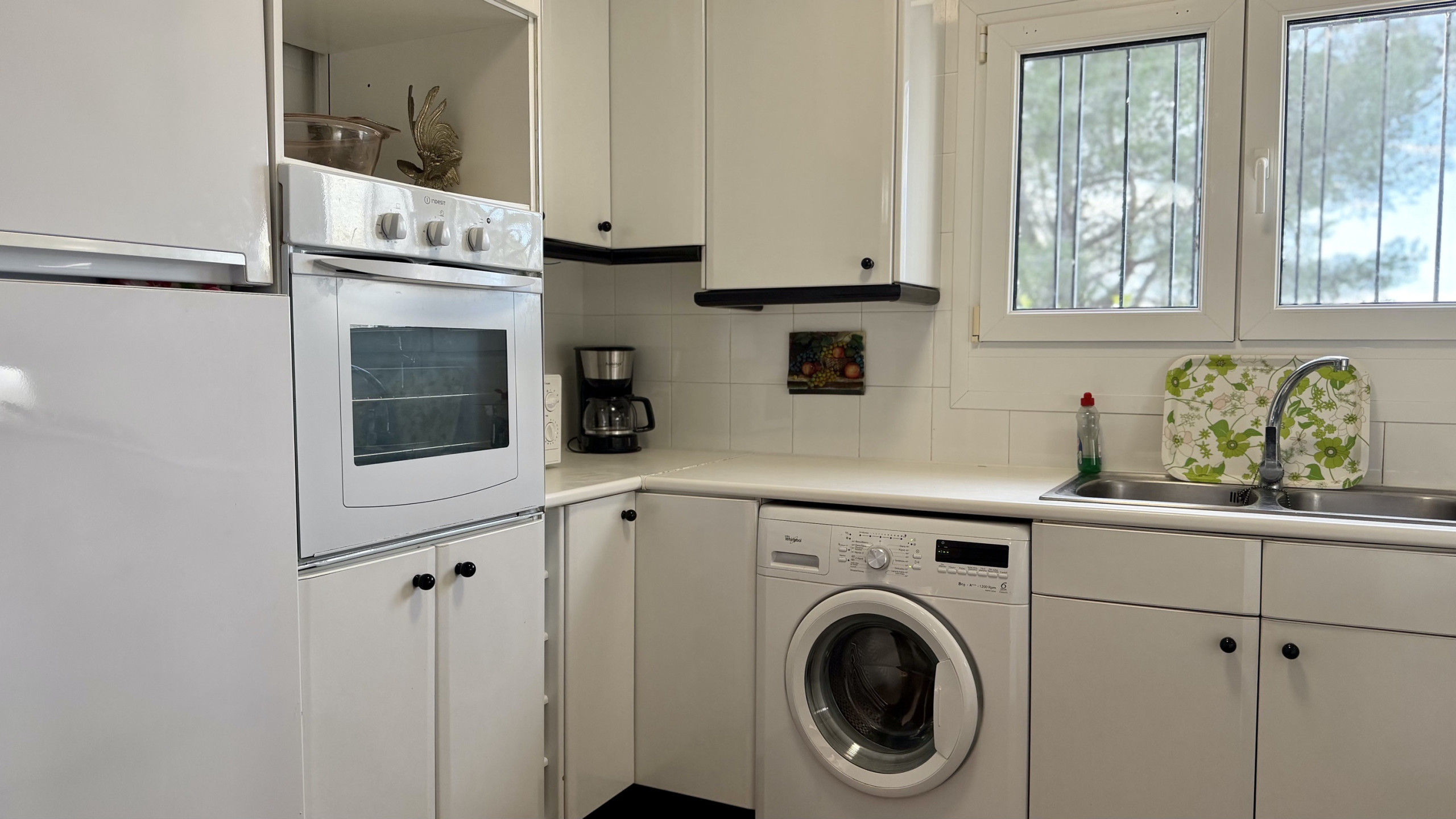 A kitchenette, de gás, está equipada com frigorífico, forno, congelador, louça/talheres, utensílios/cozinha, máquina de café e torradeira.