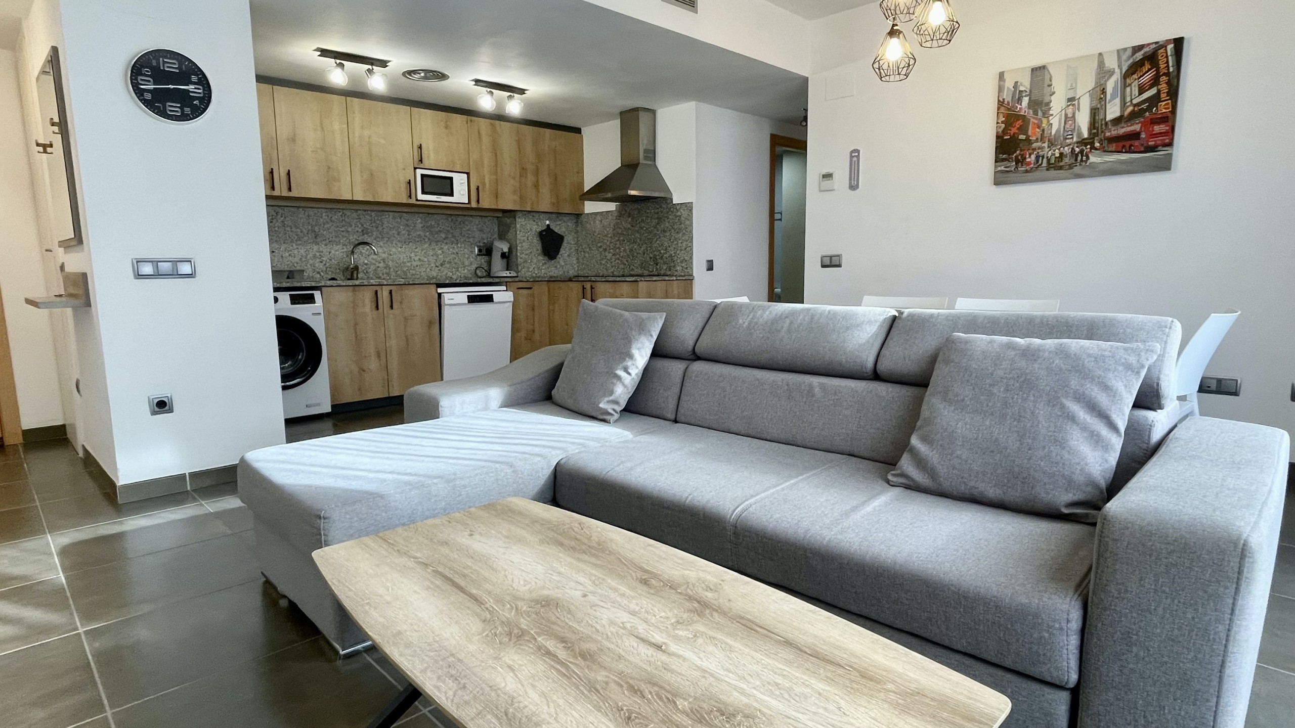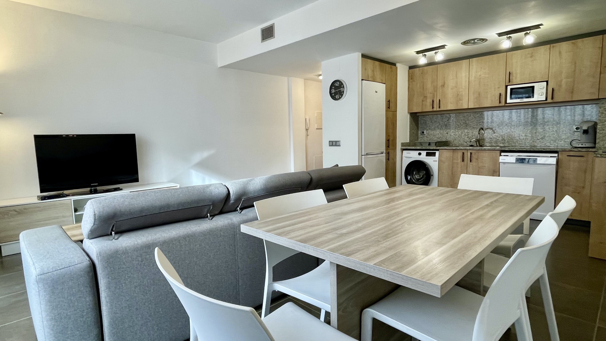 A great plus is the private covered parking located in the same building, which greatly facilitates arrival and departure with luggage or for excursions. The area has air conditioning to maintain a cool environment during the hottest days, and a fully equipped American kitchen with modern appliances such as a dishwasher, oven, microwave, and coffee machine.