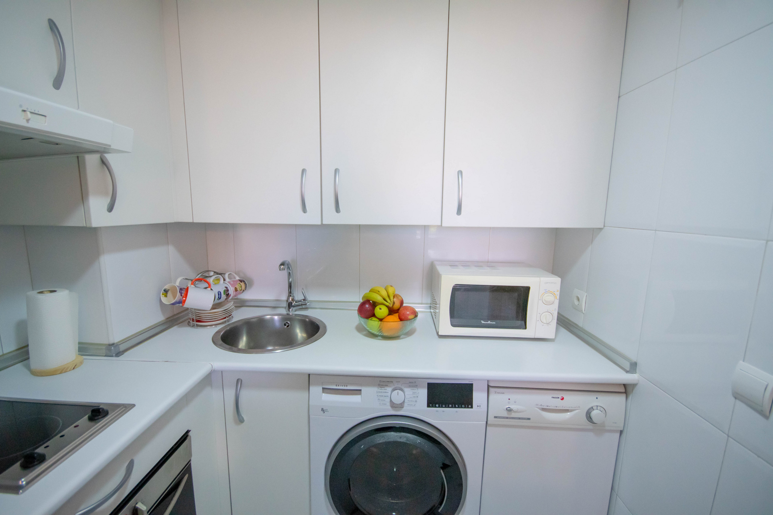 In the hotplate of glass ceramics independent kitchen, refrigerator, microwave, oven, freezer, dishwasher, dishes/cutlery, kitchen utensils, coffee machine, frying pan, toaster, kettle and juicer are provided.