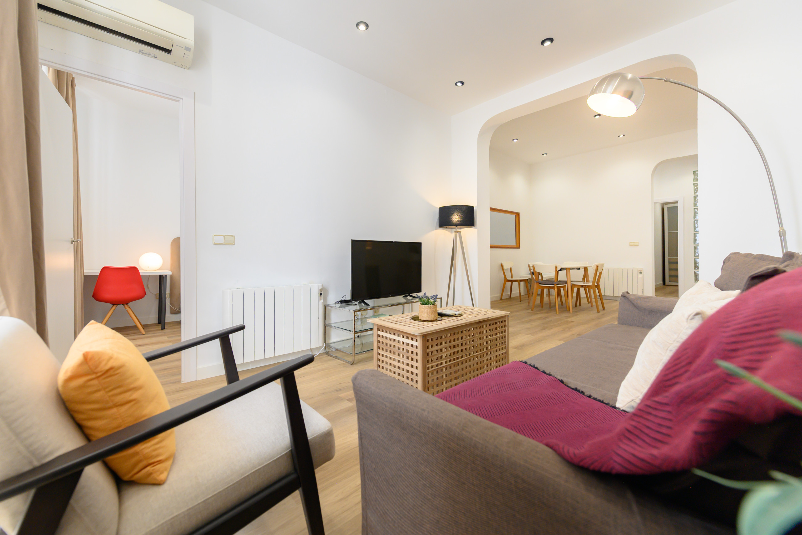 • Spacious and bright living room: Dining table, sofa bed, television, air conditioning, and heating.