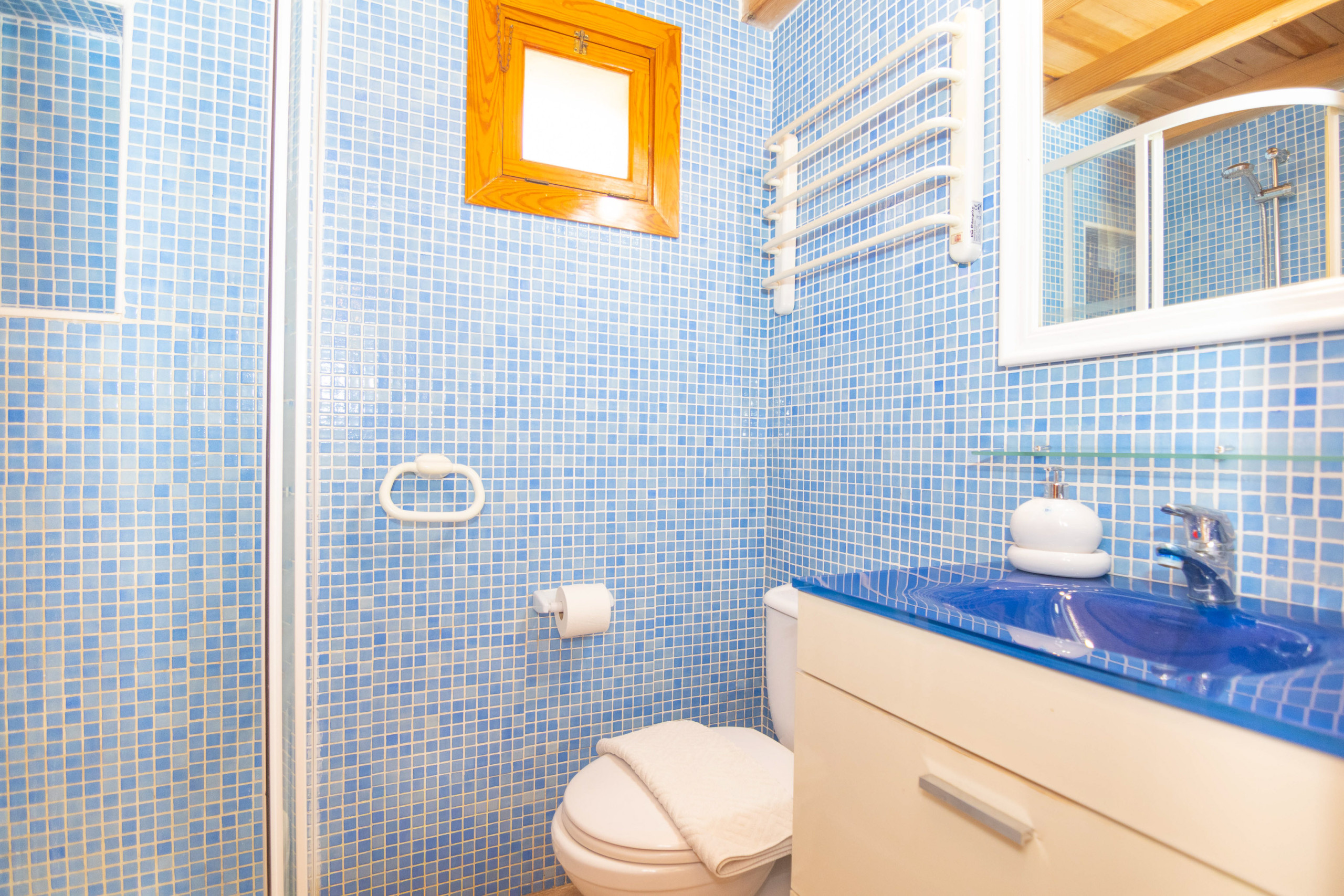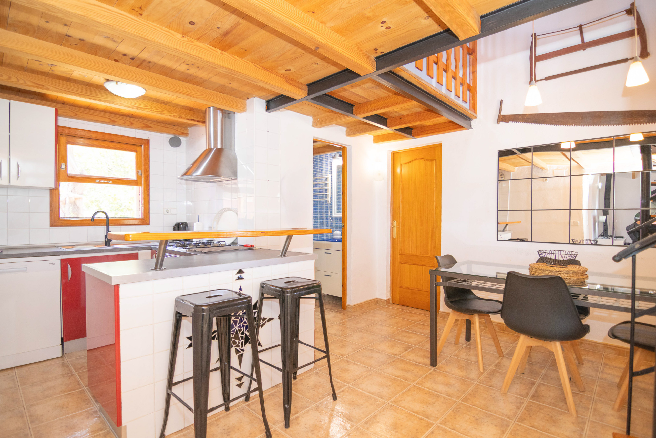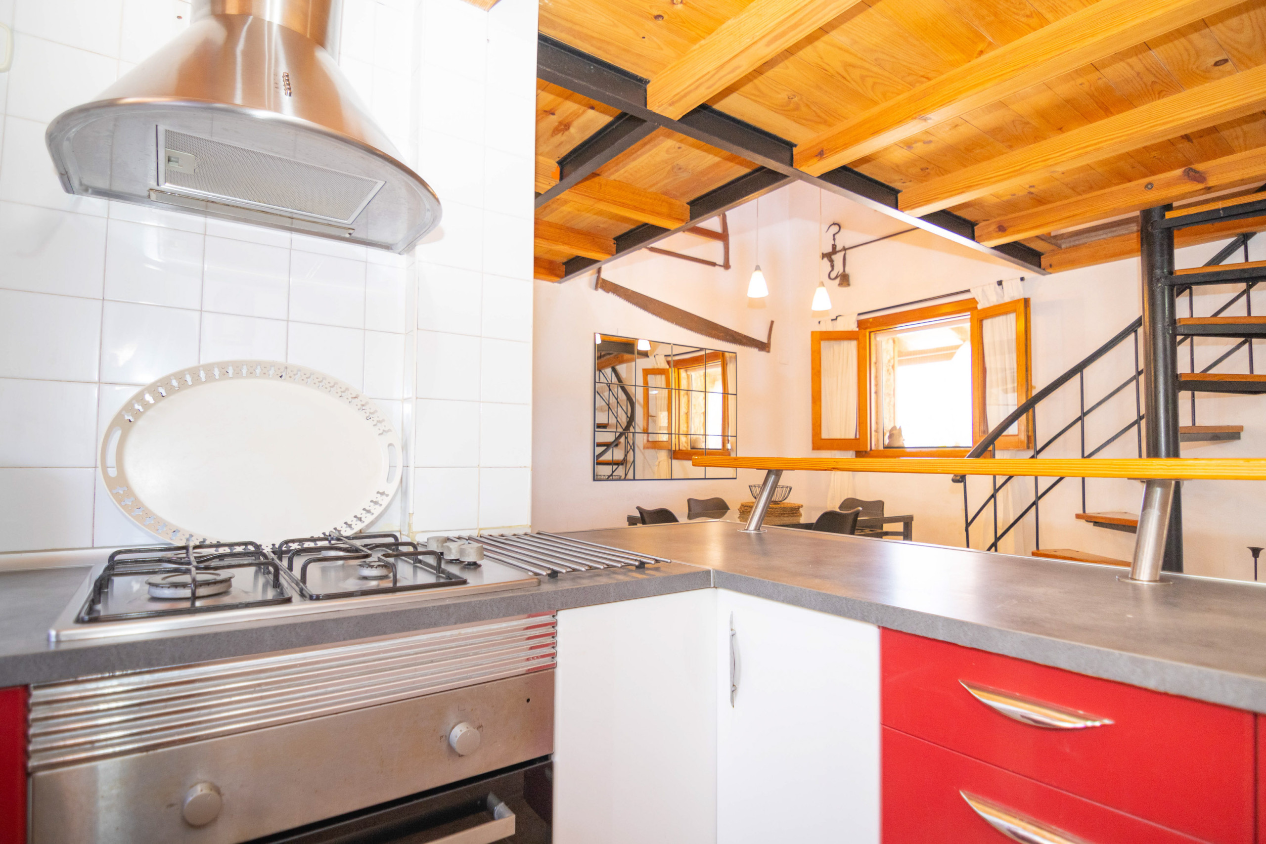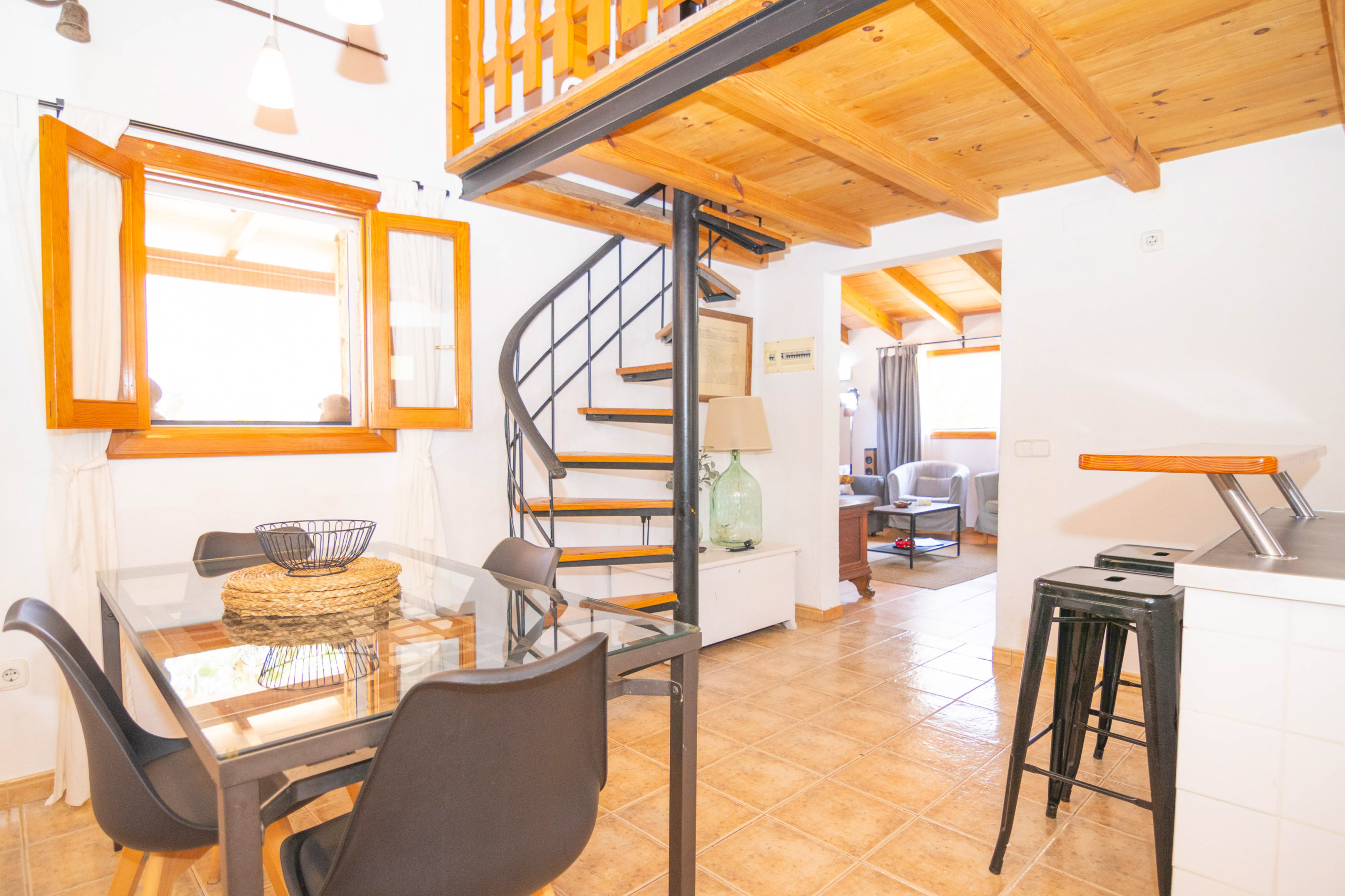 First, you enter the tastefully furnished living room. There are comfortable sofas, a television and internet connection. Next to the living room is a lovely bedroom with a double bed. In addition, there is a dining room that integrates the kitchen. From here, a beautiful spiral staircase leads to another bedroom, which is equipped with two single beds. Of the two bathrooms installed in the house, one has a shower and the other a bathtub.