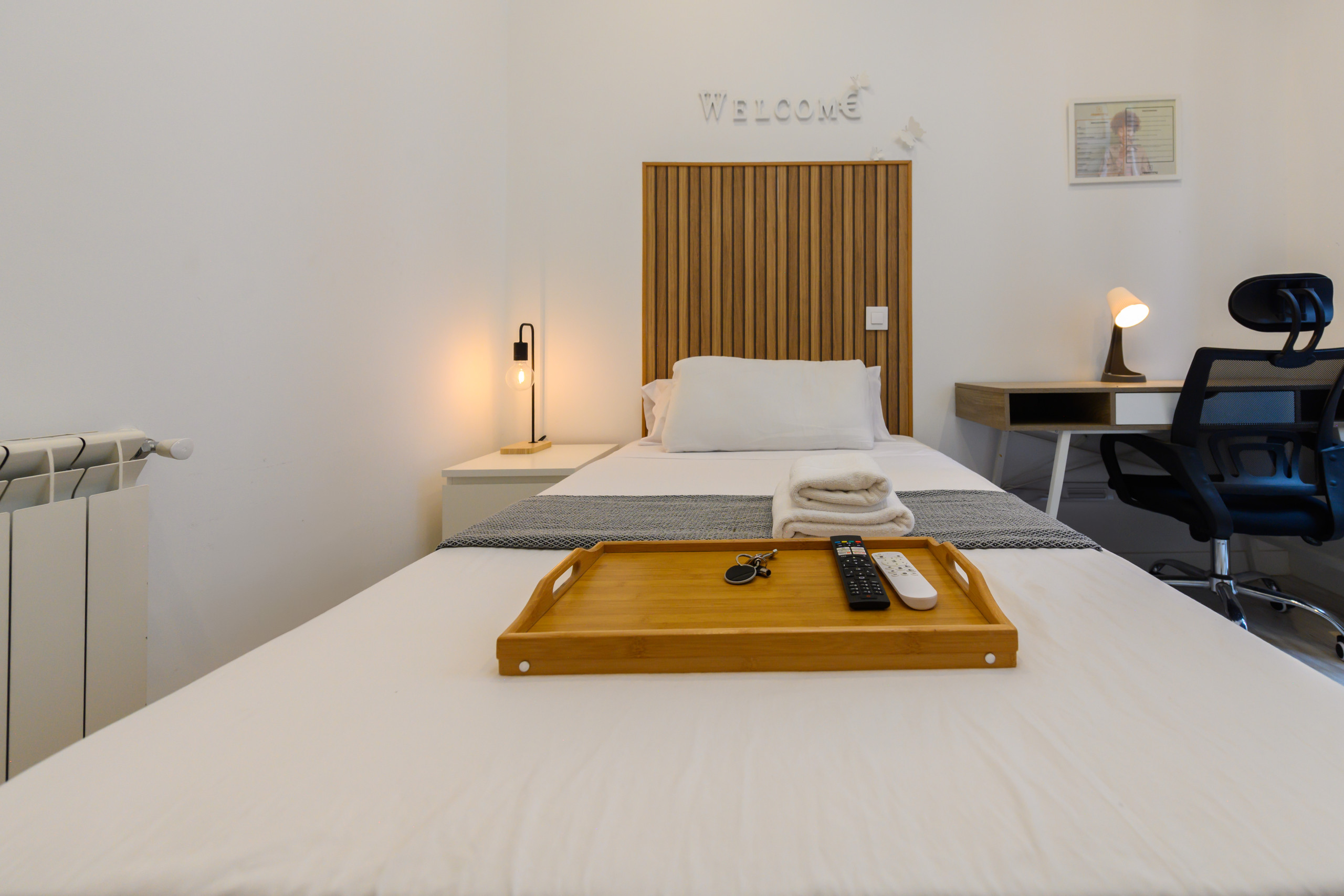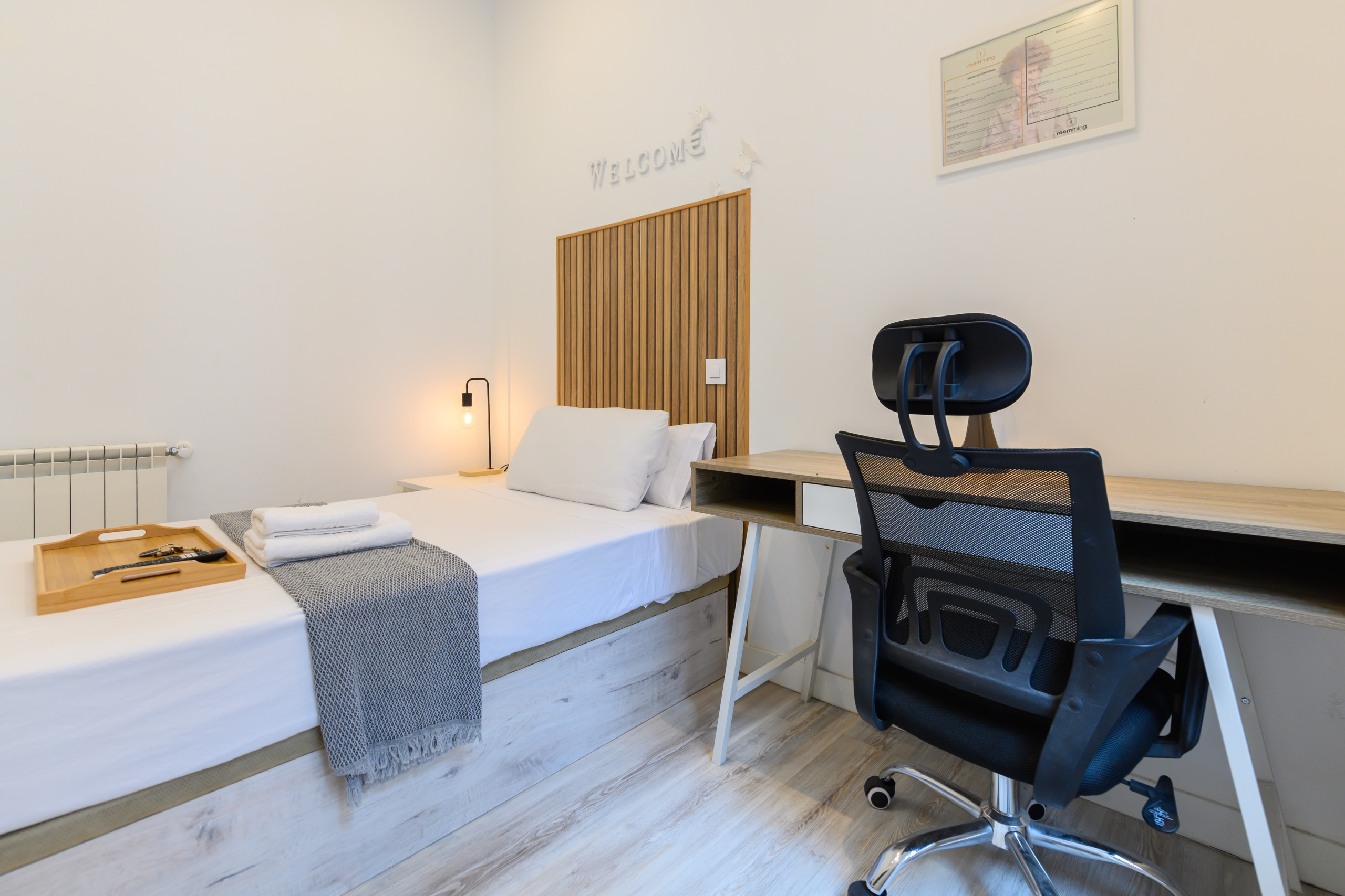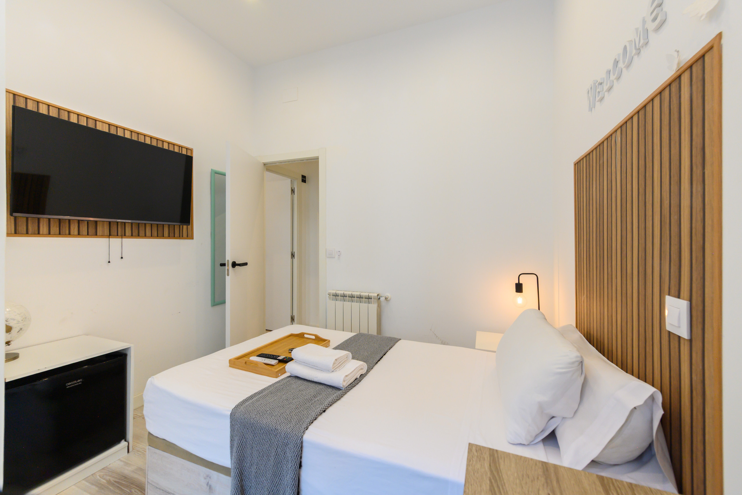 Room 2 - Amsterdam: Premium room with balcony, Located on the second exterior floor within the dwelling, it has all the amenities, from the bed with a premium mattress, storage bed base, desk + chair, to smart TV, air conditioning, safe, ironing board + iron, wireless charger, smart lock, 2 sets of towels and sheets.