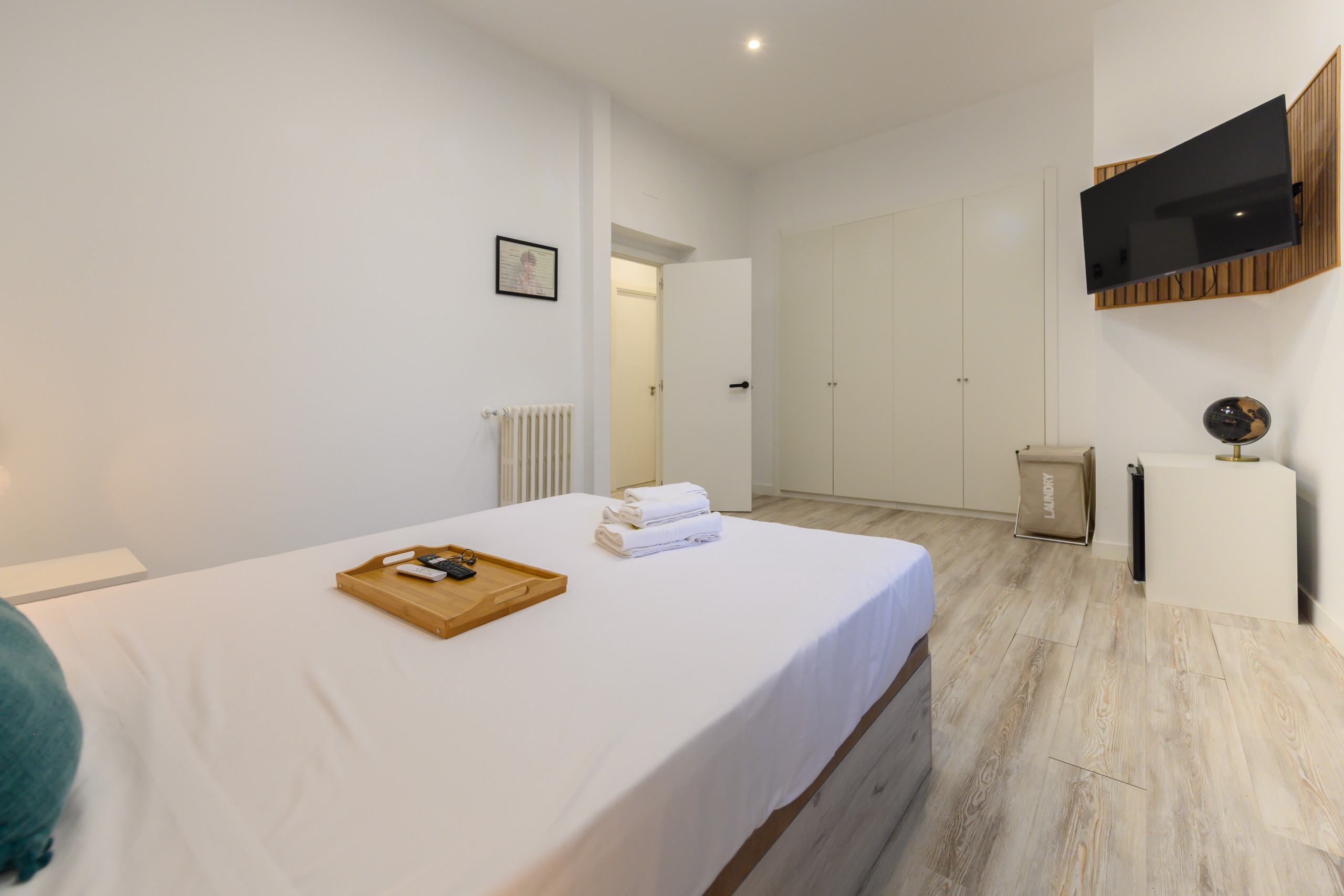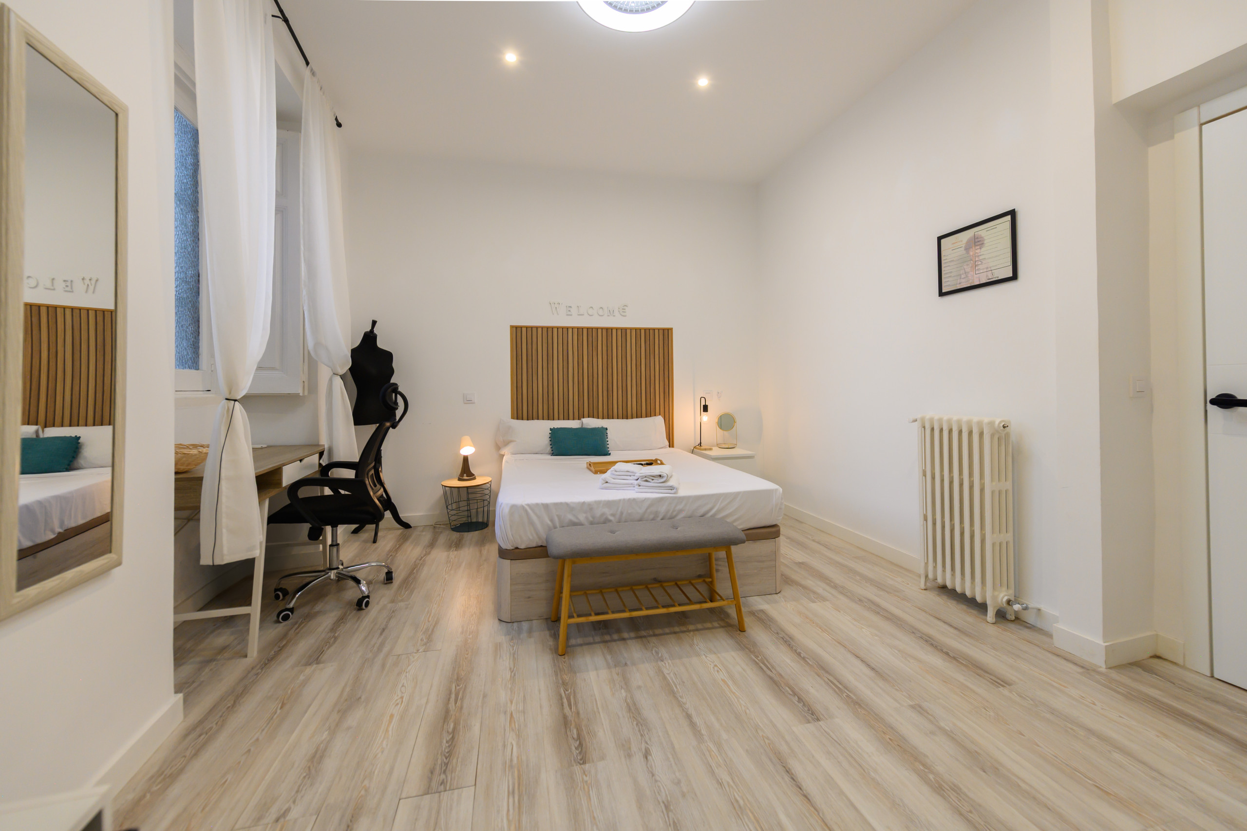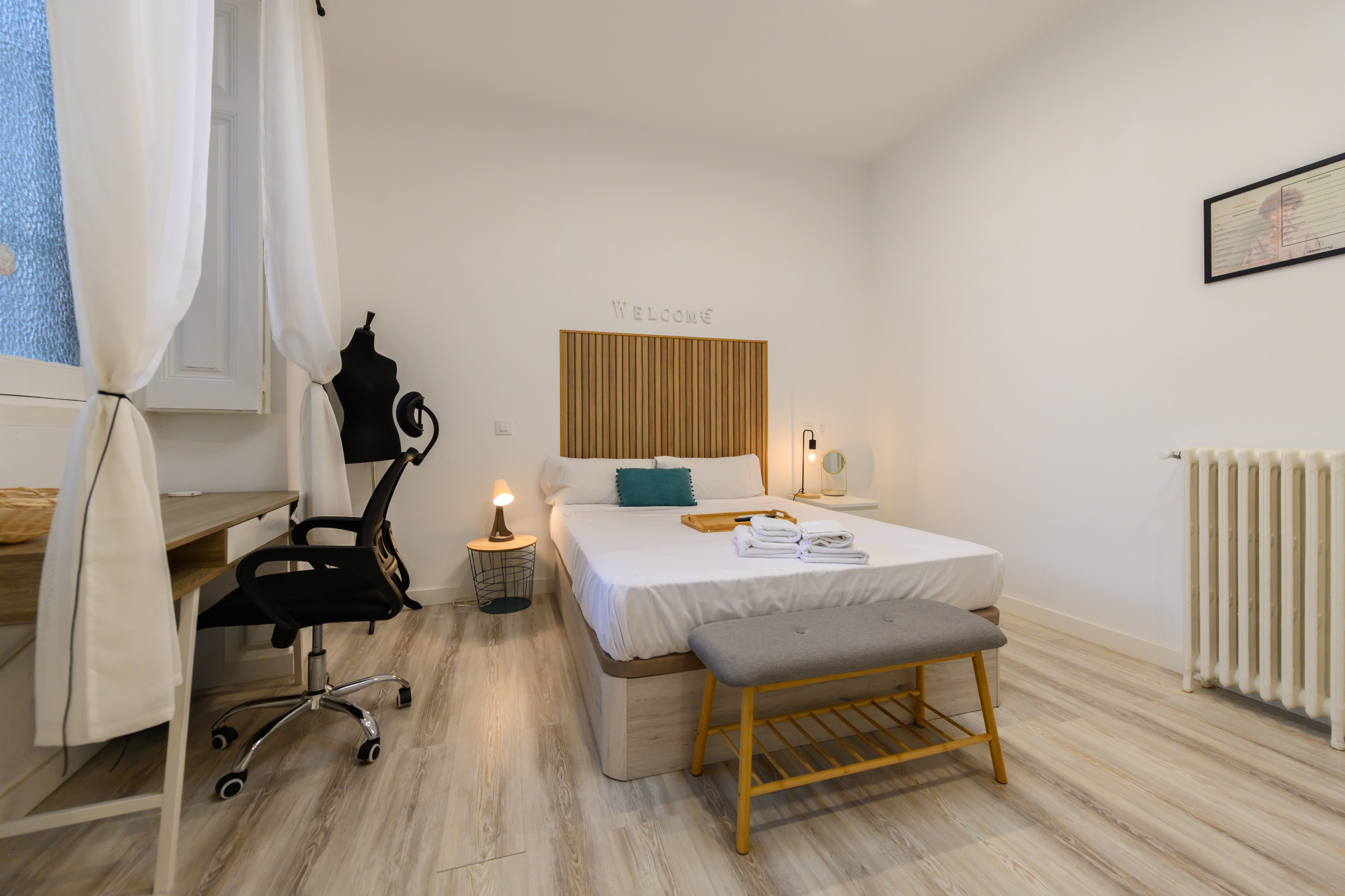Temporary Rental Flat. Room 6 - Madrid: VIP PREMIUM Room with own walk-in wardrobe, inside the San Bernardo10 property. Strategically located, it offers all the amenities that any student might demand. From the bed with a premium mattress, storage bed base, desk + chair, to smart TV, air conditioning, safe, iron + ironing board, wireless charger, smart lock, 2 sets of towels and sheets.