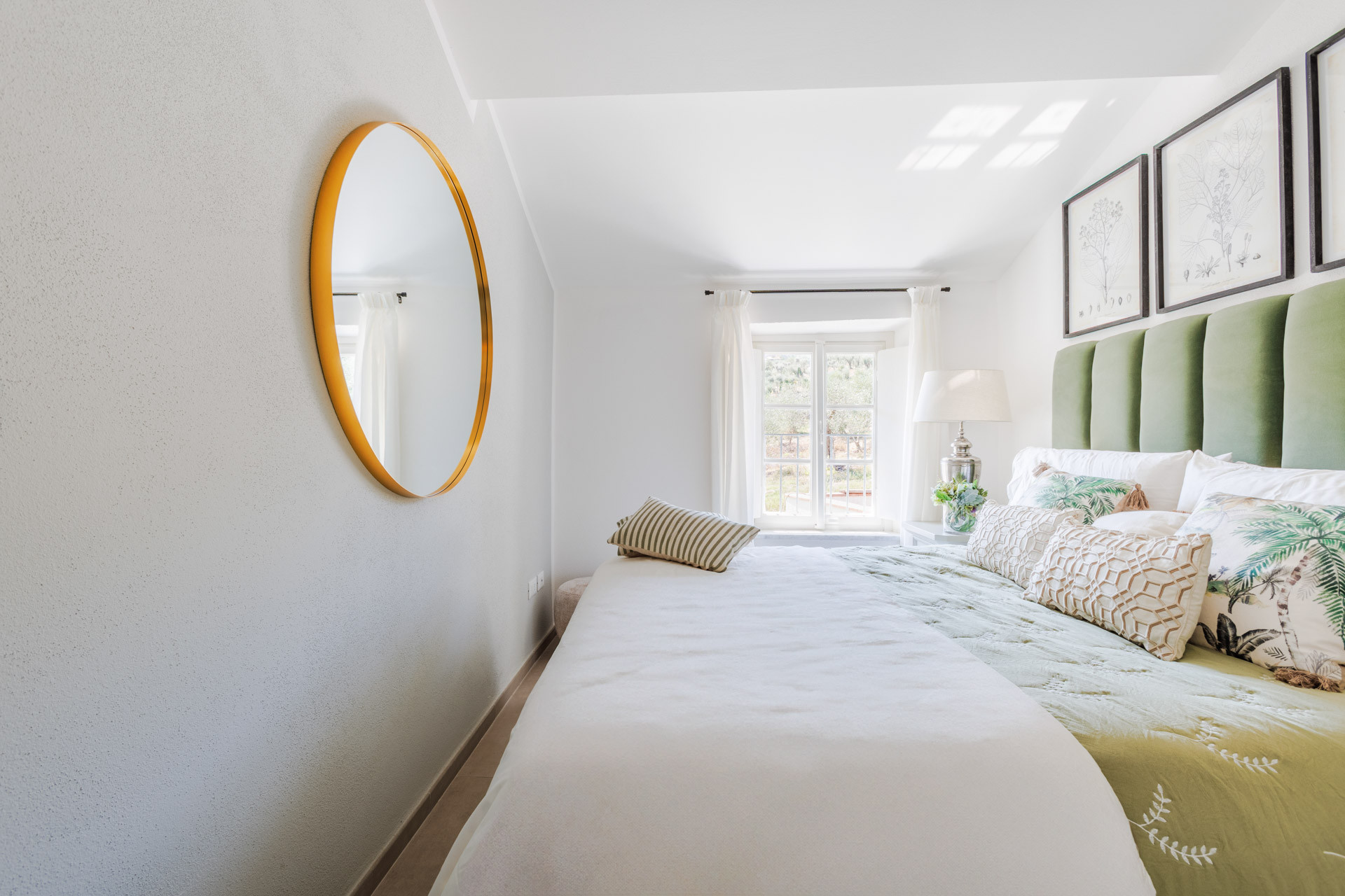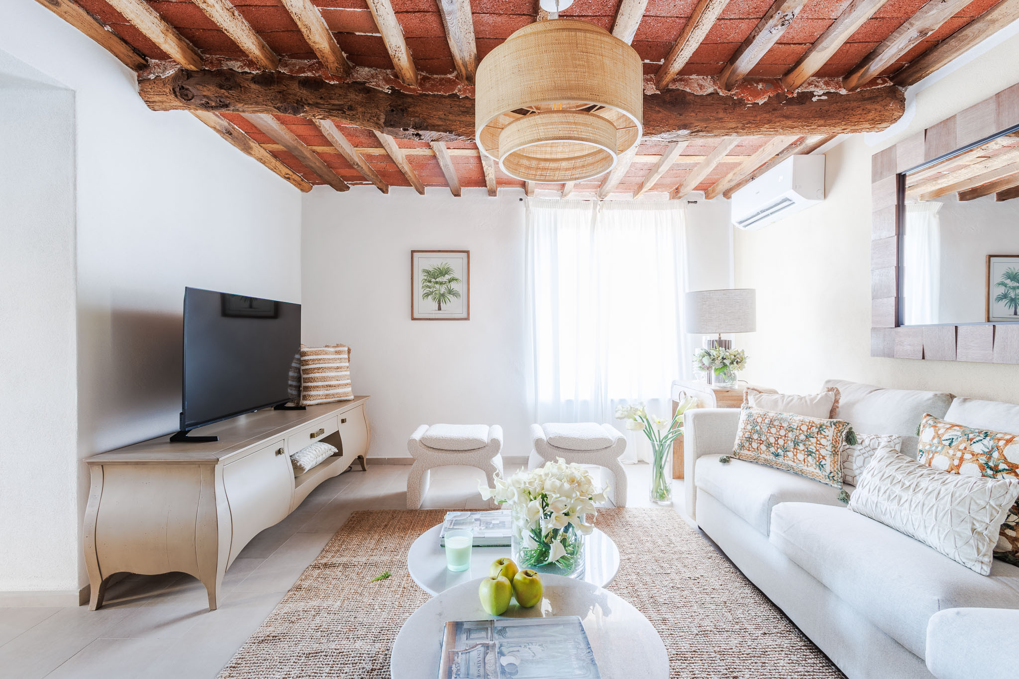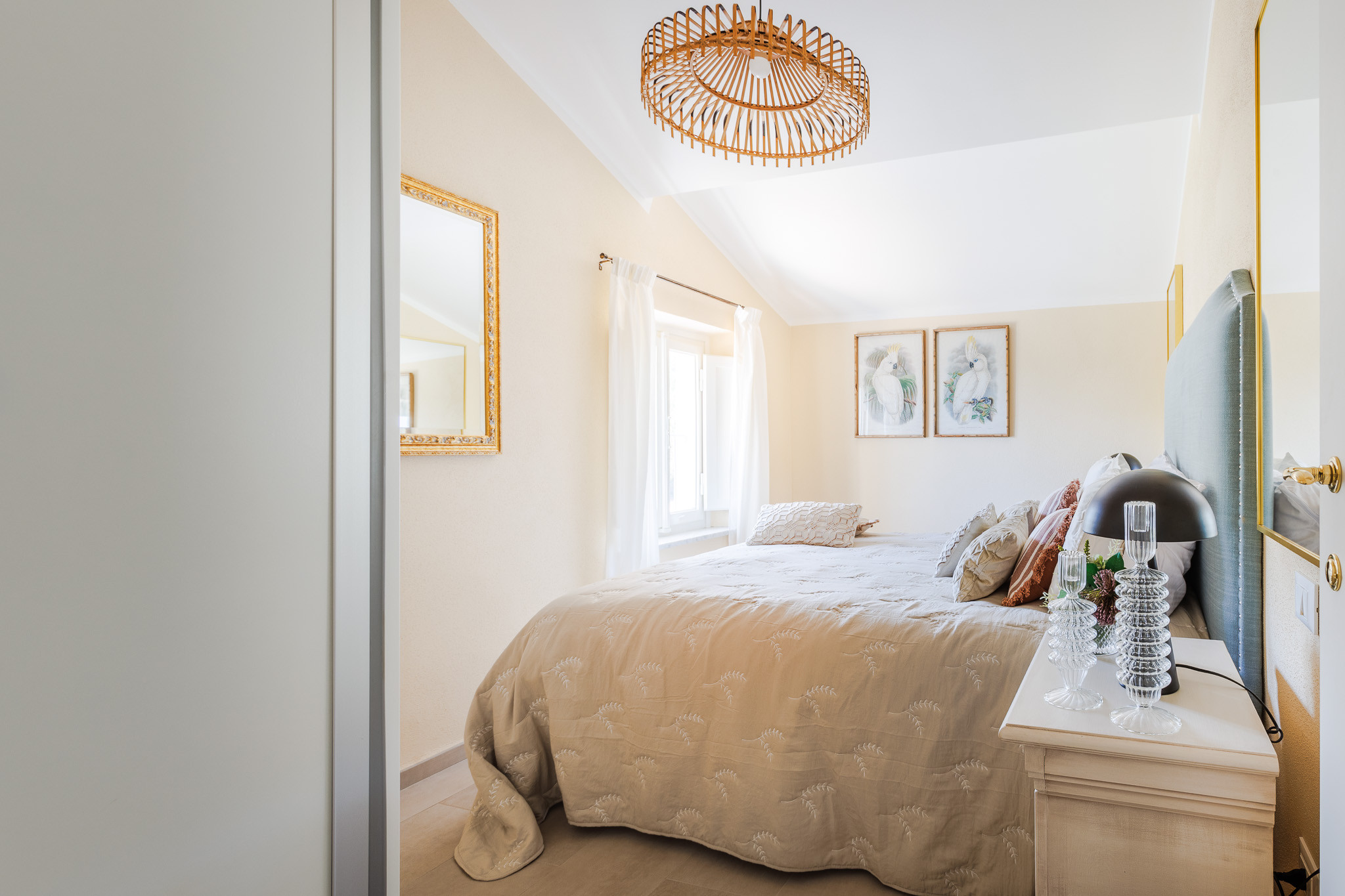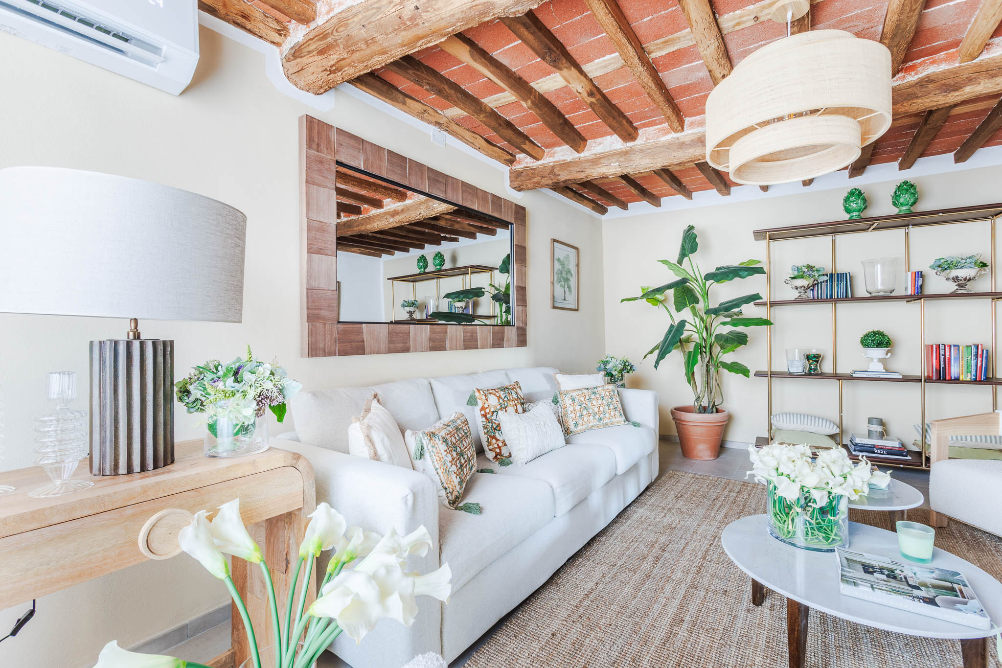 The interiors have been thoughtfully renovated with warm natural tones, wooden beamed ceilings, and elegant furnishings that create a cozy yet refined atmosphere. The living room and dining area are decorated with fresh, contemporary details while preserving the home’s original character, offering a welcoming space to gather with family and friends.