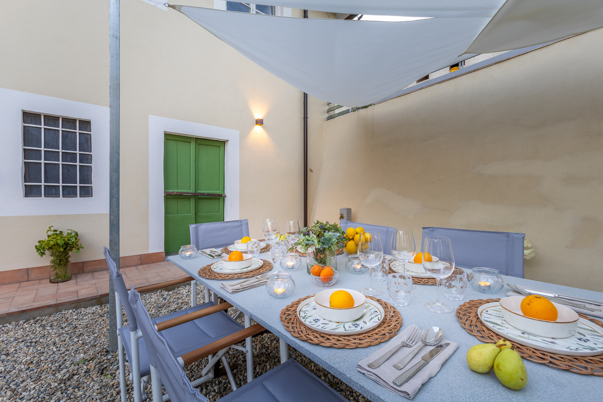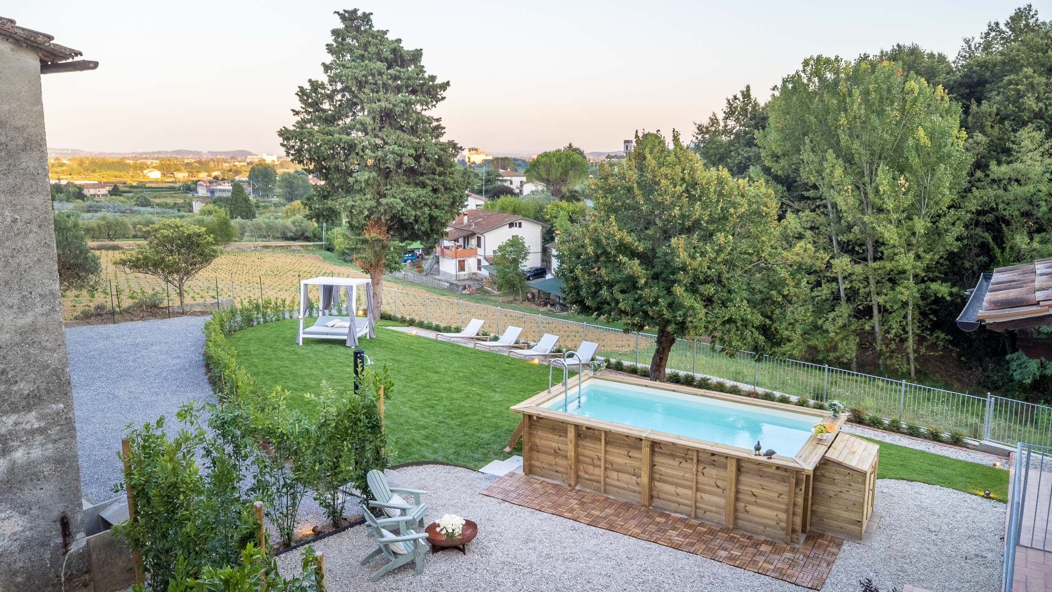 Outdoors, guests can enjoy a private above-ground pool set in the garden, complete with sun loungers for lazy afternoons under the Tuscan sun. A shaded outdoor dining area invites you to savor al fresco meals surrounded by greenery, making every moment feel like a holiday.