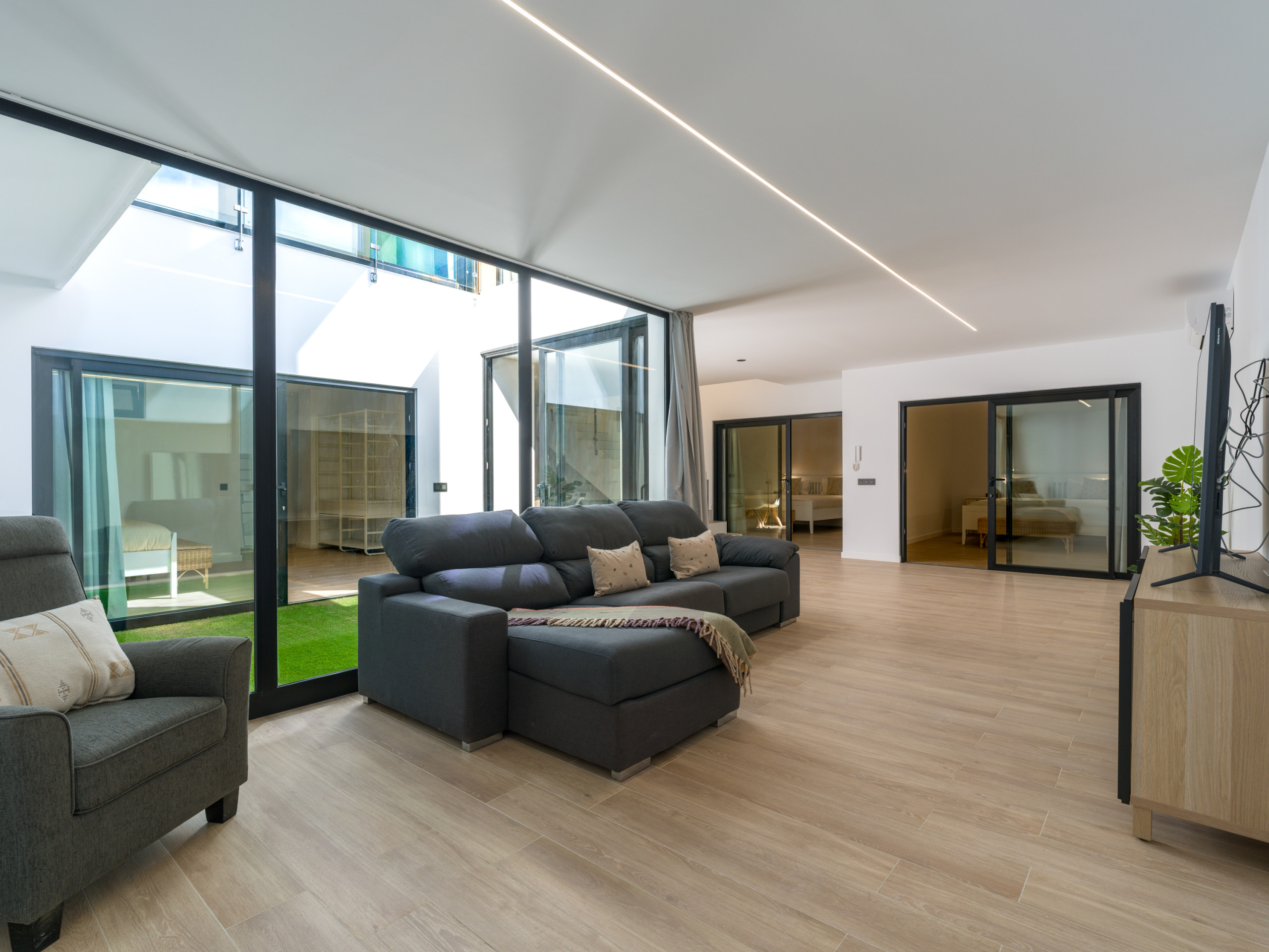 The exterior is one of the great attractions of the villa. The completely fenced perimeter provides privacy and tranquillity, while the outdoor area invites you to enjoy the open air with a heated private pool, sun loungers, outdoor shower, gas barbecue, shaded sofa area and outdoor dining room, ideal for relaxing and taking advantage of the sunny weather throughout the day.