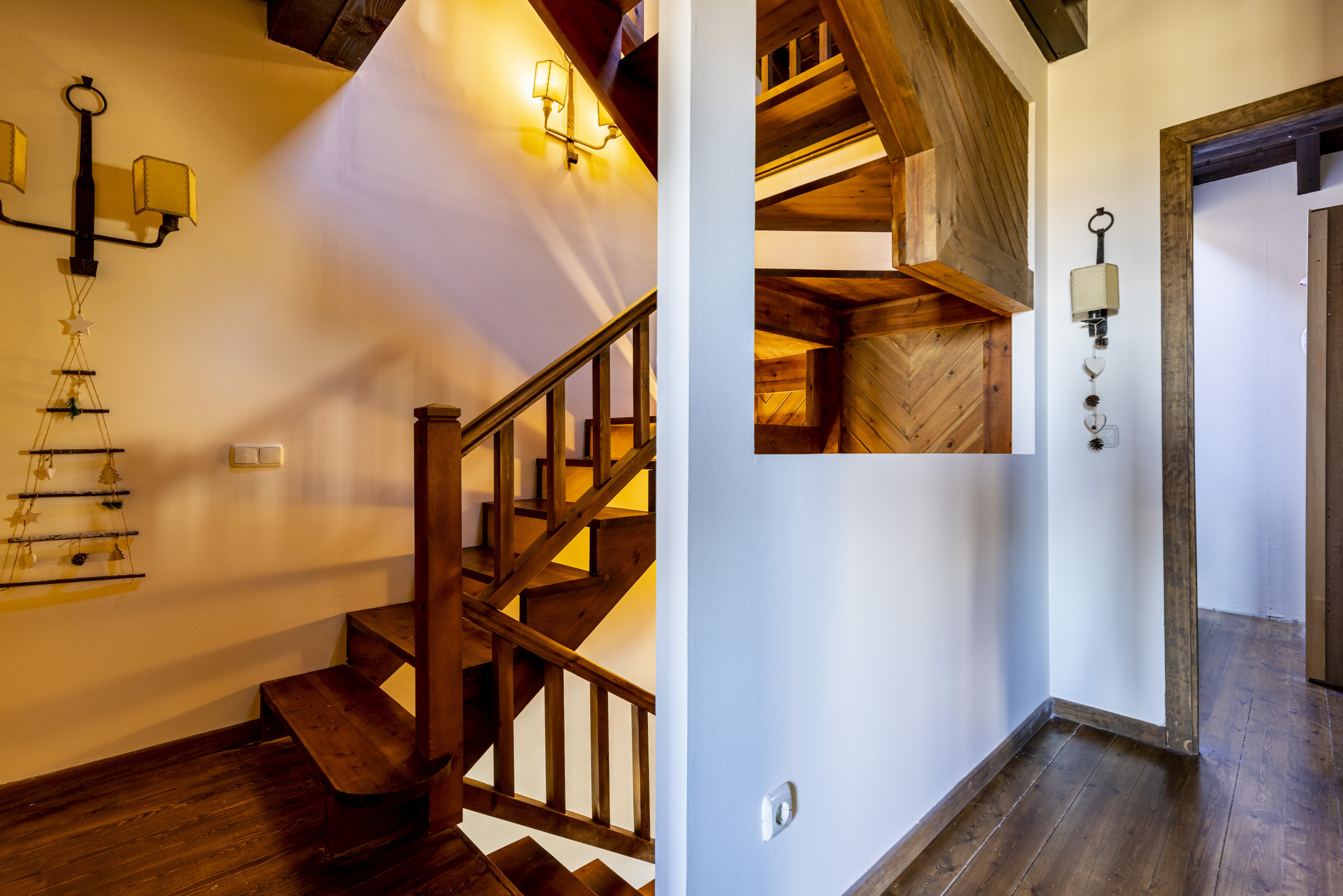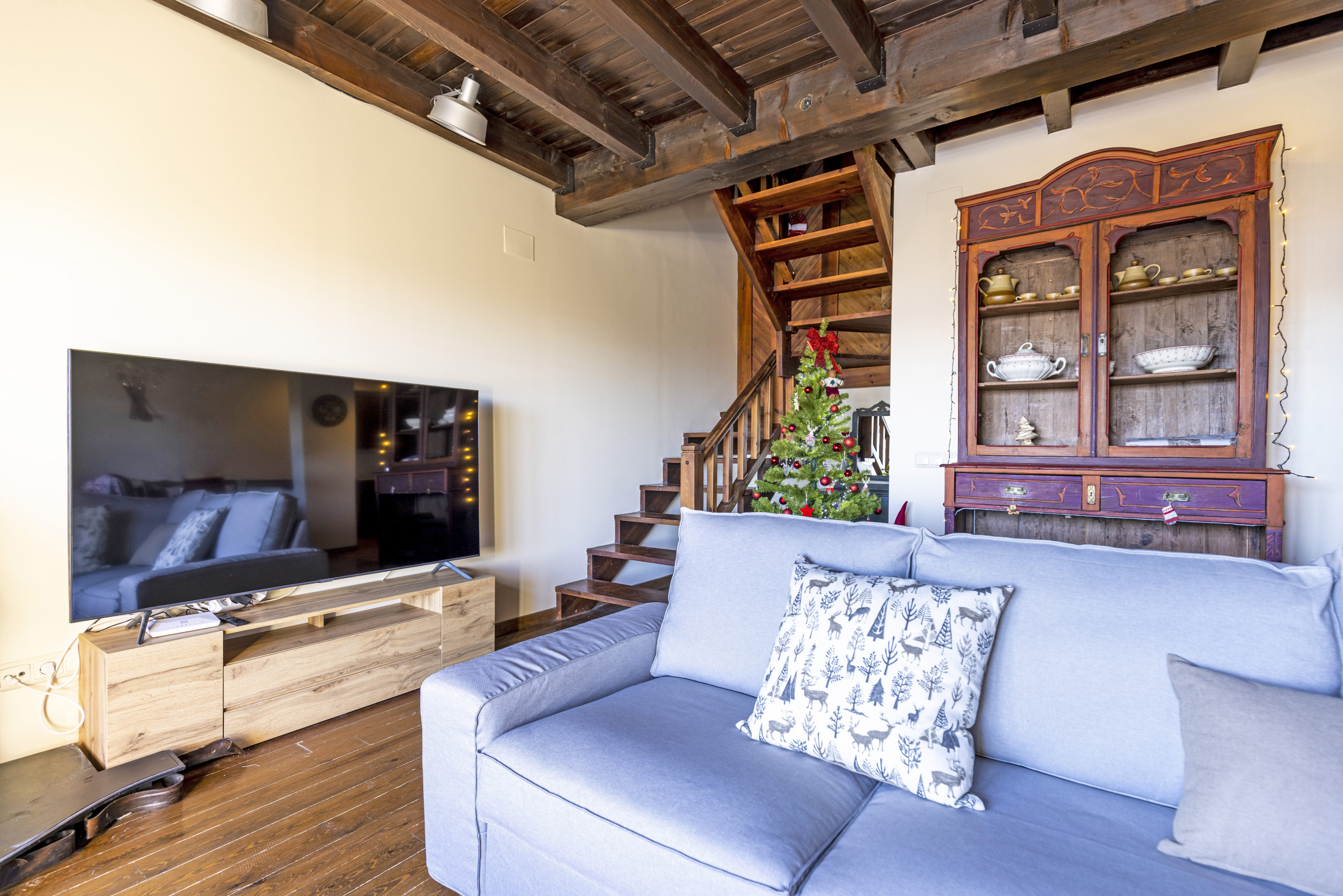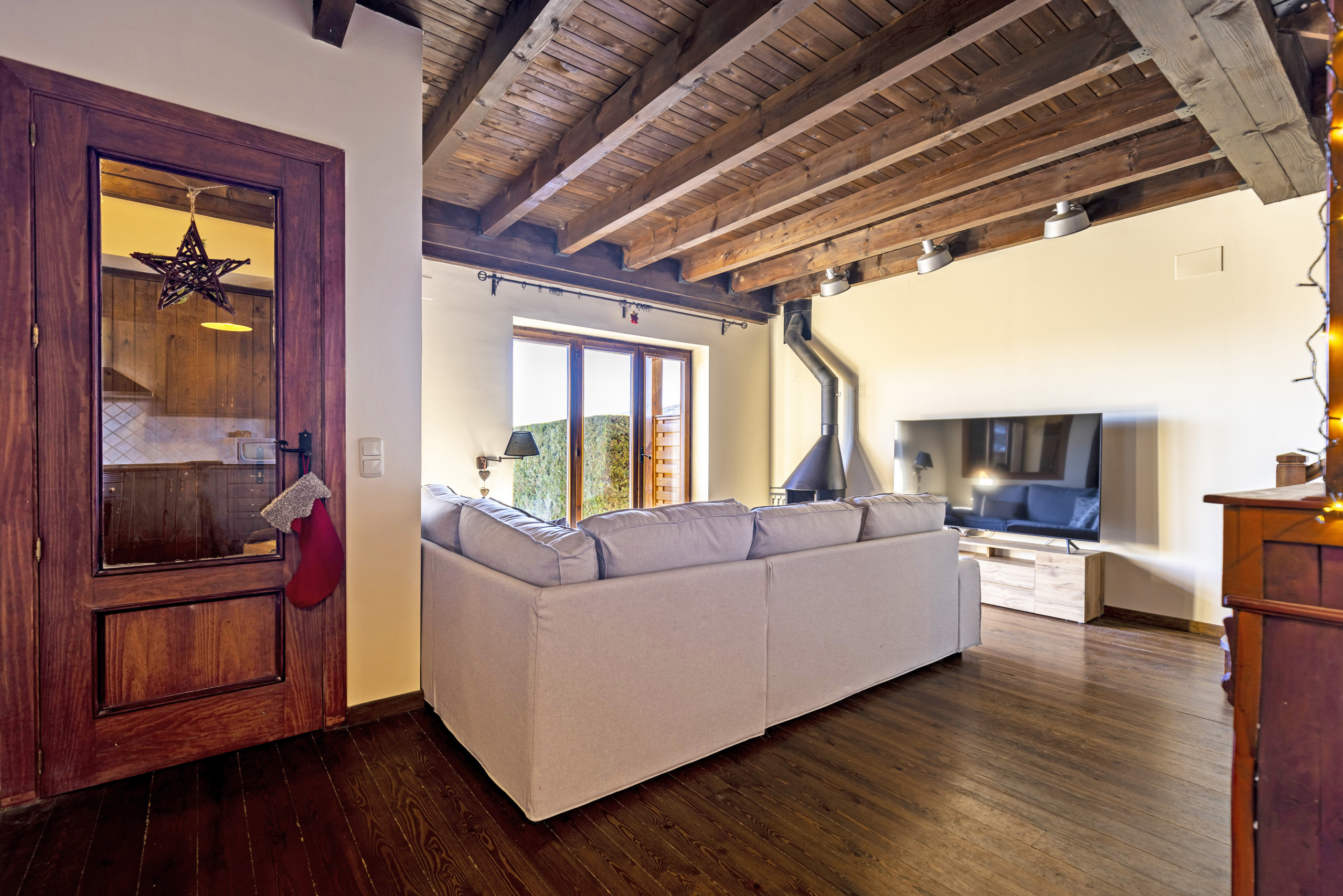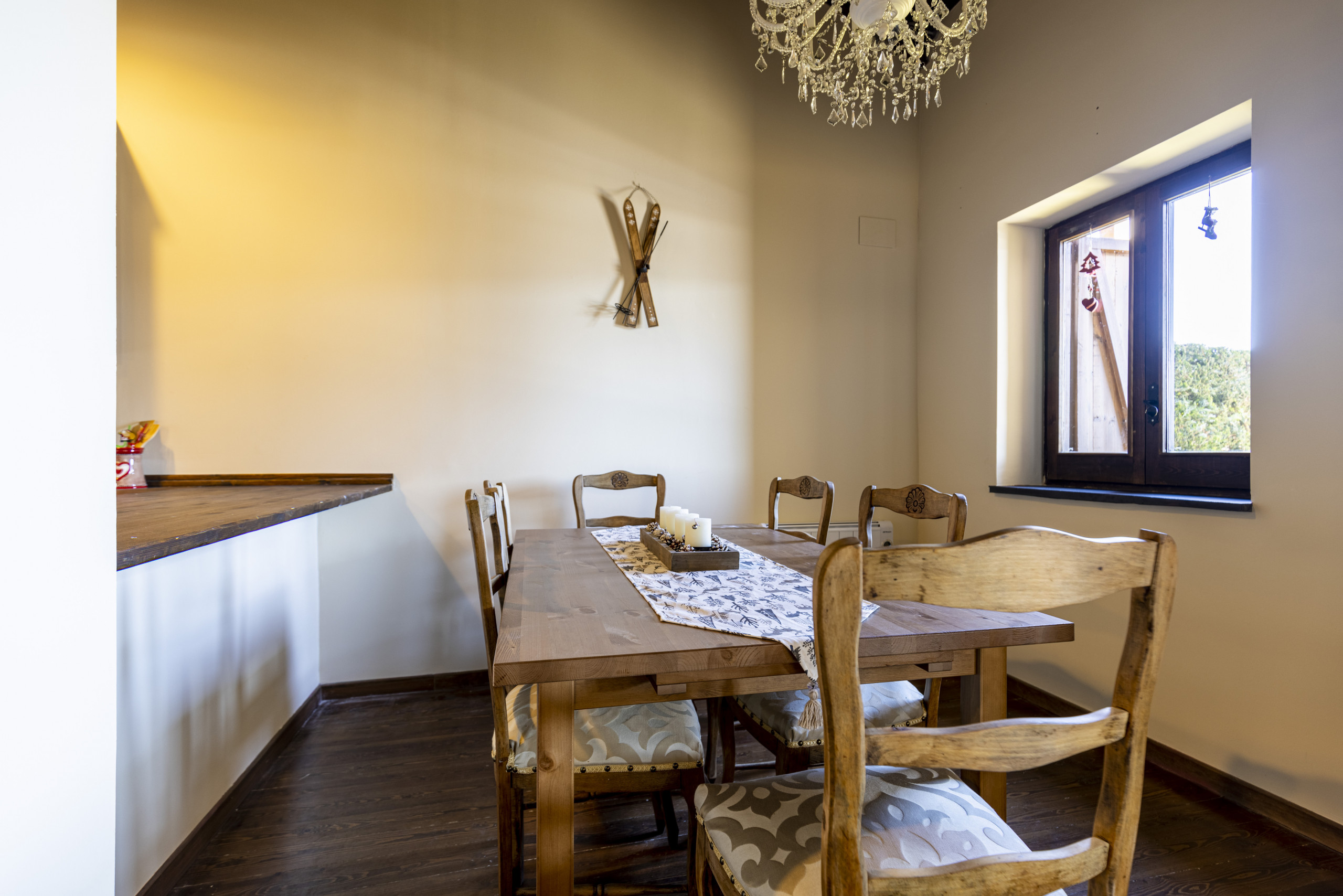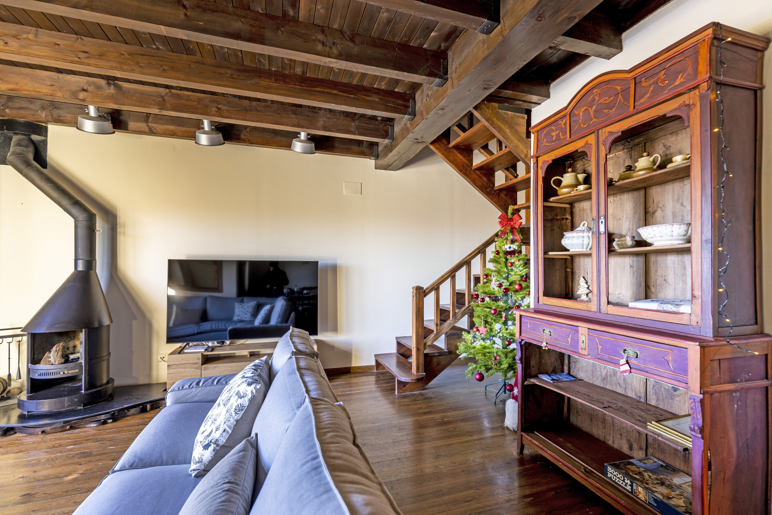 On the ground floor is the living/dining room with an open-plan kitchen. A large sofa with wonderful and spacious views to enjoy in front of the fire. The kitchen is fully equipped and, being an open kitchen, it is very pleasant to cook and enjoy in a group or with the family.