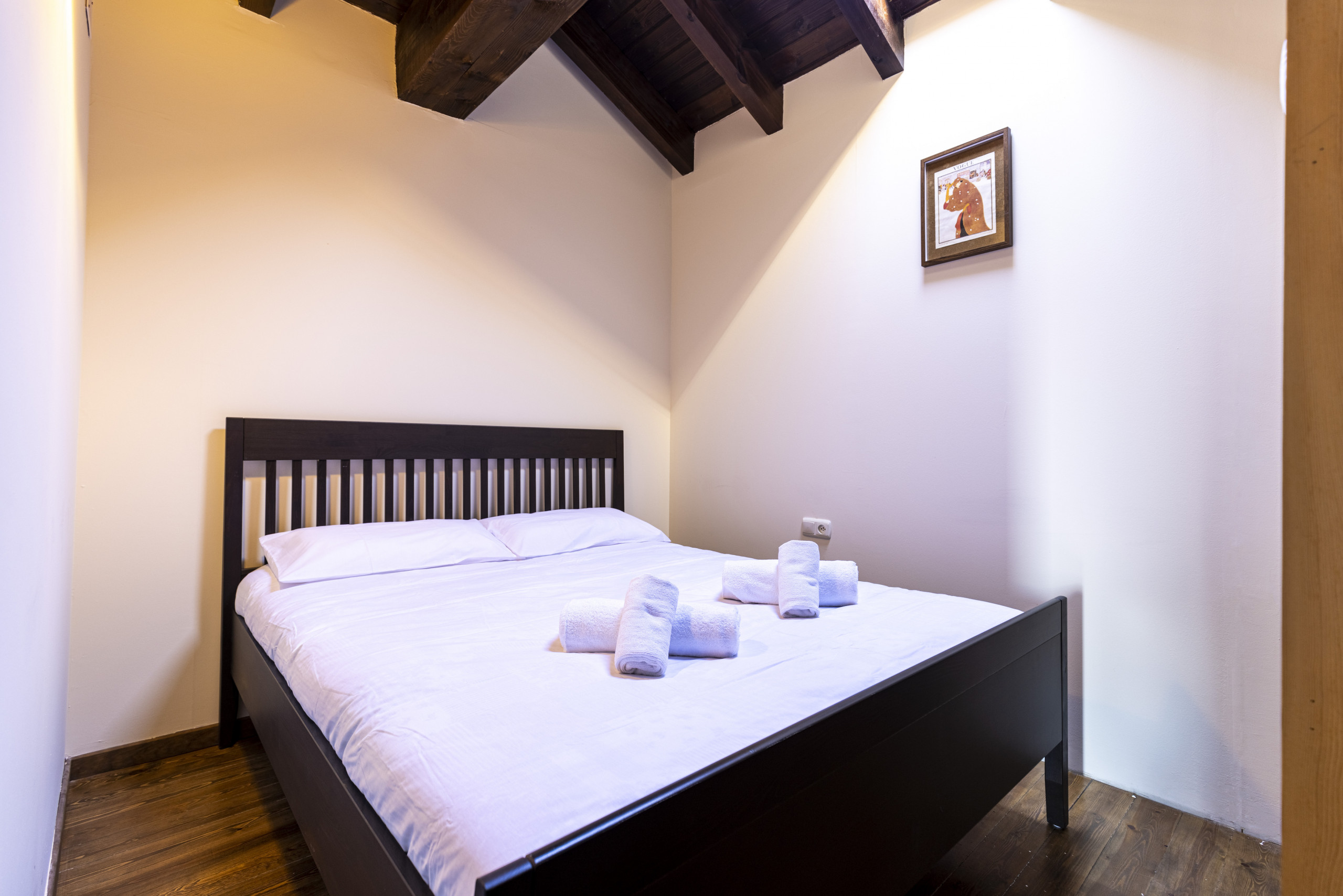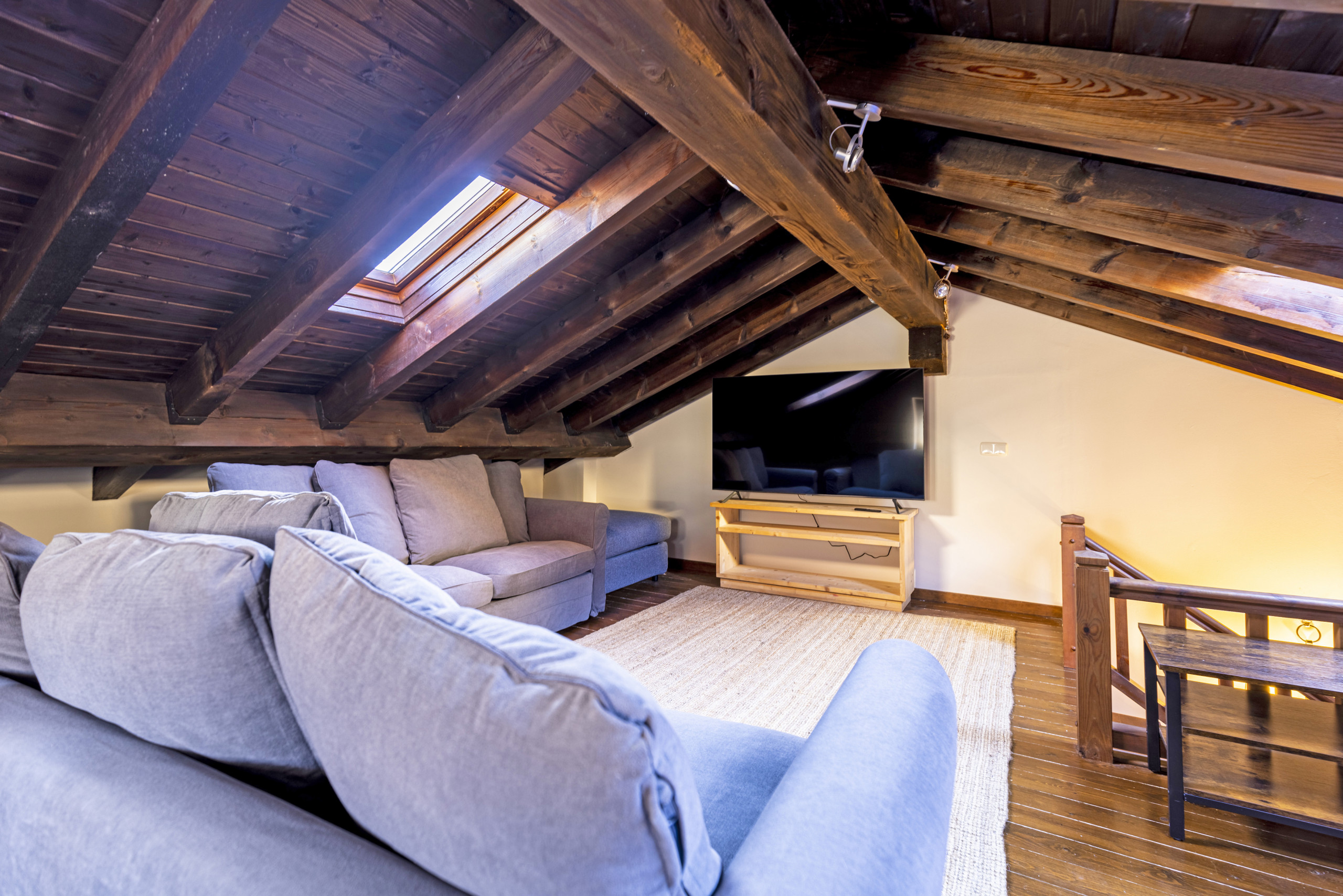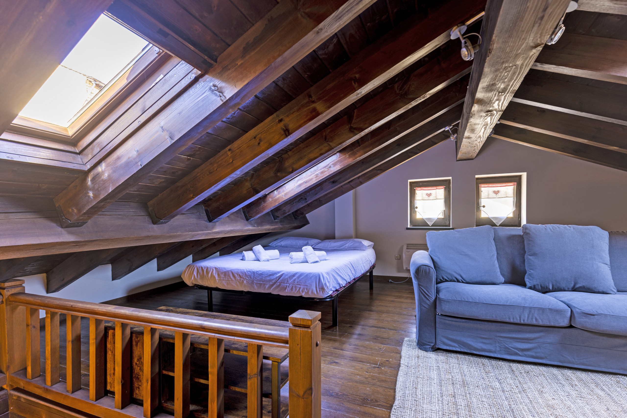 On the top floor is the attic where there is a bedroom space with a double bed and another living room with all the amenities.