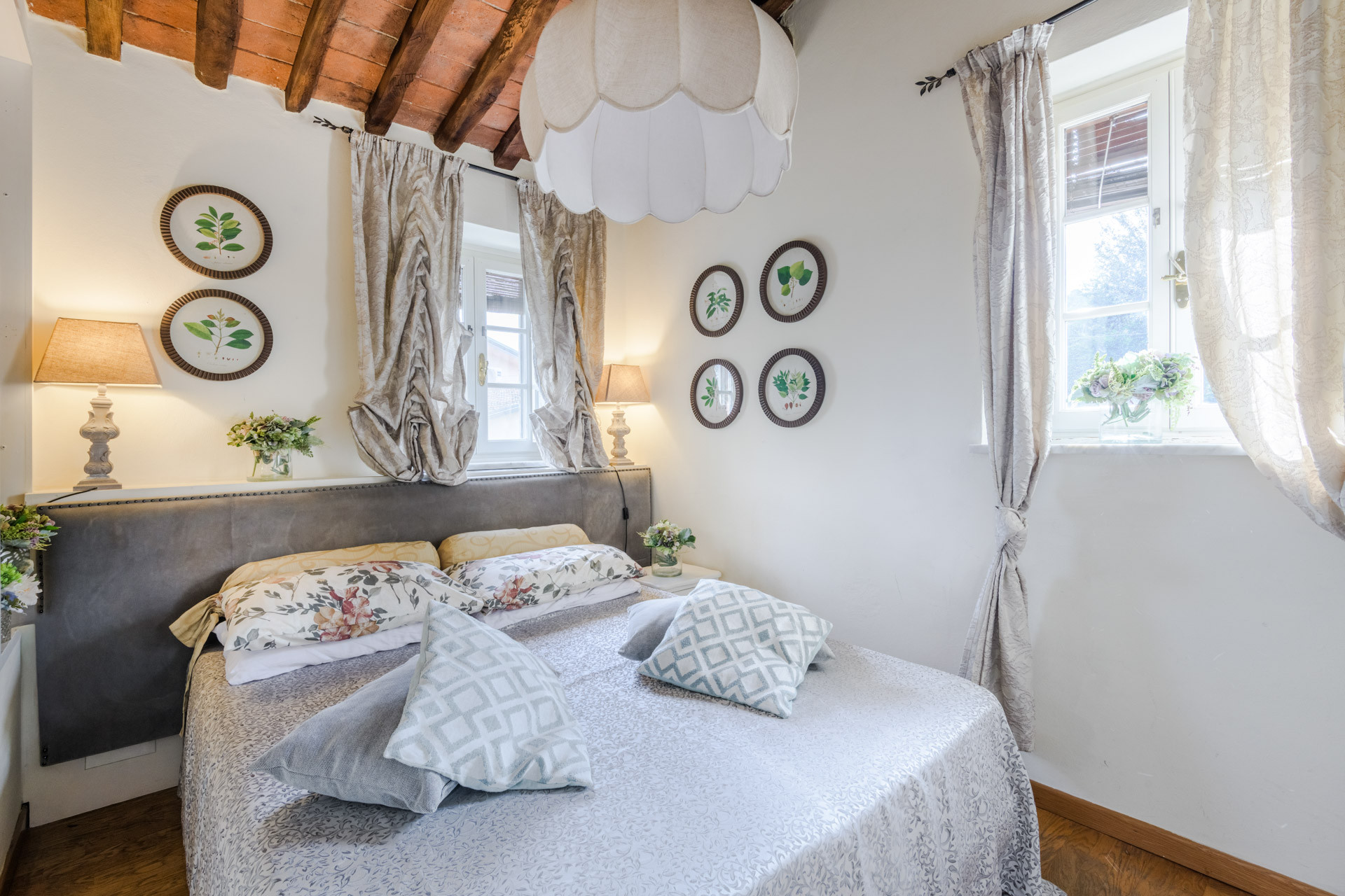 The gate in the antique stone low wall that encloses the little estate leads you to this two-bedroom farmhouse, immersed in a hillside with views among the greenery of the area around Lucca. The house is equipped with air conditioning in the bedrooms on the first floor.