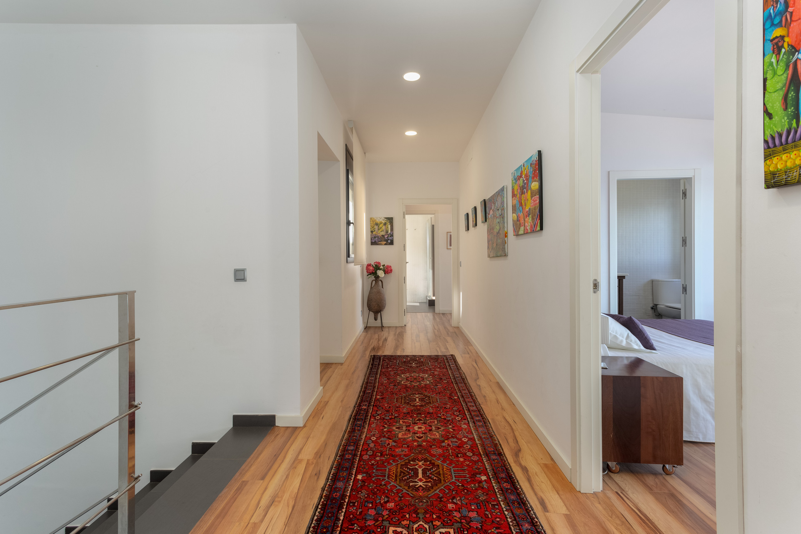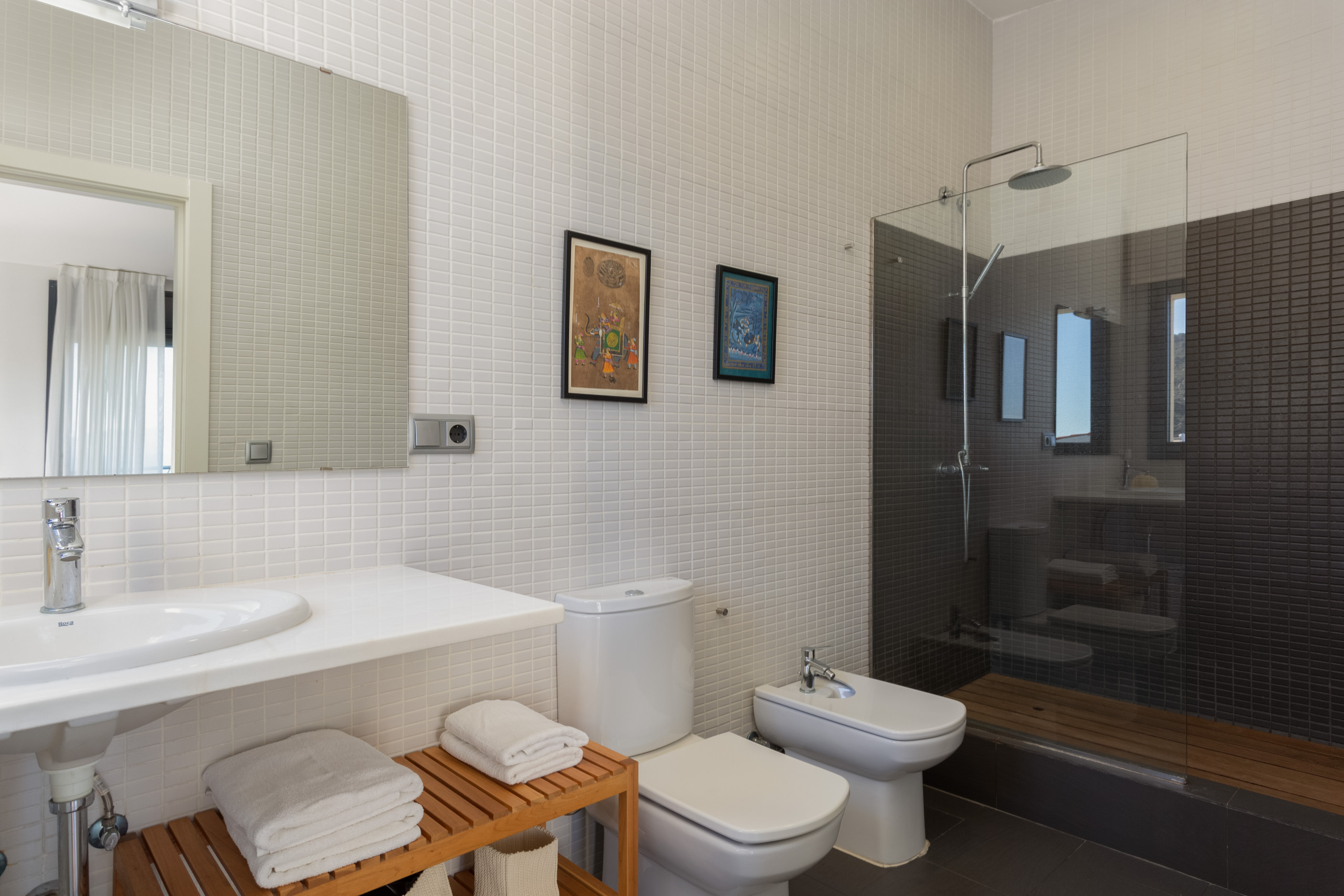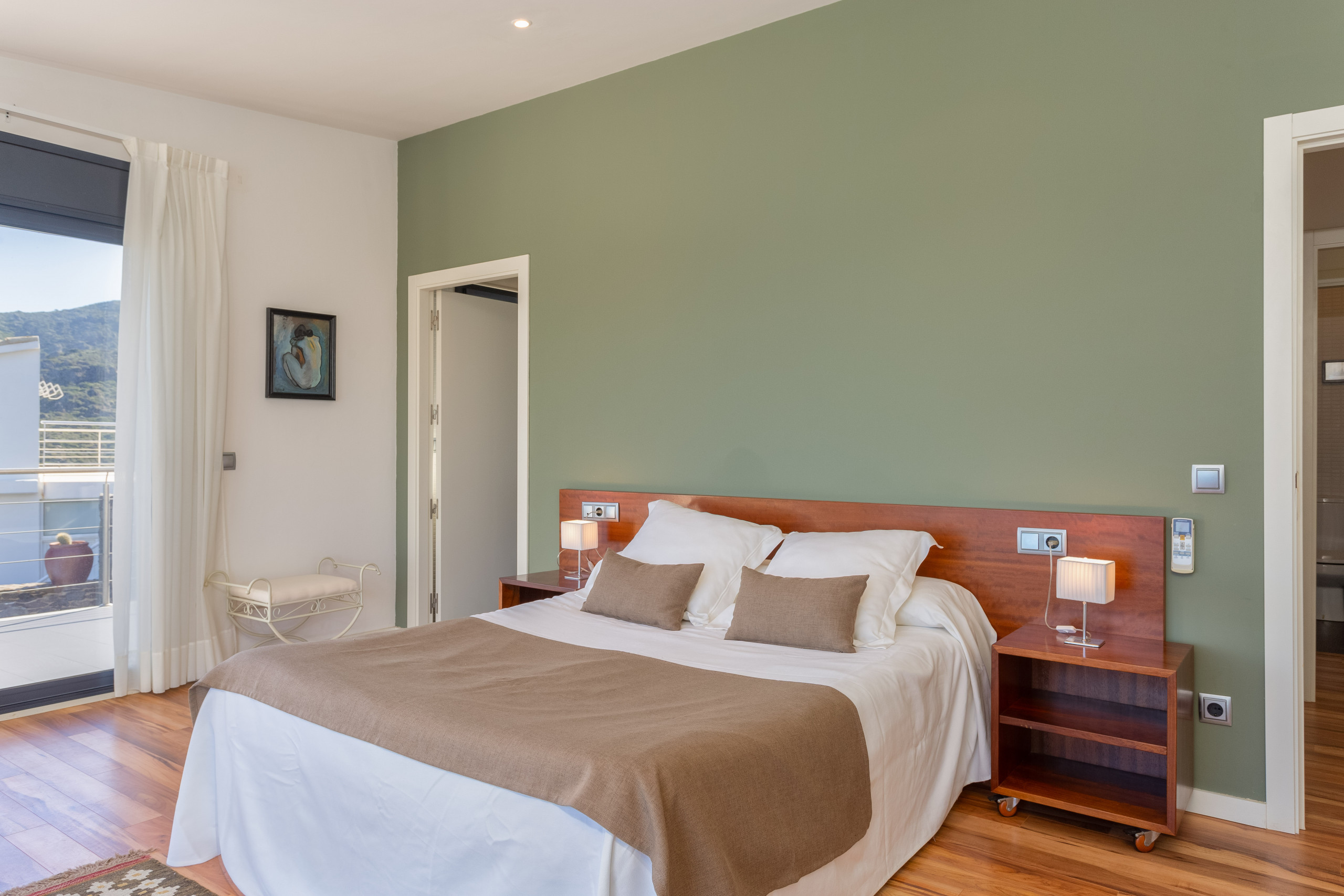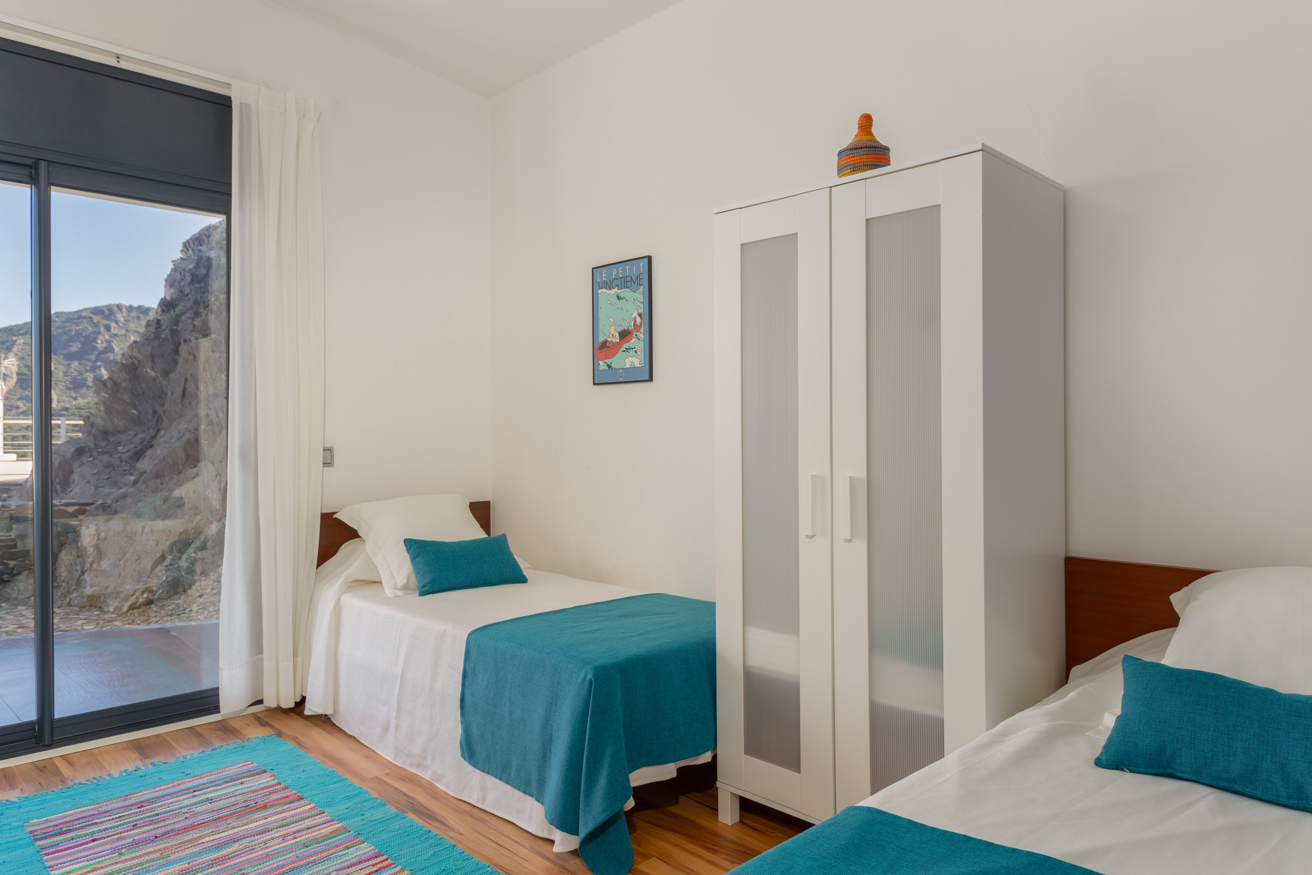 On the upper floor we find the 4 double rooms, 3 of them practically "hanging over the sea". The 4 bedrooms have their own full bathroom en suite, 3 of them with a double bed and one with two beds. All of them have direct access to the upper floor terrace that also communicates with the lower terrace where the pool is located.
