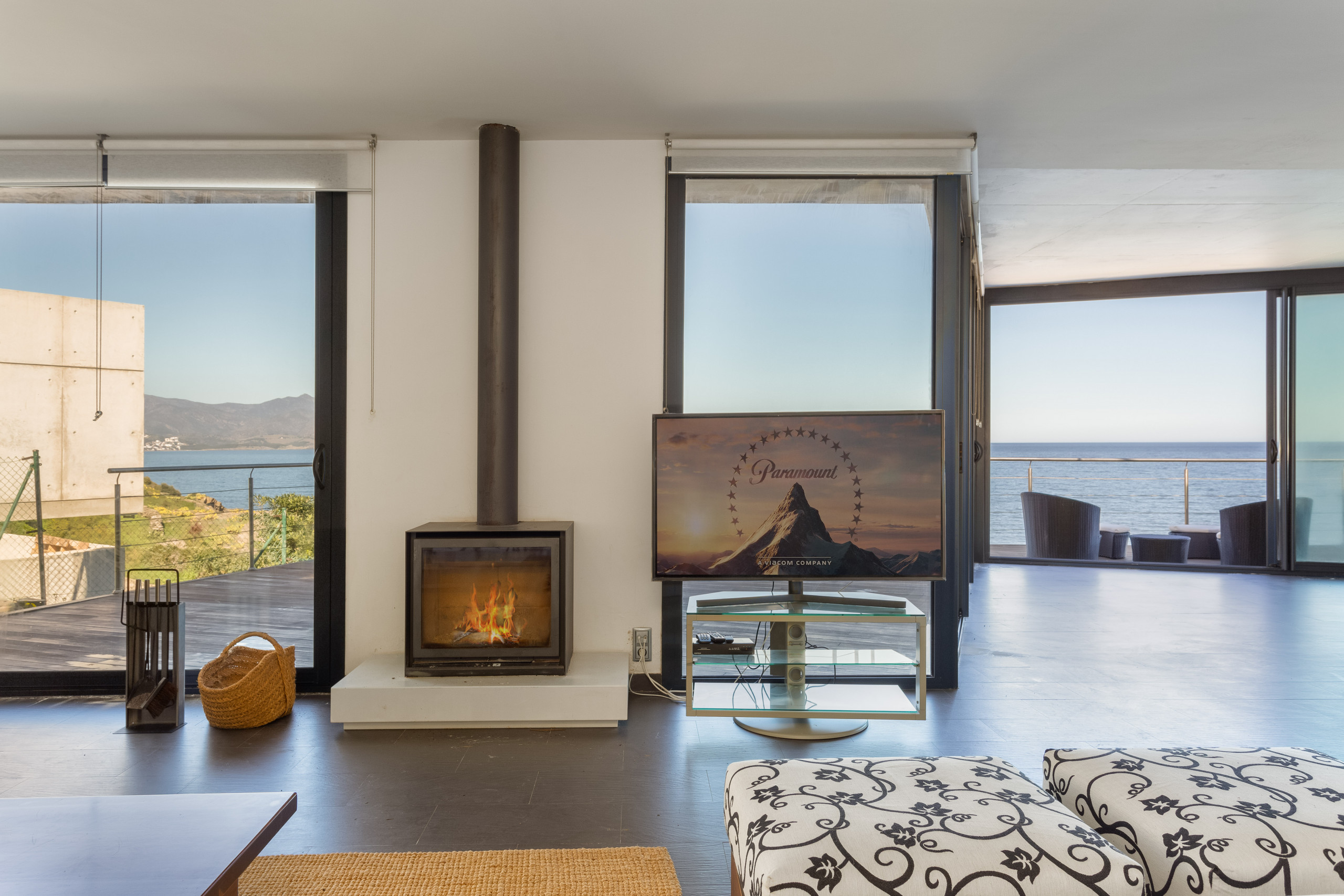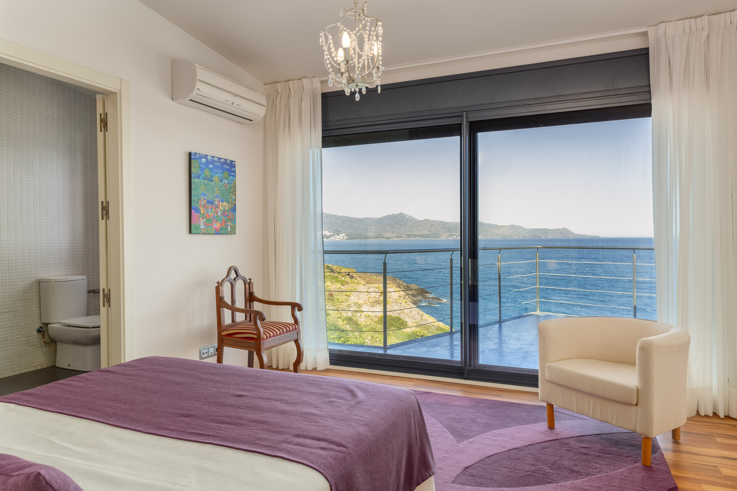Beautiful house distributed on two floors connected by elevator from the garage. On the main floor we are welcomed by an impressive living room with a complete open kitchen and glass walls with only the sea as a wonderful view. Large sofa, fireplace, table for all guests and everything you need to comfortably enjoy the stay. The windows give direct access to the outside area, a cozy terrace with views, provided with two dining spaces, one more secluded, ideal for breakfast and another with a large table for several diners that calls us to share pleasant dinners with magnificent sunsets. A spectacular swimming pool with sun loungers and a sofa area.