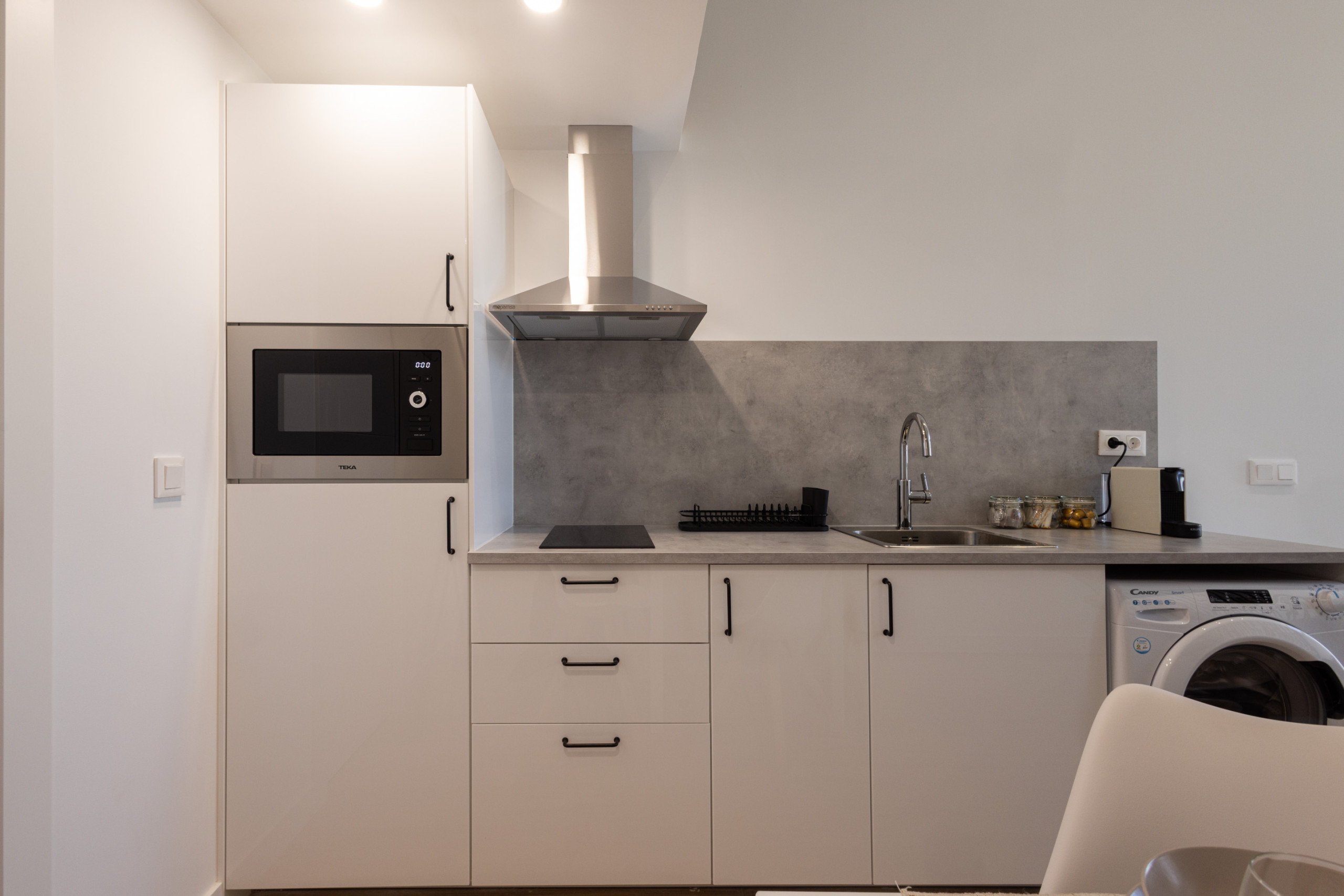 Кухня, совмещенная с залом, оснащена индукционной плитой, оборудовано холодильник, микроволновая печь, морозильная камера, столовые приборы, кухонная утварь, кофеварка, тостер, Чайник и Соковыжималка.