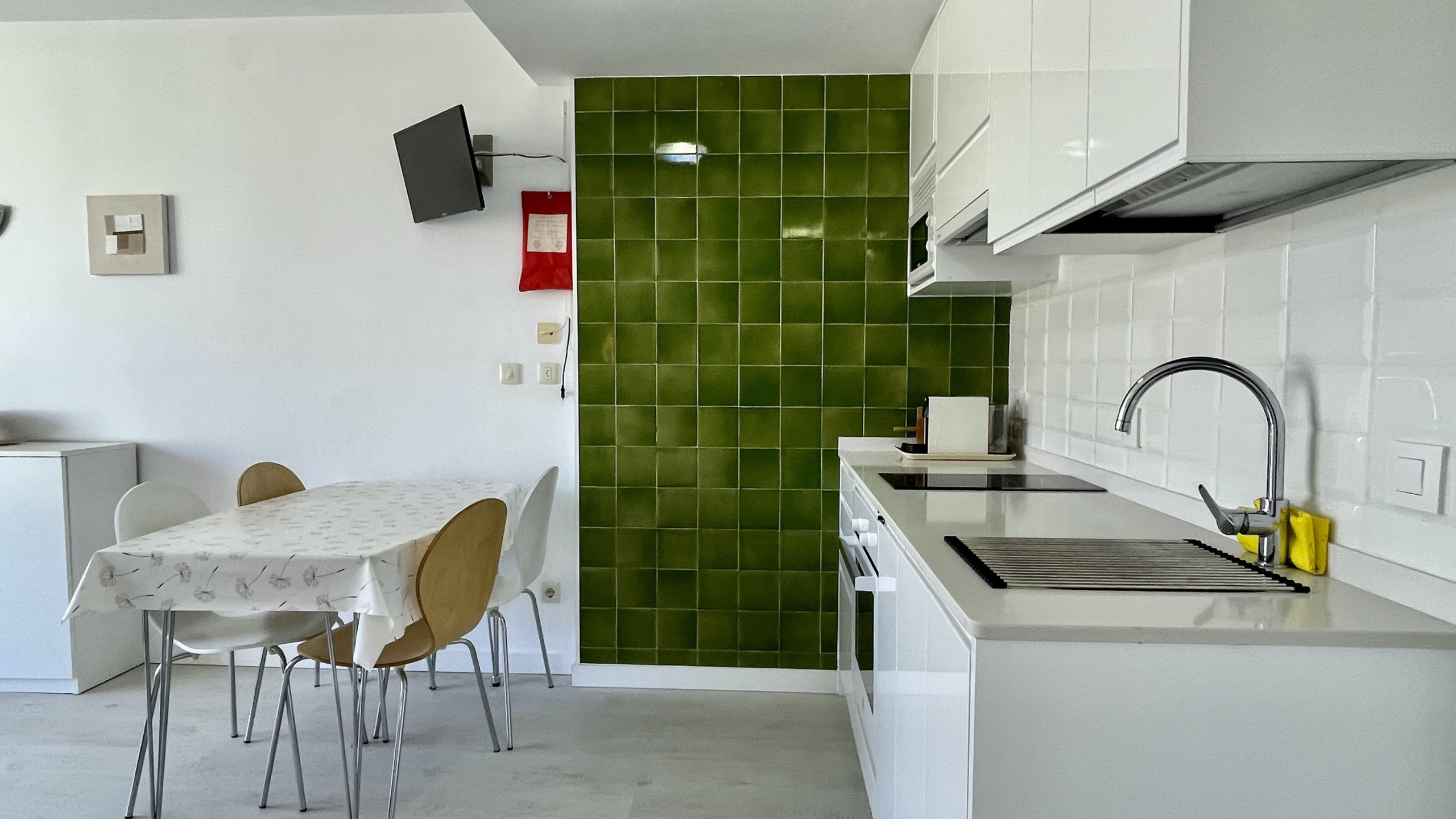 Den/det Öppet kök, av vitroceramic, är utrustat med kyl, mikrovågsugn, ugn, frys, tallrikar/bestick, köksredskap, kaffemaskin och brödrost