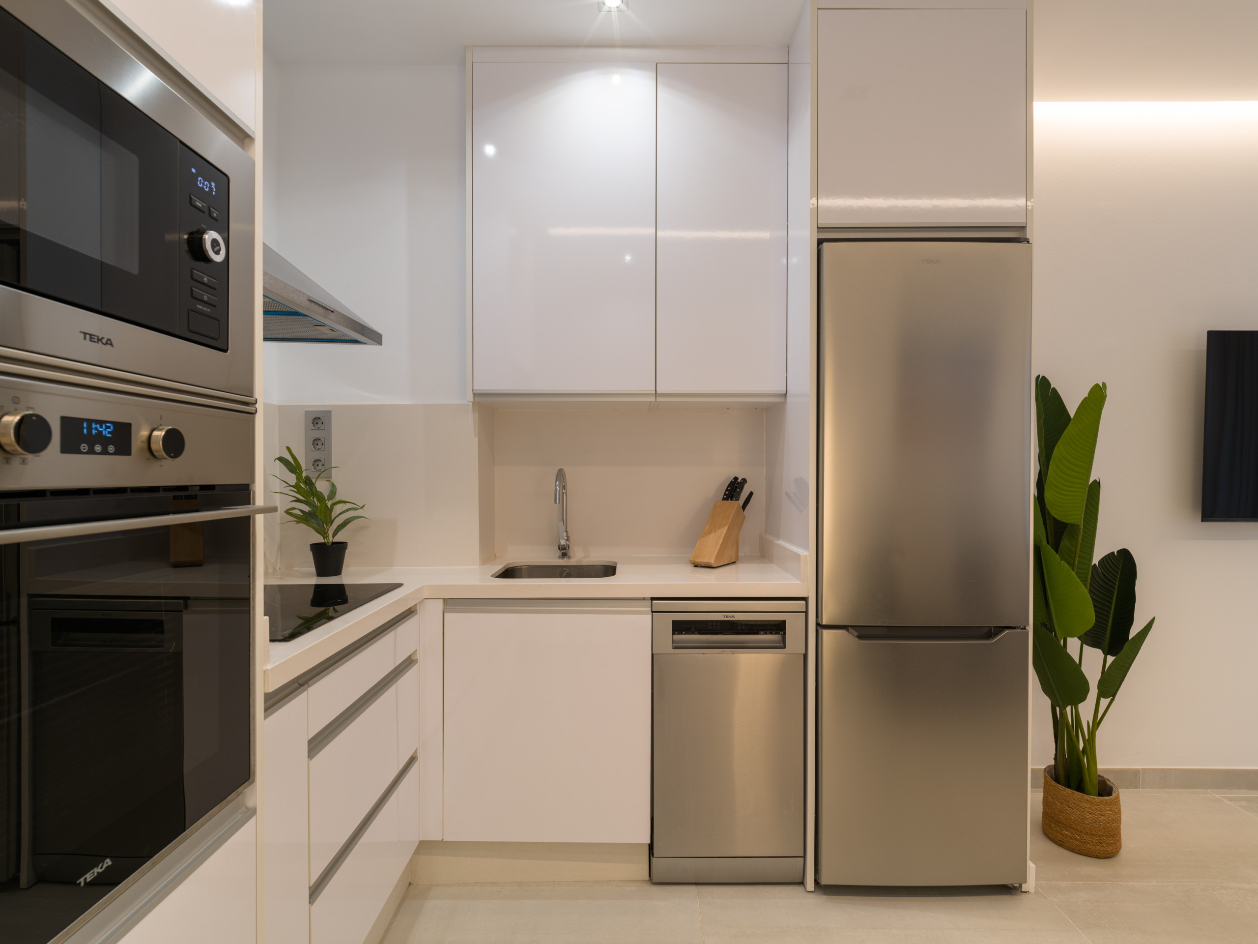 该 开放式厨房的 玻璃陶瓷 厨房, 配备有 冰箱, 微波炉, 烤箱, 冰柜, 洗碗机, 碗碟/刀具, 餐具/厨房, 咖啡壶, 面包机, 烧水壶, 厨具, 盘子和碗.