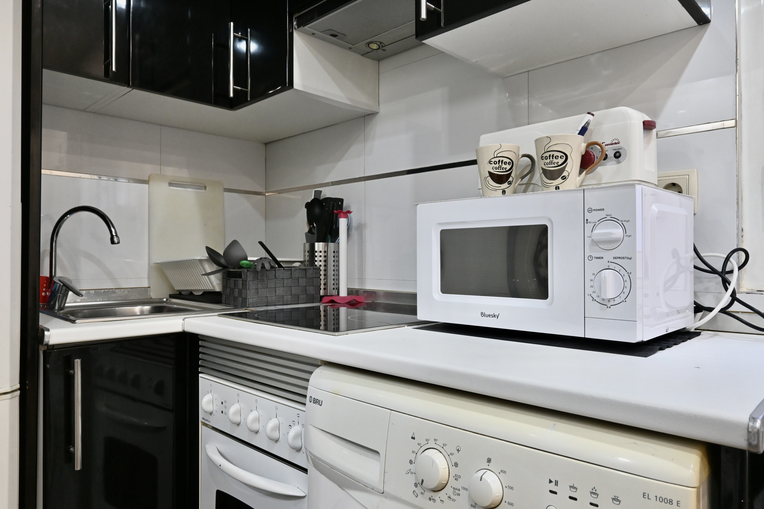该 开放式厨房的 玻璃陶瓷 厨房, 配备有 冰箱, 微波炉, 烤箱, 冰柜, 碗碟/刀具, 餐具/厨房, 咖啡壶, 煎锅, 面包机, 烧水壶 和 榨汁机.